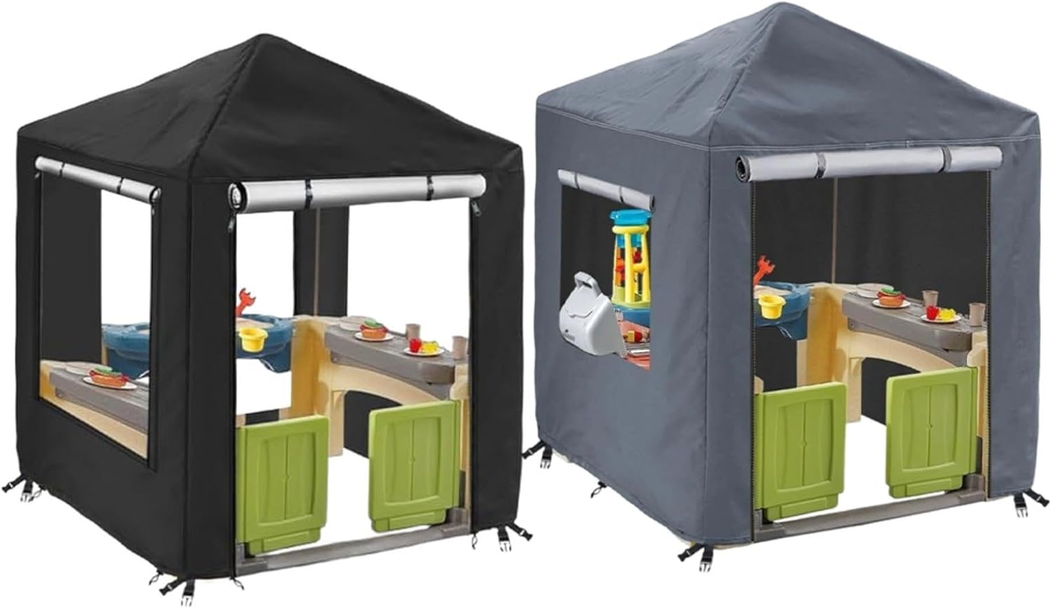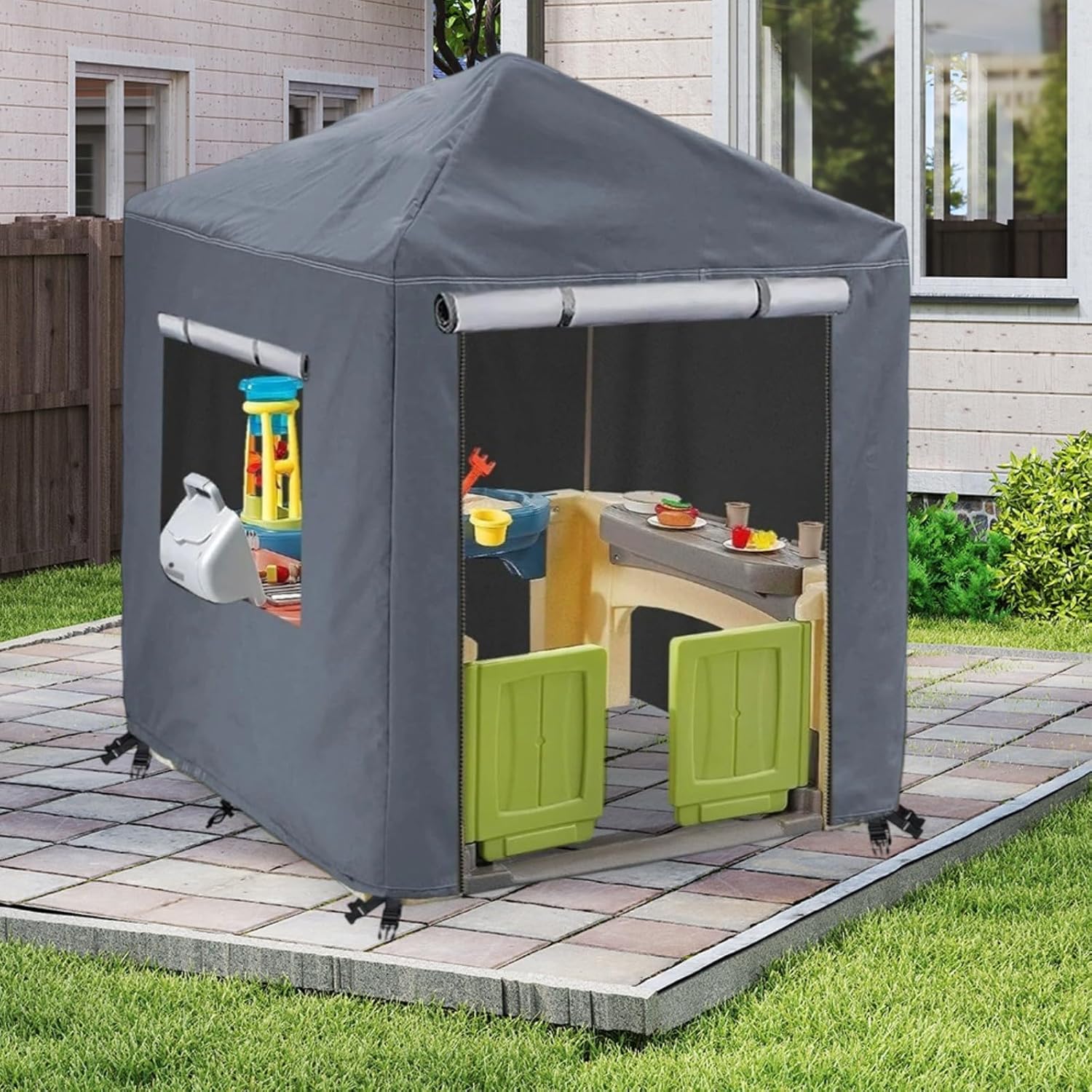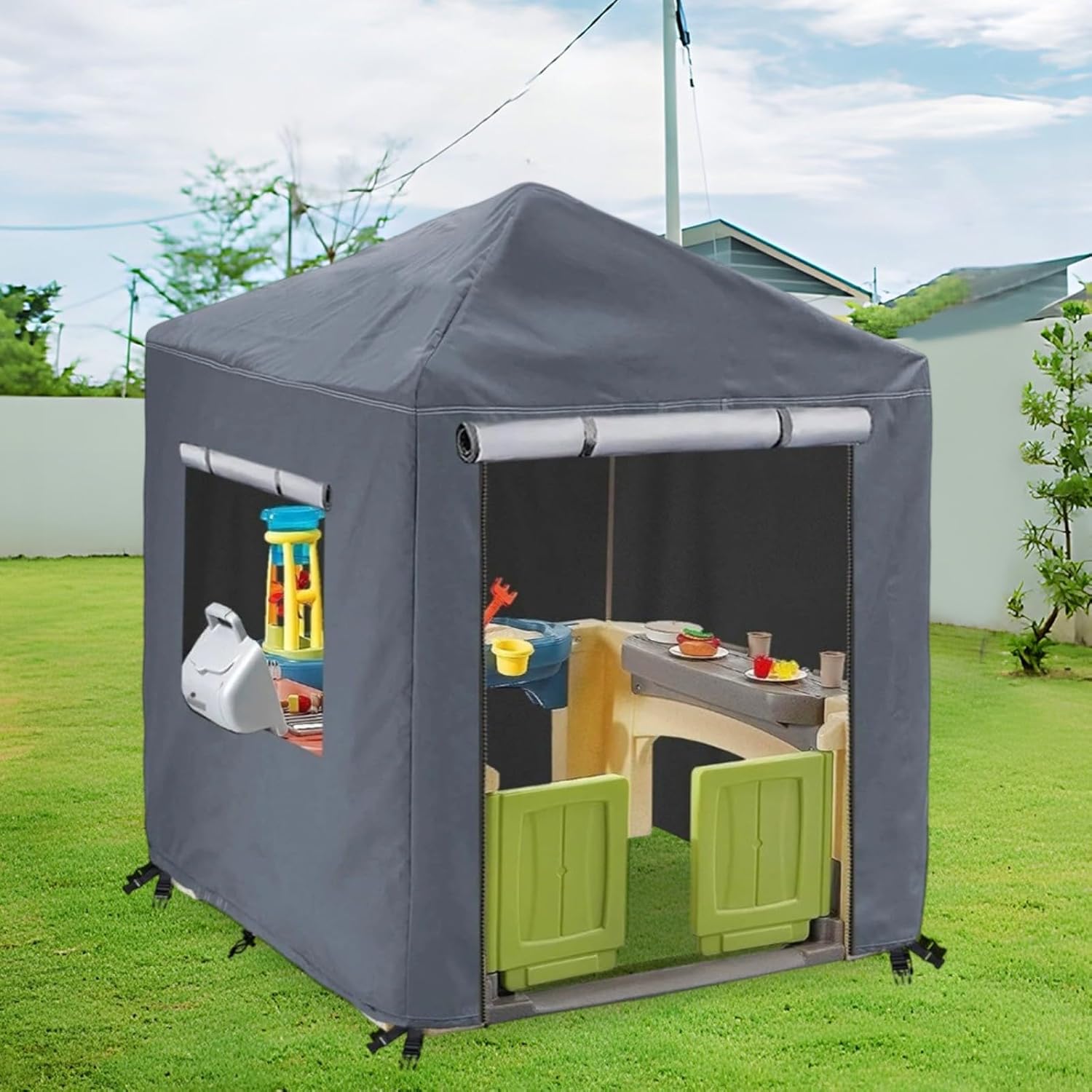 Protezione dalle intemperie: realizzata in resistente tessuto Oxford 210D con rivestimento in PU impermeabile, protegge efficacemente da pioggia e usura, la casetta per bambini resiste agli agenti atmosferici. Comodo accesso: con due robuste cerniere impermeabili nella parte anteriore, accedere alla casetta è un gioco da ragazzi. Aprire la cerniera e arrotolare la copertura per consentire alla luce e all'aria di attraversare le finestre su tre lati. Vestibilità sicura: la copertura è dotata di quattro bottoni a pressione e due corde elastiche sull'orlo per mantenerla saldamente in posizione in condizioni di vento, proteggendo il tuo investimento da cambiamenti meteorologici imprevisti. [Esperienza di gioco migliorata] Progettata per mantenere la ventilazione e la luminosità, questa copertura arricchisce le avventure all'aria aperta del bambino, rendendo il loro tempo di gioco sicuro e piacevole.