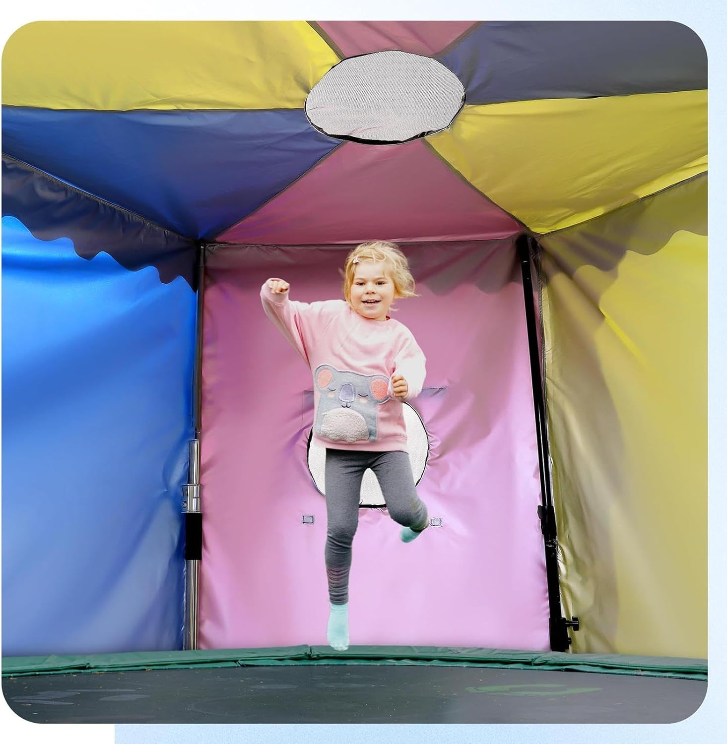 Circolazione dell'aria ottimizzata: la rete ad alta densità favorisce lo scambio d'aria fornendo protezione UV. Garantisce un'esperienza di tenda con trampolino fresca e confortevole con freschezza duratura all'interno per un uso duraturo. Qualità del materiale durevole: il tessuto Oxford ad alta resistenza aumenta la resistenza allo strappo, resiste agli agenti atmosferici e garantisce stabilità e durata per un uso a lungo termine in vari ambienti. Protezione totale: l'alloggiamento resistente alle intemperie tiene lontani gli influssi ambientali come particelle di sporco e pioggia, mantiene un'area di gioco pulita e sicura anche in condizioni meteorologiche variabili. Soluzione di trasporto senza sforzo: grazie alle chiusure a sgancio rapido, questa tenda per trampolino si piega in modo compatto e piatto. Un facile trasporto e uno stoccaggio salvaspazio sono possibili senza strumenti complicati. Facile da usare: questa tenda per trampolino è realizzata con materiali avanzati che impediscono la penetrazione dell'acqua, mantengono le superfici asciutte e bloccano il 99% dei raggi UV, prolungando efficacemente la durata del trampolino.
