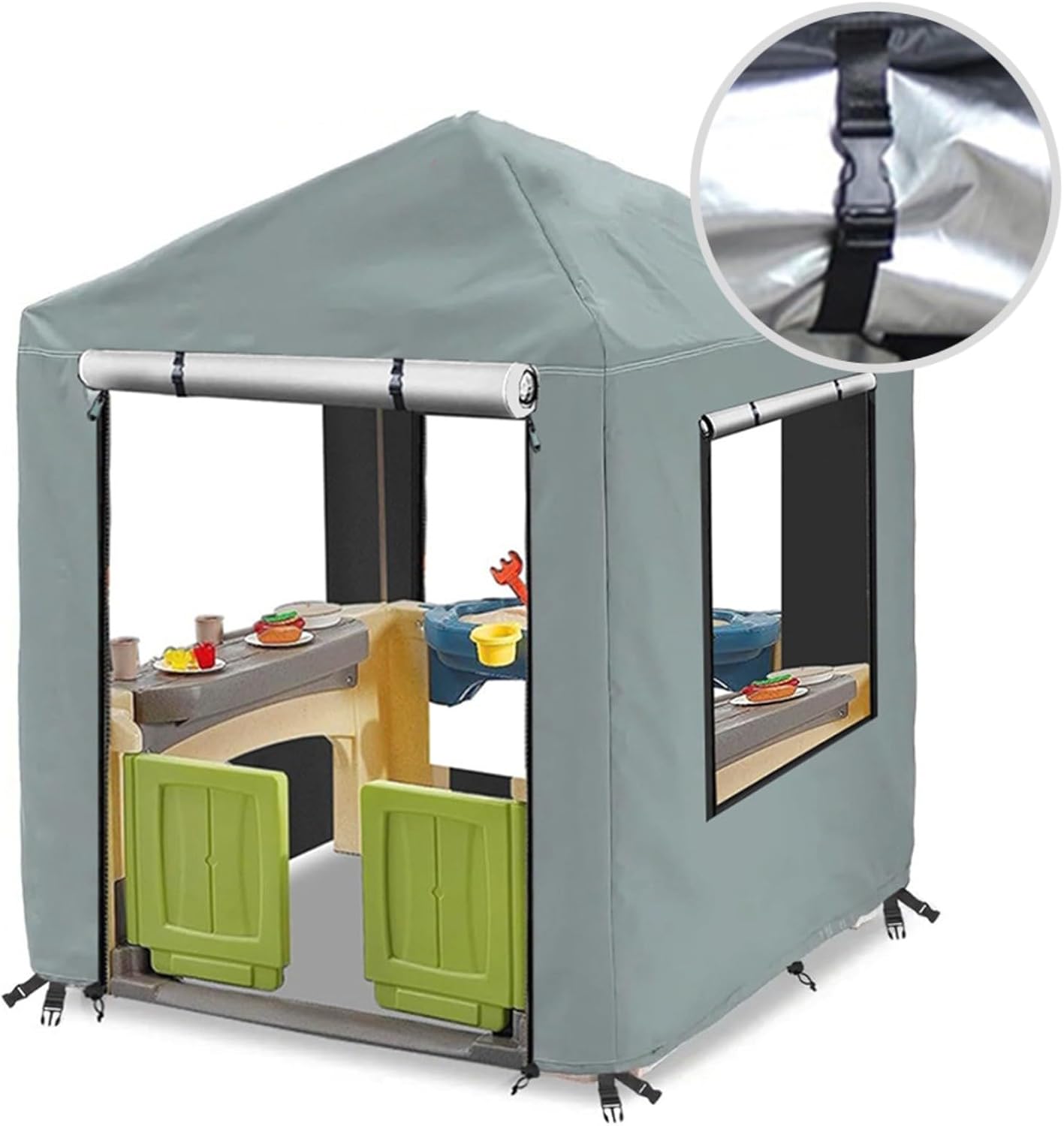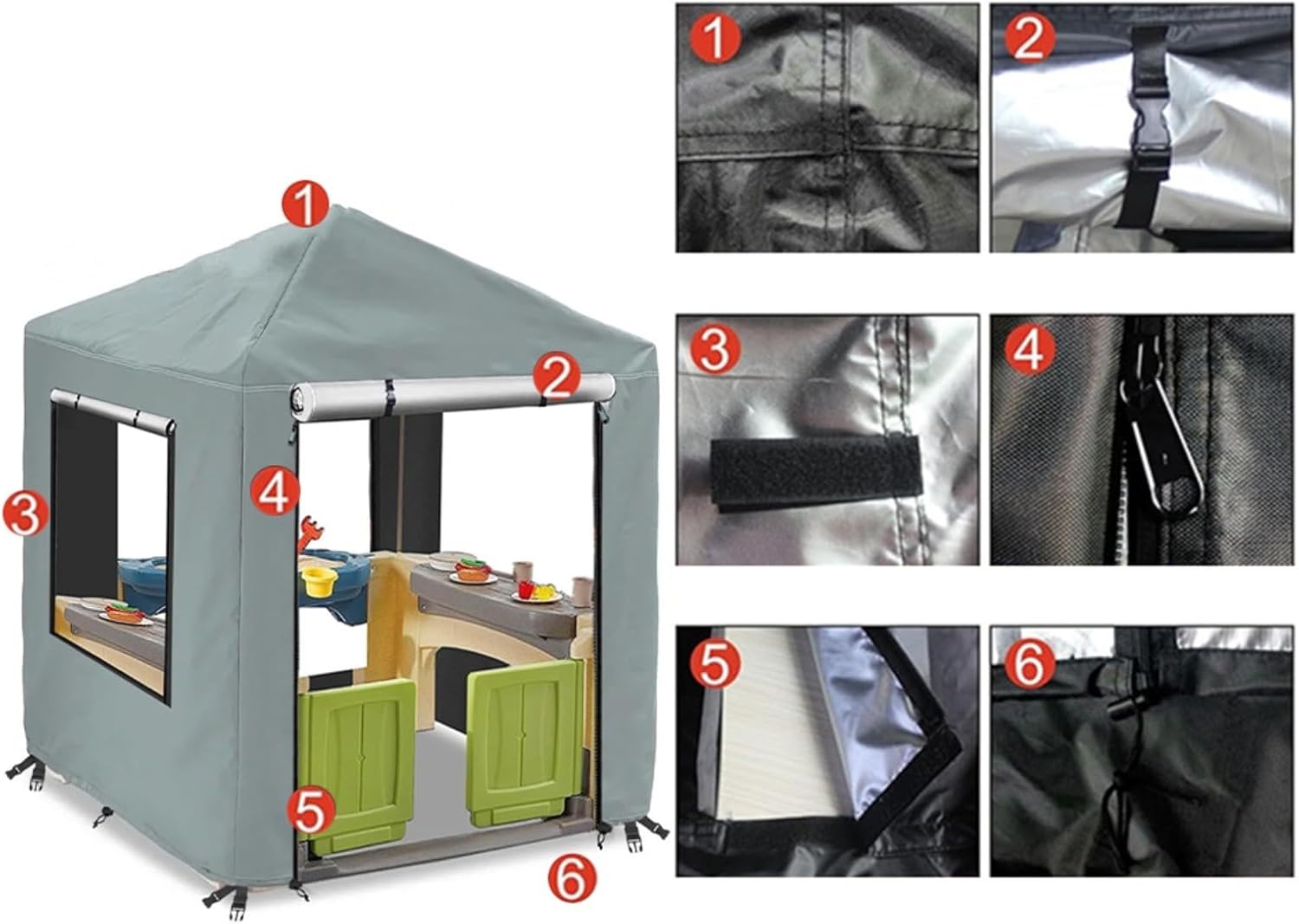 Copertura resistente alle intemperie: realizzata in tessuto Oxford 420D con rivestimento impermeabile in PU, questa copertura è resistente agli strappi e ai raggi UV, la tua casetta rimane al sicuro dalle condizioni atmosferiche avverse e mantiene il suo aspetto fresco più a lungo. Dimensioni generose: misura 142,2 cm di larghezza x 142,2 cm di profondità x 5,1 cm di altezza, questa copertura è compatibile con varie marche di casette della stessa dimensione. Assicurati di misurare attentamente la tua casetta per una vestibilità perfetta. Design di facile accesso: dotata di due robuste cerniere sul davanti, questa copertura consente un rapido accesso alla casetta dei giochi. Arrotolare facilmente la parte anteriore mentre i bambini possono ancora divertirsi a giocare attraverso le finestre su tutti e tre i lati senza rimuovere la copertura. Vestibilità sicura antivento: dotata di quattro fibbie e due corde elastiche sul fondo, questa copertura offre una vestibilità aderente che resiste ai forti venti, mantenendo la tua casetta protetta anche in condizioni di tempesta. Protezione di lunga durata: progettata per resistere a vari elementi esterni, questa copertura assicura che la casetta dei bambini rimanga sicura e protetta tutto l'anno, fornendo tranquillità ai genitori.