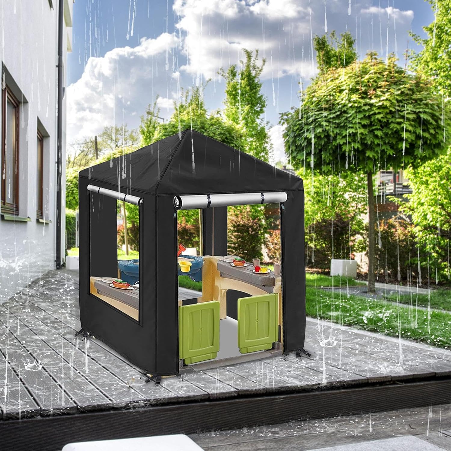 Materiale sicuro: dotata di tessuto Oxford resistente agli strappi e di un rivestimento impermeabile, la nostra copertura Playhouse vanta un materiale di alta qualità che garantisce protezione contro i raggi UV e gli strappi Design stabile: la nostra copertura per casetta da gioco protegge la casetta da gioco all'aperto di tuo figlio dai forti, con fissaggio sicuro e cinghie di fissaggio per la massima stabilità. Non lasciare che il rovini il divertimento Usalo comodamente: apri e chiudi la tua casetta senza sforzo grazie al design laterale della porta avvolgibile di questa copertura e alle due robuste cerniere su tutti e i lati. Goditi una comoda accessibilità al tuo spazio di gioco Conserva facilmente: mantieni in ordine la copertura della tua casetta con una soluzione facile da riporre. Con la comodità di una custodia e la possibilità di ripiegarla, risparmierai spazio senza sacrificare l'accessibilità Ampia gamma di usi: progettata per resistere a condizioni atmosferiche avverse, questa copertura è perfetta per casette da gioco per bambini all'aperto di tutte le dimensioni, fornendo una protezione sicura e perfetta