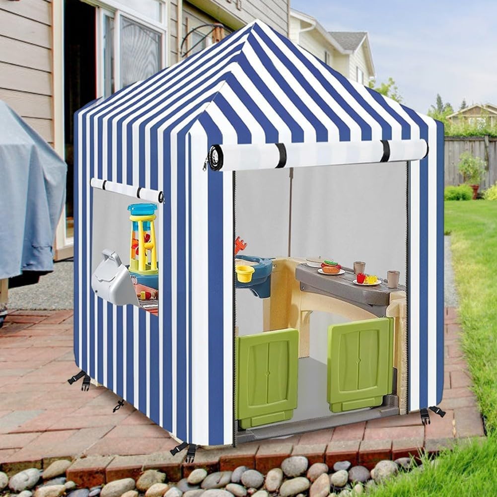 Resistente alle intemperie: realizzata con robusti materiali impermeabili, questa copertura per casetta protegge la casetta dei bambini da pioggia e umidità, un ambiente sicuro tutto l'anno. Protegge dai danni del sole: la copertura previene efficacemente lo sbiadimento e il deterioramento della struttura in legno, mantenendo la sua bellezza e prolungandone l'usabilità durante le stagioni. Installazione facile da usare: progettata per una configurazione senza problemi, questa copertura può essere facilmente indossata o rimossa senza attrezzi, rendendola per genitori impegnati. Vestibilità sicura e aderente: cinghie regolabili e fibbie che la copertura si adatta perfettamente alla casetta dei giochi, fornendo tranquillità contro forti venti e condizioni meteorologiche avverse. Adatto a tutti gli stili di casette da gioco: questa copertura si adatta a varie casette in legno migliorando l'arredamento esterno con il suo design accattivante.
