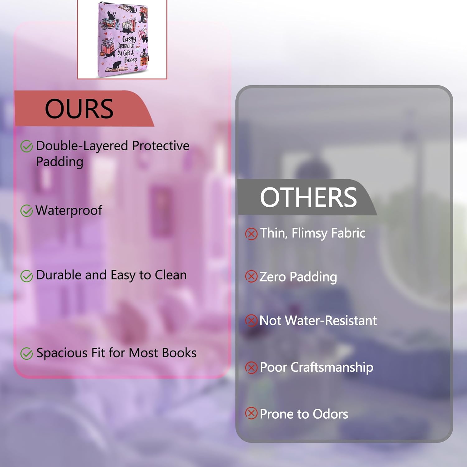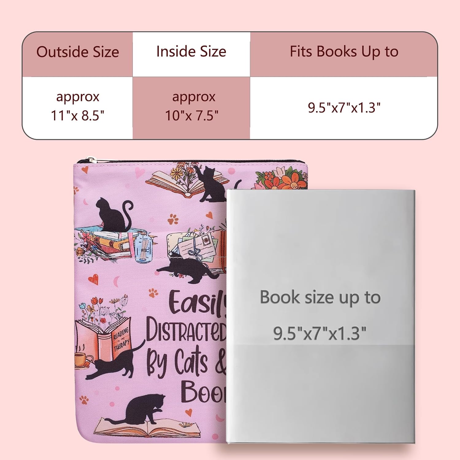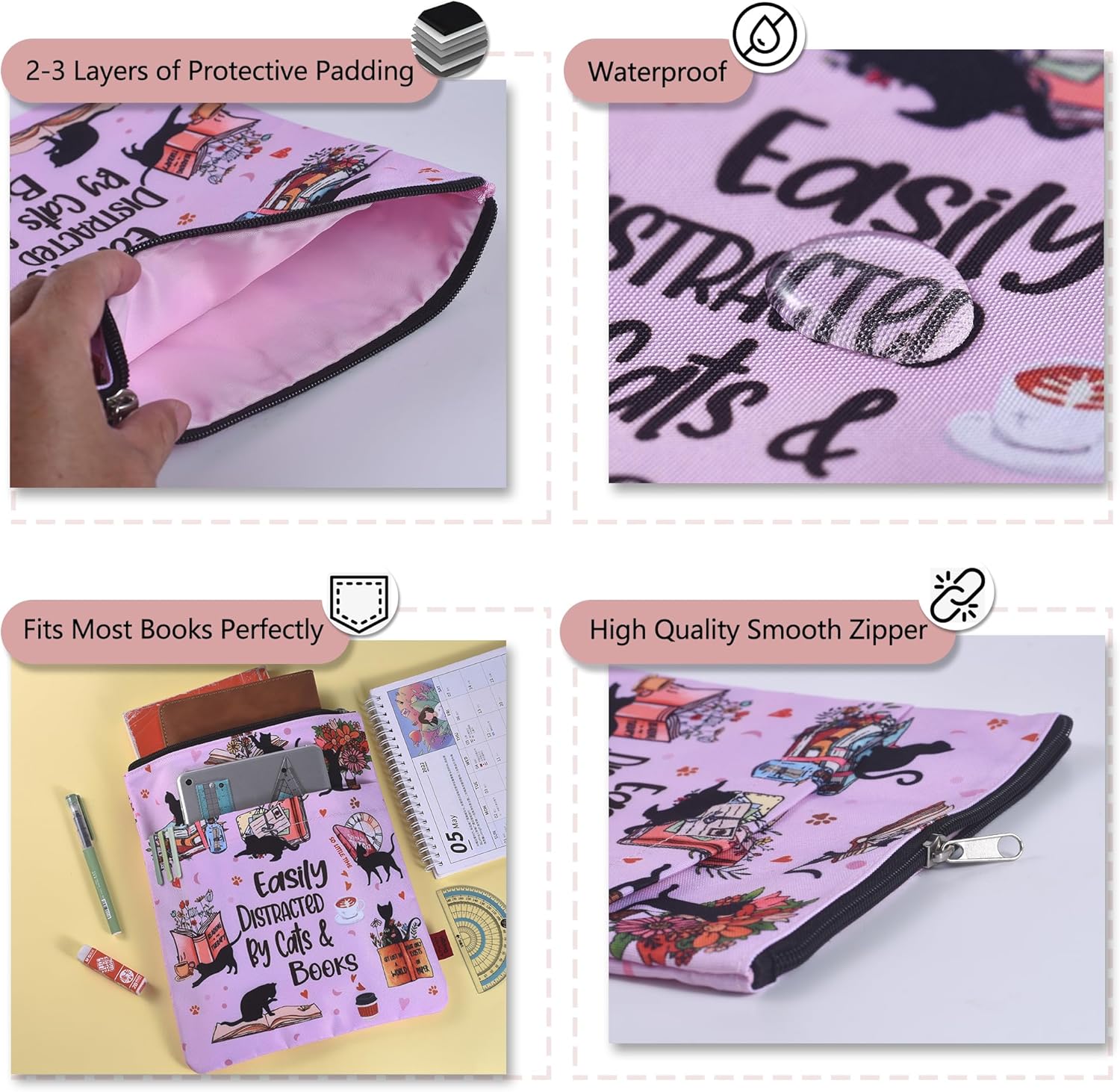 PROTEZIONE ULTIMA CON CERNIERA SICURA: questa custodia impermeabile è dotata di una cerniera liscia che può contenere libri fino a 11 x 8,5 pollici, prevenendo pagine piegate e danni durante il viaggio. Il tessuto in tela premium protegge da schizzi, graffi e usura quotidiana. Si adatta perfettamente alla maggior parte dei formati di libri - Dimensioni esterne: 28 x 21,5 cm, interne 25,5 x 19 cm. Adatto per tascabili standard, tascabili del mercato di massa, con copertina rigida e libri autopubblicati. Misura sempre il tuo libro prima dell'uso. Tessuto lavabile ed ecologico: realizzato in resistente tela di cotone e misto poliestere con interfaccia rinforzata. Lavabile in lavatrice quando sporco, mantiene forma e colore dopo molteplici lavaggi. Nessun odore chimico o materiale scadente. Design adorabile del gatto per gli amanti dei libri - Presenta un'affascinante stampa "Facilmente distratto da gatti e libri" - un regalo premuroso per lettori, membri del club del libro e amanti dei gatti. Scoppi di gioia durante le pause caffè e le sessioni di lettura. REGALO PER GLI AMANTI DEI LIBRI - Ottimo per compleanni, vacanze o semplicemente per fare sorprese per i bibliofili. Istruzioni per la cura incluse per un uso duraturo.