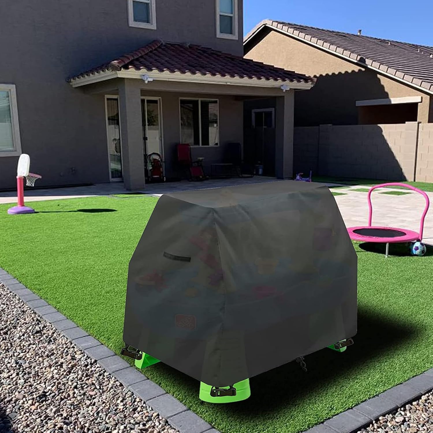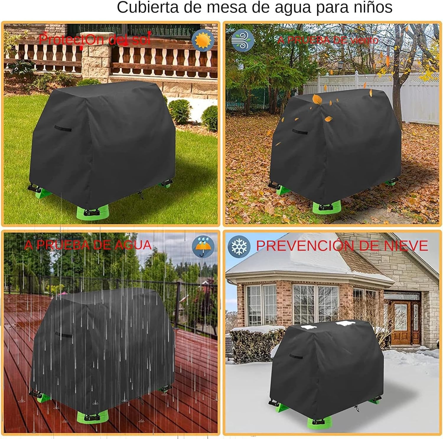 Durevolezza migliorata: il robusto tessuto Oxford 420D offre un'eccellente resistenza alla rottura mantenendo la sua forma, ideale per uso esterno continuo con prestazioni persistenti. Stabilità integrale: l'ancoraggio a 4 punti impedisce lo spargimento del vento garantendo una vestibilità stabile del cordino. Protegge la struttura dagli elementi esterni per una maggiore durata Copertura: cuciture robuste termosaldate con tecnologia impermeabile avanzata a doppia tenuta. Protegge efficacemente dalle precipitazioni mantenendo contenuti e prolungando la durata dei giocattoli in condizioni meteorologiche imprevedibili all'aperto. Applicazione rapida: fornisce un ambiente di gioco sicuro, con montaggio rapido e memoria compatta, migliorato da una maniglia facile da usare per una portabilità senza sforzo durante le routine quotidiane. Utilizzo multifunzione: tecnologia di regolazione termica con protezione UV integrata offre vantaggi completi per il tavolo, mantenendo superfici impeccabili senza residui e in ottime condizioni di lunga durata.