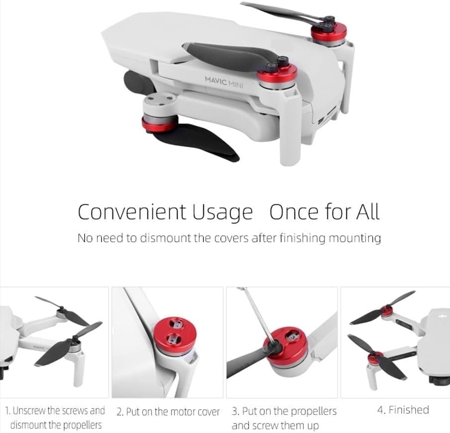Compatibile con i droni 4 Pro/ 3 Pro/Mini 3/ Mavic Mini/ SE (non for 2, 2 SE) Dimensioni ridotte e occupa meno spazio, materiale in lega di alluminio, leggero e durevole, ogni copertura pesa meno di 1 g, non influisce minimamente sulla resistenza al volo Per tenere il motore lontano dall'acqua, in particolare dalla pioggia improvvisa durante il volo, tenere il motore lontano dalla polvere, proteggere il motore durante il trasporto, durare tutta la vita del motore Con lavorazione di finitura CNC, motori perfettamente aderenti e buona copertura sulla parte superiore del motore Contenuto della confezione: 4 coperture motore