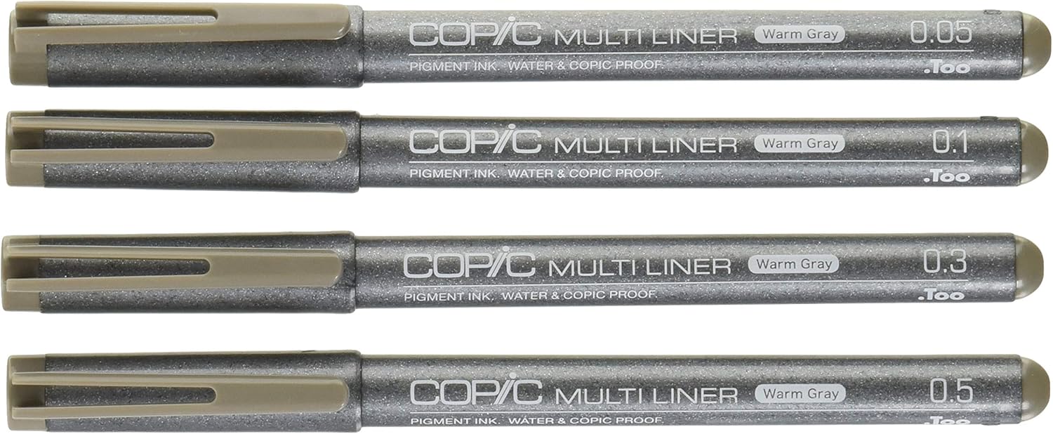 Multi Liner in set con inchiostro pigmentato di colore grigio caldo Strumenti di scrittura e matite da disegno in uno Contenuto: 4 penne fineliner in 4 larghezze di tratto (0,05 mm, 0,1 mm, 0,3 mm e 0,5 mm) L'inchiostro è resistente all'acqua e all'alcool, non sbiadisce e non sbiadisce, con flusso uniforme Ideale in combinazione con il sistema di pennarelli COPIC, per scrivere, fare schizzi, illustrazioni, ecc.