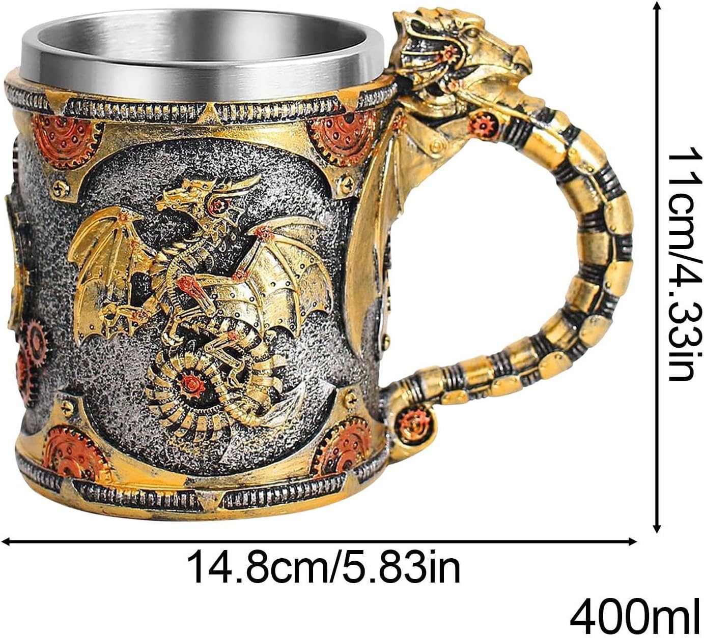 Isolamento efficace: struttura anti-sudore con superficie in resina testurizzata e inserto in acciaio inossidabile per una migliore facilità d'uso e design estetico. Versatilità pratica: tazza quotidiana essenziale da 400 ml per il lavoro e il tempo libero. Si sposa bene con tutte le bevande calde e fredde. Garantisce prestazioni affidabili come versatile compagno di bevute per l'uso quotidiano. Design in rilievo meccanico: la tazza Steampunk colpisce per il suo rilievo meccanico dettagliato. Questo design combina motivi fantastici con l'estetica art deco. La finitura color oro ingentilisce la zona decorativa. Comfort di presa antigraffio: realizzato con materiali antigraffio con finitura opaca. La tazza offre un manico comodo, un bordo per bere senza cuciture e un bordo adatto alle labbra per un pratico uso quotidiano. Oggetto da collezione unico: per gli amanti dei temi mitici, questa tazza è uno speciale recipiente per bere e un oggetto da collezione che si abbina perfettamente a qualsiasi collezione in stile cultura geek.