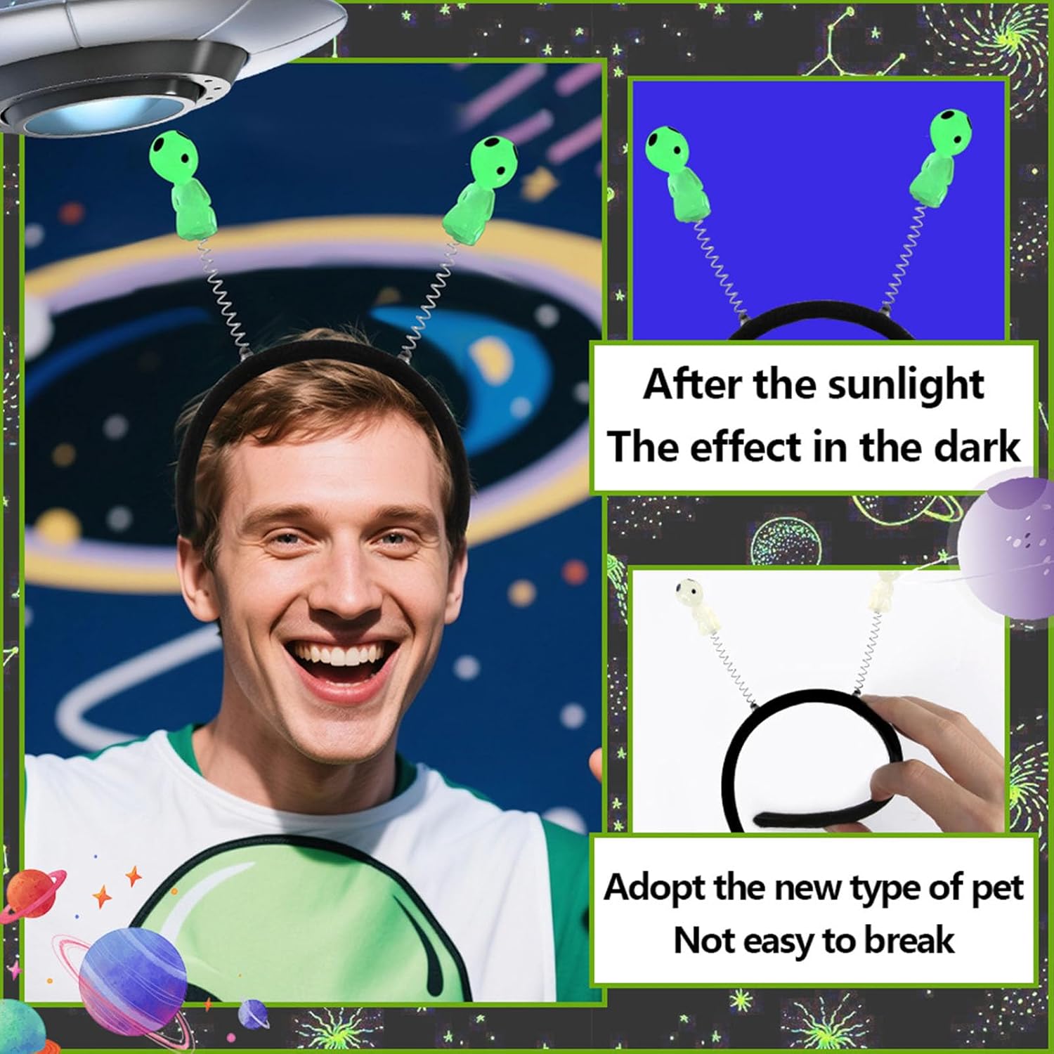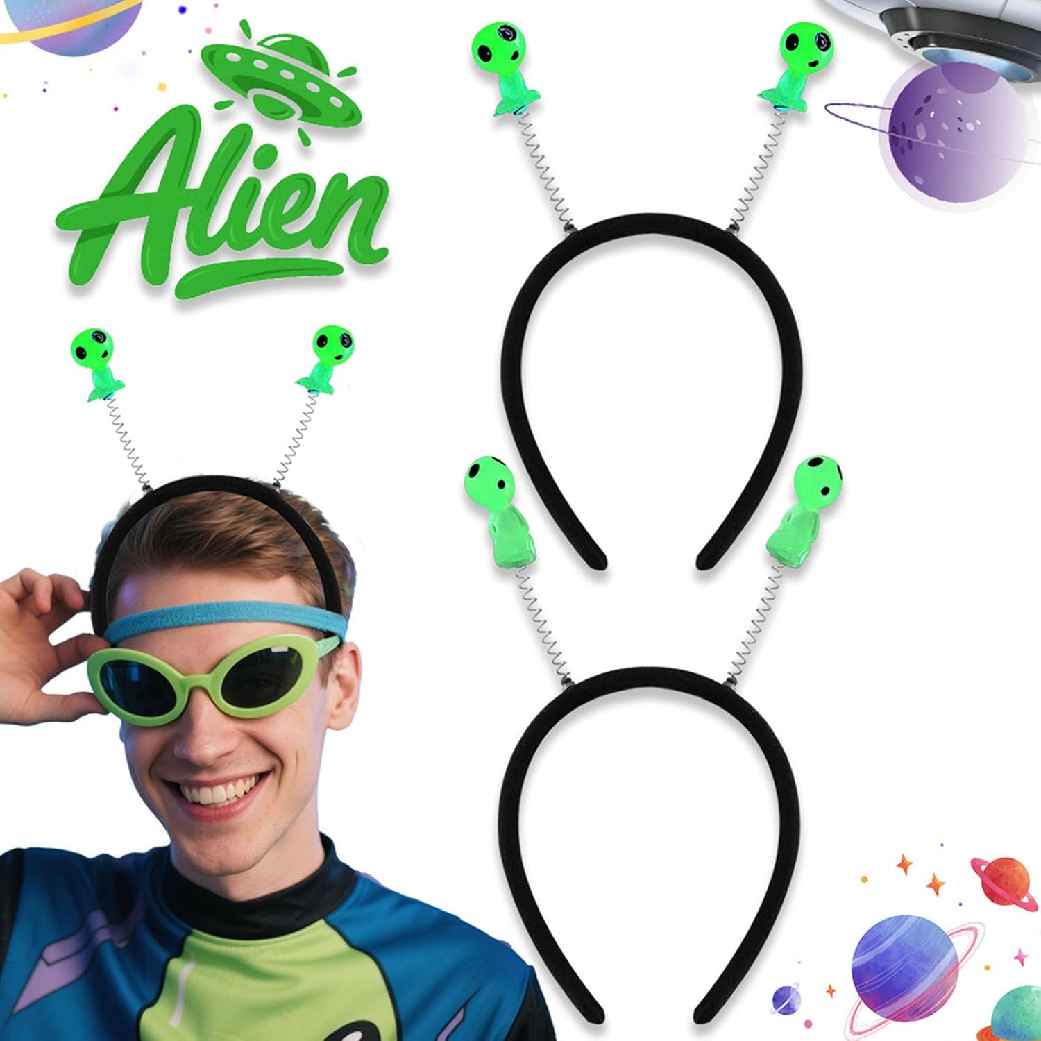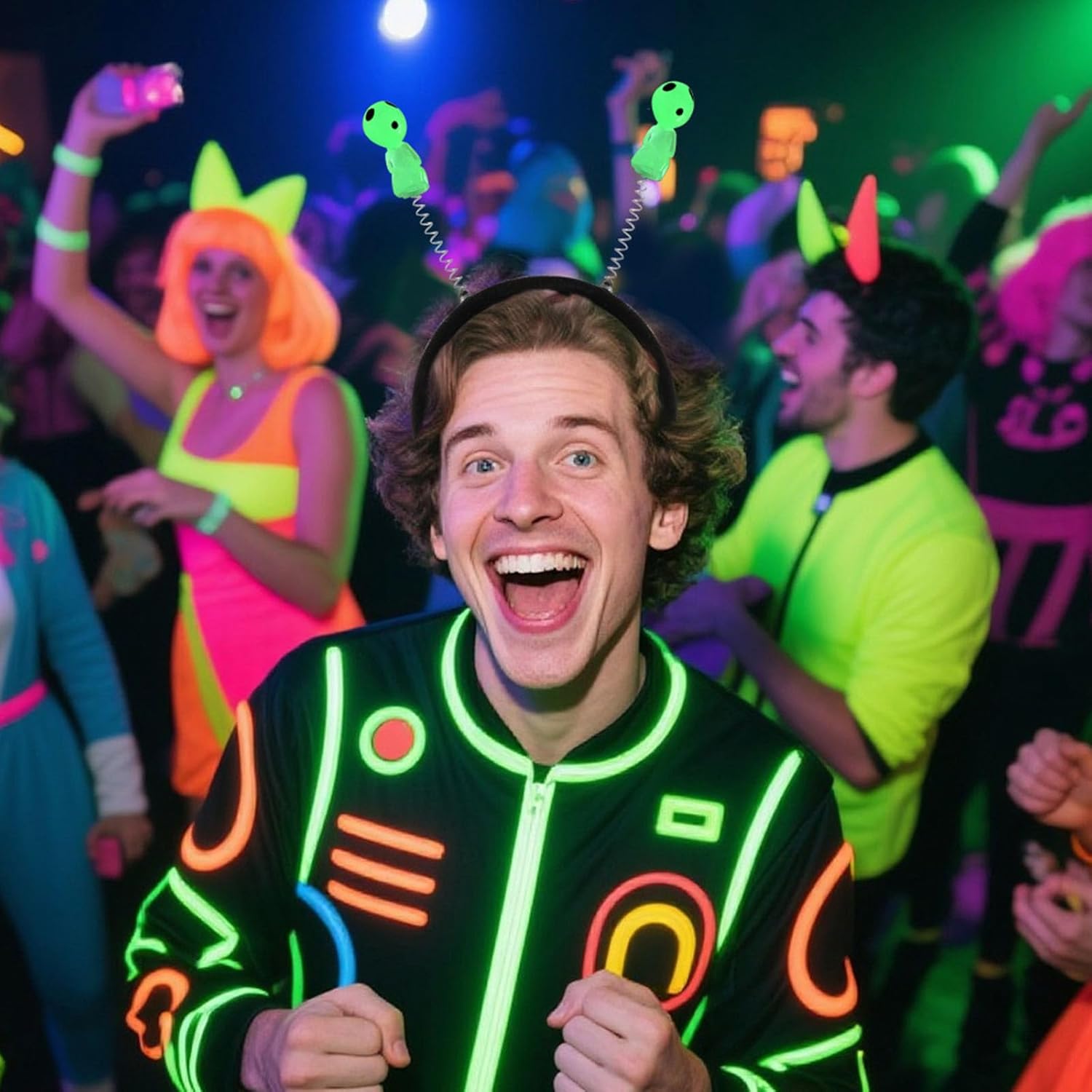 Copricapo alieno fluorescente, incandescente al buio, per feste di Halloween, cosplay, eventi a tema, copricapo Caratteristiche: La fascia con alieno incandescente con design innovativo aggiorna istantaneamente il costume per feste di Halloween, eventi o celebrazioni a tema attraverso le sue luci accattivanti e sagome ispirate. Utilizzare questo divertente accessorio per capelli presenta dimensioni flessibili e bordi lisci per un comfort tutto il giorno per bambini dai 5 anni in su, senza irritazioni della pelle o voluminosità. Perfetto per gli appassionati di cosplay, famiglie amanti delle feste e bambini fantasiosi che cercano accessori eccezionali per eventi scolastici, convegni di fumetti o servizi fotografici giocosi. Elevare feste di compleanno, viaggi in campeggio, e incontri di Capodanno con questo copricapo di inizio conversazione che suscita risate e auto-espressione creativa nelle attività di gruppo. La costruzione sicura soddisfa rigorosi standard per i costumi dei bambini mantenendo l'effetto luminoso vibrante per l'usura delle feste. Specifiche tecniche: Componenti: Dimensioni del prodotto: ca. Dimensioni 01: 21,5 x 15,5 cm, misura 02: 21,5 x 14 cm. Tipo: 01/02 La confezione include: 1 fascia luminosa con alieno. Nota: Considerare un margine di errore di 0-1 cm a causa della misurazione manuale. A causa delle differenze tra i diversi monitor, l'immagine potrebbe non rispecchiare il colore reale dell'articolo