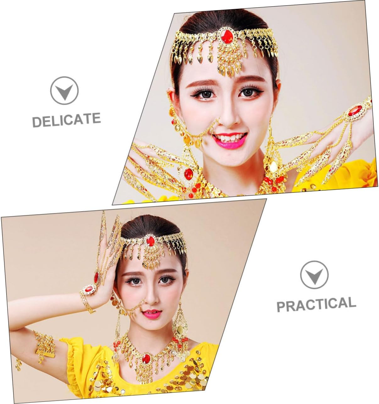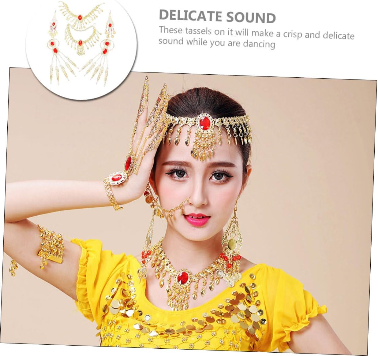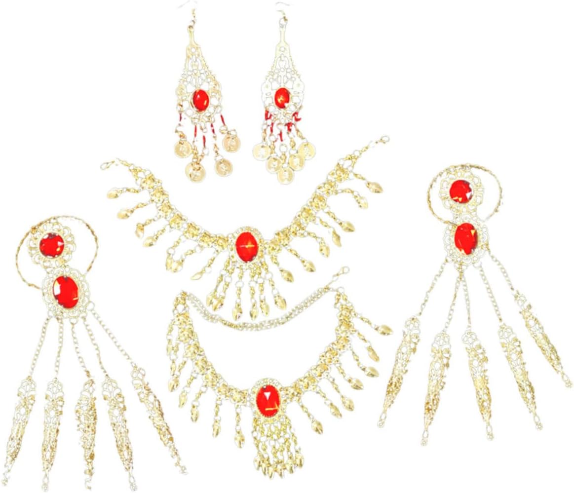 dei 3 x catene per la testa 3 x collane 3 x paia di orecchini 3 x paia di braccialetti Caratteristiche -Colore: catena a mano -Materiale: orecchini e bracciali in lega e acrilico -Dimensioni: 15,00X15,00X8,00 cm/5,89X5,89X3,14 pollici (catena per la testa) Catena - Caratterizzati da un design chic e da una lavorazione raffinata, questi orecchini pendenti possono darti un temperamento diverso. -Puoi regalarlo agli innamorati in occasioni speciali, regalando loro una piccola collana a con motivo danzante. -Questo set di gioielli è leggero e delicato sulla pelle, sicuro e comodo da indossare a lungo. Orecchini. -Un set di fantastici accessori per costumi, che mettono in risalto il tuo aspetto e ti rendono un braccialetto per la danza del ventre molto attraente. -Set di gioielli delicati e brillanti, un set di splendidi accessori da abbinare a diversi costumi da ballo e collane da ballo. Descrizione della merce braccialetto di danza del ventre E questo set di gioielli è un accessorio perfetto per le esibizioni di danza. Gioielli per donne Questo set di gioielli creativo e squisito è realizzato con materiali delicati e resistenti all'usura, durevoli e comodi da indossare, emette suoni piacevoli quando lo scuoti