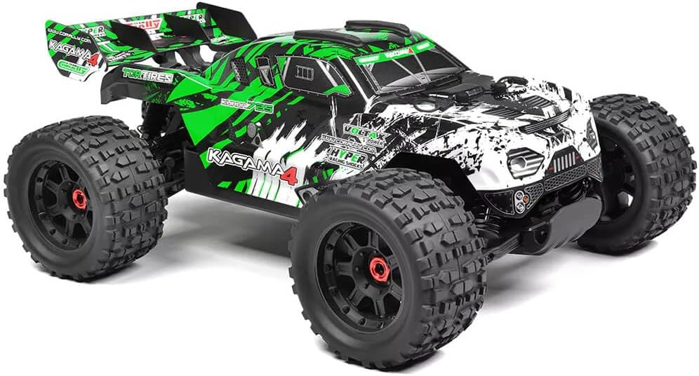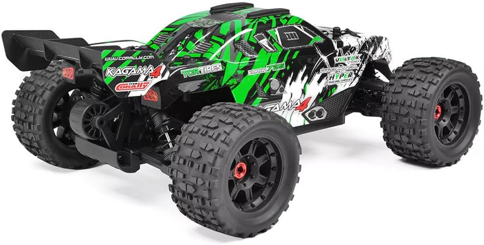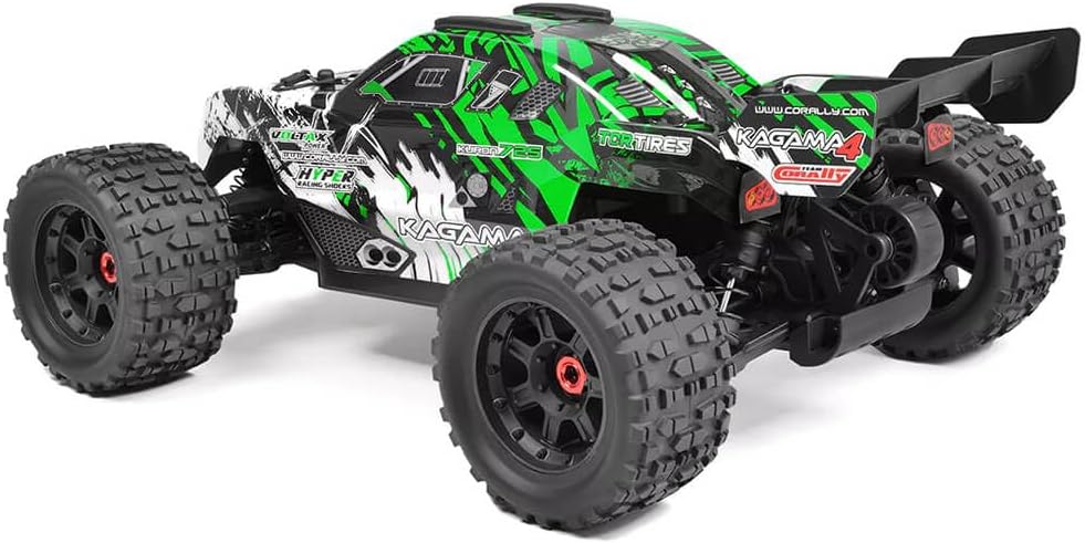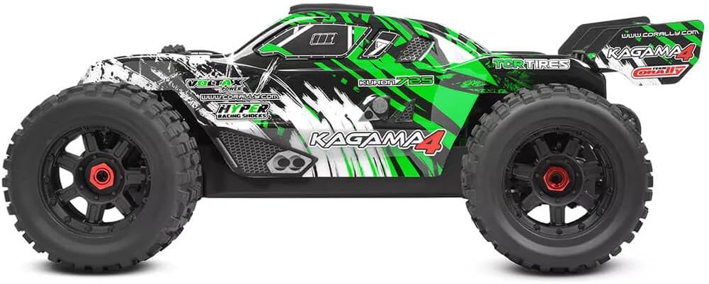 Il Corally KAGAMA-4 è un monster truck in scala XL4S pronto all'uso, che mescola agilità buggy con potenza monster truck. Ideale per principianti ed esperti, è dotato di un robusto motore brushless senza sensori Kuron 725 a 4 poli da 2150 kv e Torox 135 ESC, che raggiunge velocità superiori a 80 km/h con batterie 4S LiPo. Include un trasmettitore CT2S da 2,4 GHz per un controllo preciso e un avanzato sistema di sospensione per diversi terreni. Costruito con una trasmissione resistente, coppe in acciaio outdrive e cuscinetti a sfera sigillati in gomma di qualità aerospaziale, offre anche personalizzazione con varie parti di accordatura. Caratteristiche: Raggiunge velocità 45 mph+ TOROX 135 ESC (2-4S) con protezione LiPo. Kuron 725, 2150 kV, motore brushless a 4 poli. CRHV-7225 Ingranaggio in metallo HV, coppia 25Kg, servo sterzo. CT2S NUOVO Trasmettitore 2.4GHz Braccio servo in alluminio. Collegamento dello sterzo composito monopezzo. Scatola elettronica resistente agli spruzzi e alla polvere con supporto transponder. Supporto batteria regolabile per varie batterie LiPo. Set completo di cuscinetti a sfera sigillati in gomma. Ingranaggio cilindrico in acciaio e pignone motore. Tre differenziali sigillati riempiti con olio di silicone. Supporto motore in alluminio con coperchio ingranaggi cilindrici. Posizione del motore fissa per pignone 13T, 15T e 17T. Outdrive in acciaio rivestito duro. Giunti anteriori CVD in acciaio temprato. Esagoni in alluminio da 17 mm. Ammortizzatori Big Bore in plastica filettati ad olio da 16 mm. Sospensione anteriore Pivot Ball indipendente e sospensione posteriore a doppio braccio oscillante. Blocchi sterzo anteriori e mozzi posteriori Wide HD. Piastra in alluminio da 3 mm incisa al laser. Specifiche tecniche: Lunghezza: 515 mm Altezza: 182 mm Interasse: 327 mm Peso (senza batteria): 4000g Richiede 4S Lipo Batteria & Caricatore