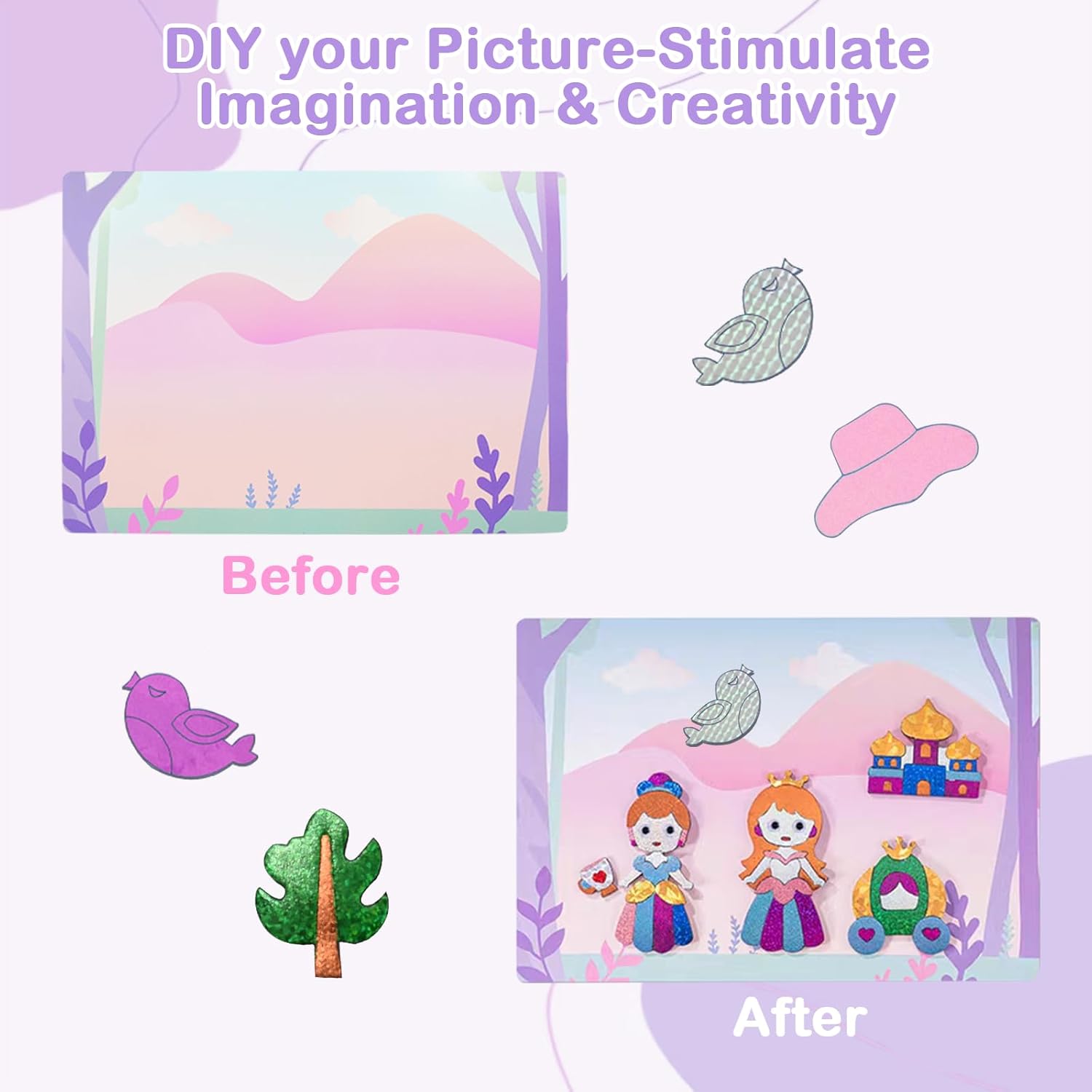 Foil Art per bambini: questo divertimento in pellicola per bambini è un gioco d'arte intelligente e creativo che contiene 60 fogli di pellicola colorata, 10 occhi di glup, 6 tele e oltre 100 adesivi in schiuma. Con il fantastico set fai da te in pellicola, i bambini possono creare opere d'arte uniche con dinosauri, principesse, fate e castelli. È adatto a bambini di età compresa tra 4, 5, 6, 7 e 8 anni per esplorare autonomamente l'arte della diapositiva. Attività creative: il kit fai da te è un ottimo gioco per attività artistiche creative che combinano qualità e artigianato. Il design compatto e adatto per i viaggi e la conservazione a prova di perdite assicurano che la pellicola e gli strumenti rimangano ordinati e la pulizia sia un gioco da ragazzi, in modo che il bambino abbia un'esperienza di bricolage piacevole e confortevole. Applicazione: staccare - premere - incollare - fatto: basta selezionare l'immagine, scegliere l'adesivo, posizionare la carta lamina d'oro sulla superficie adesiva, strofinare e sollevare per trasferire la carta lucida dorata sull'immagine Coltivare abilità di base: questo giocattolo artistico fai da te può sviluppare le abilità di base dei bambini come espressione creativa, impugnatura a pinza, coordinazione occhio-mano, riconoscimento del colore, ecc. Può anche coltivare la loro capacità di percepire e apprezzare la bellezza e scatenare la sua creatività. Le attività creative fatte a mano con pellicola sono pensate per i più piccoli e promuovono la concentrazione e il divertimento nello sviluppo delle abilità. Regali divertenti per bambini artigianali: la carta colorante facile da colorare i kit fai da te per i bambini offrono una varietà di modelli per i bambini per colorare tutto ciò di cui hai bisogno per sbloccare il potenziale artistico del tuo bambino. Il kit artistico per bambini è perfetto per compleanni, uova di Pasqua, Halloween, regali di Natale per ragazzi e ragazze di età compresa tra 4 5 e 6 7. Lascia che i tuoi bambini giochino la loro immaginazione, dipingi nei loro colori preferiti e sperimenta diversi metodi di incollaggio e combinazioni. Gioca tranquillamente in scene interne ed esterne come auto, aerei, ristoranti, picnic o in viaggio