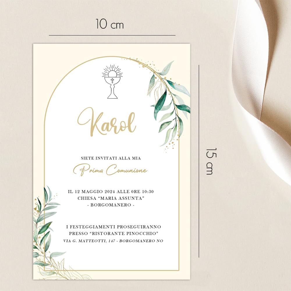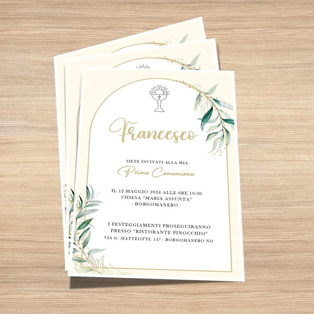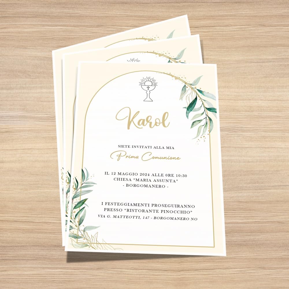 ✅ KIT COMPLETO DA 30 PEZZI – Il set include 30 inviti per Prima Comunione, perfetti per festeggiare sia bambina che bambino. Ideali per condividere con eleganza il giorno della cerimonia con amici e parenti. 🌿 STILE NATURALE ED ELEGANTE – Design raffinato con foglie verdi su sfondo neutro: adatto a qualsiasi tema di Comunione, sia classico che moderno. 🖊️ 🟡 PERSONALIZZAZIONE FACILE ONLINE – Personalizza il tuo invito direttamente su Amazon cliccando il tasto “Personalizza ora” in giallo: inserisci nome, data, ora e luogo della cerimonia in pochi secondi! 🎉 PER UNA COMUNIONE INDIMENTICABILE – Perfetti per creare un’atmosfera curata e accogliente fin dal primo annuncio dell’evento. 🇮🇹 INTERAMENTE MADE IN ITALY – Progettati e stampati in Italia con materiali di alta qualità, per garantire stile, cura artigianale e attenzione ai dettagli.