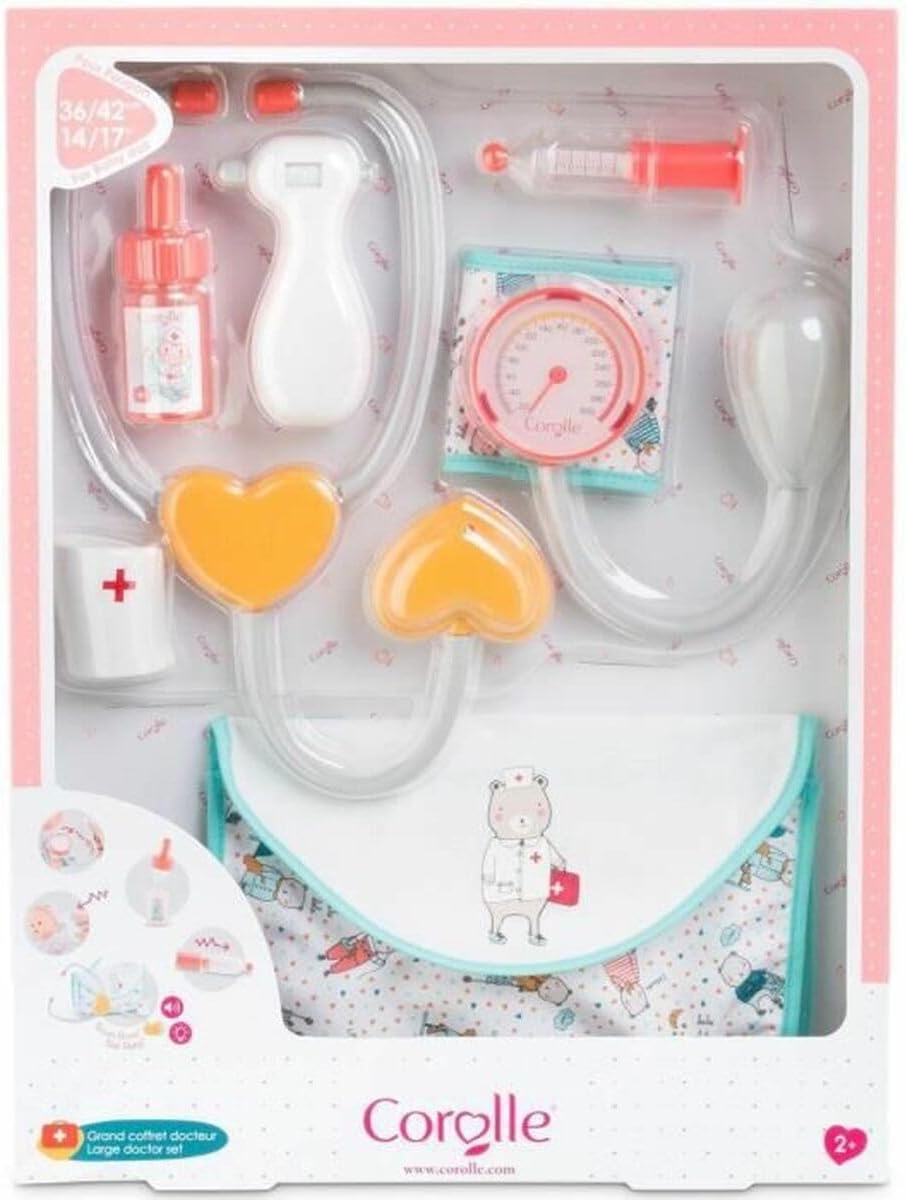 Set dottore per bambole cm 36-42 Inclusi 7 accessori: 1 stetoscopio che simula il battito del cuore, 1 siringa retrattile, 1 flacone di vitamine, + 1 sfigmomanometro + 1 cerotto da braccio + 1 termometro + 1 custodia per riporre il tutto Ottimo per bambini a partire dai 2 anni di età Rispetta le regole di produzione