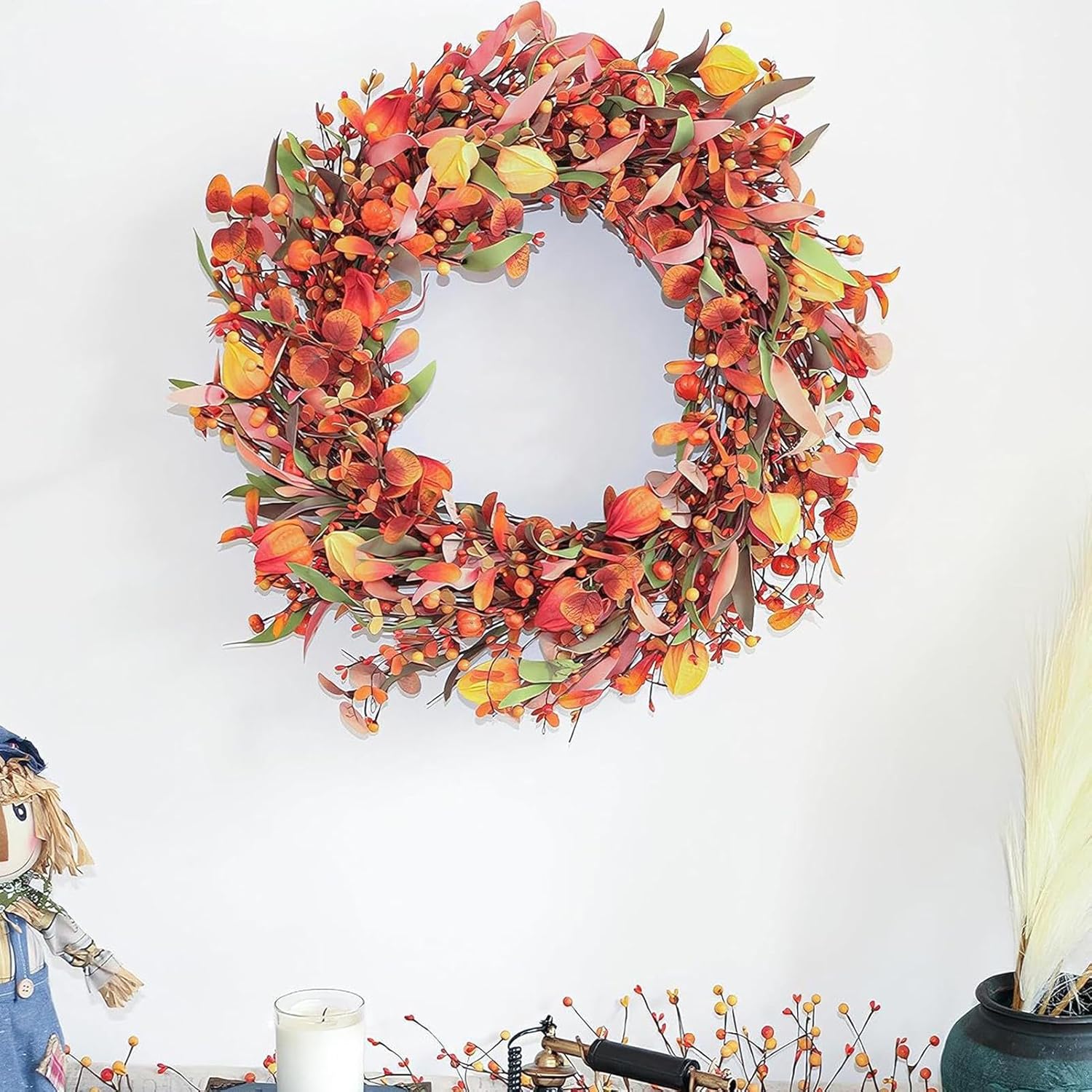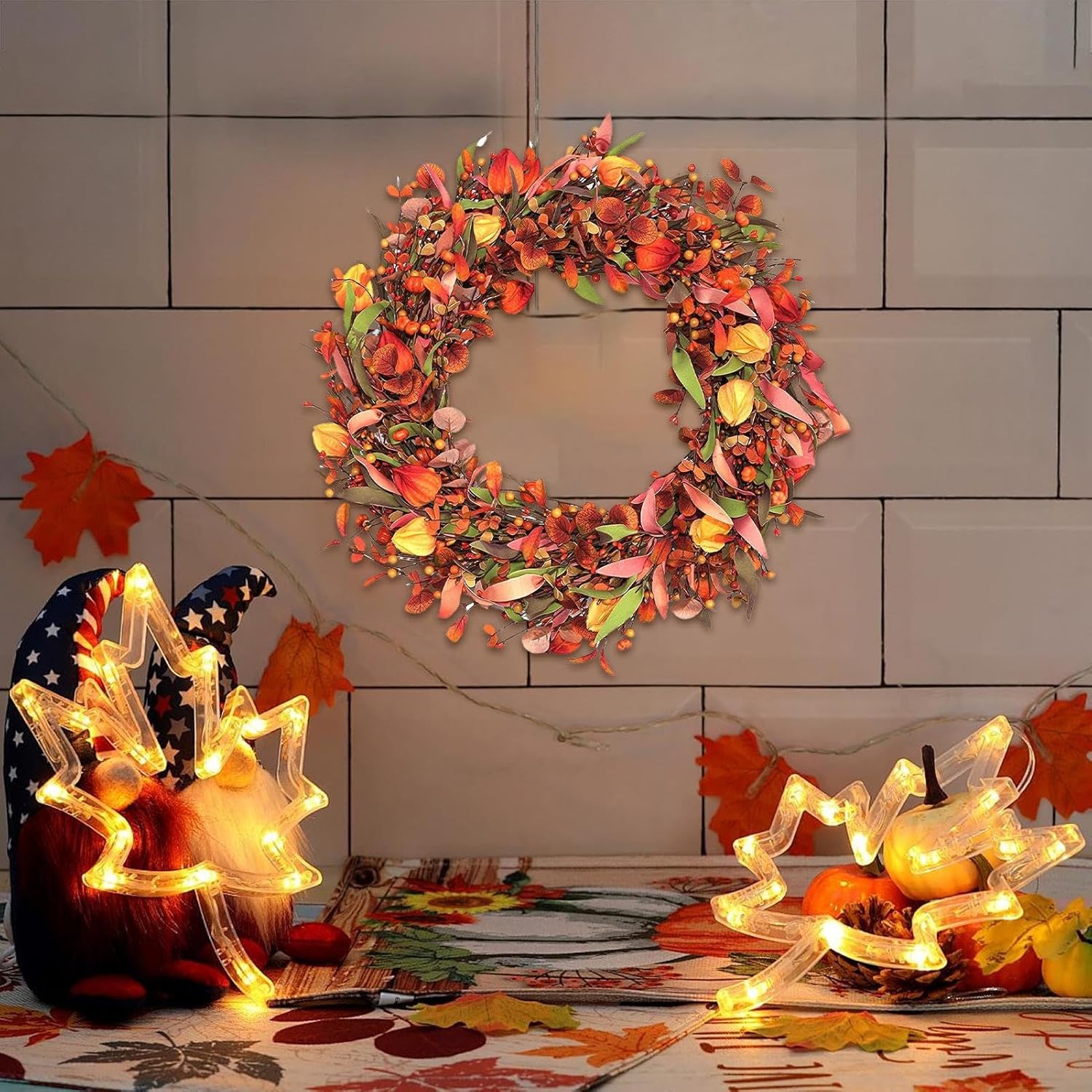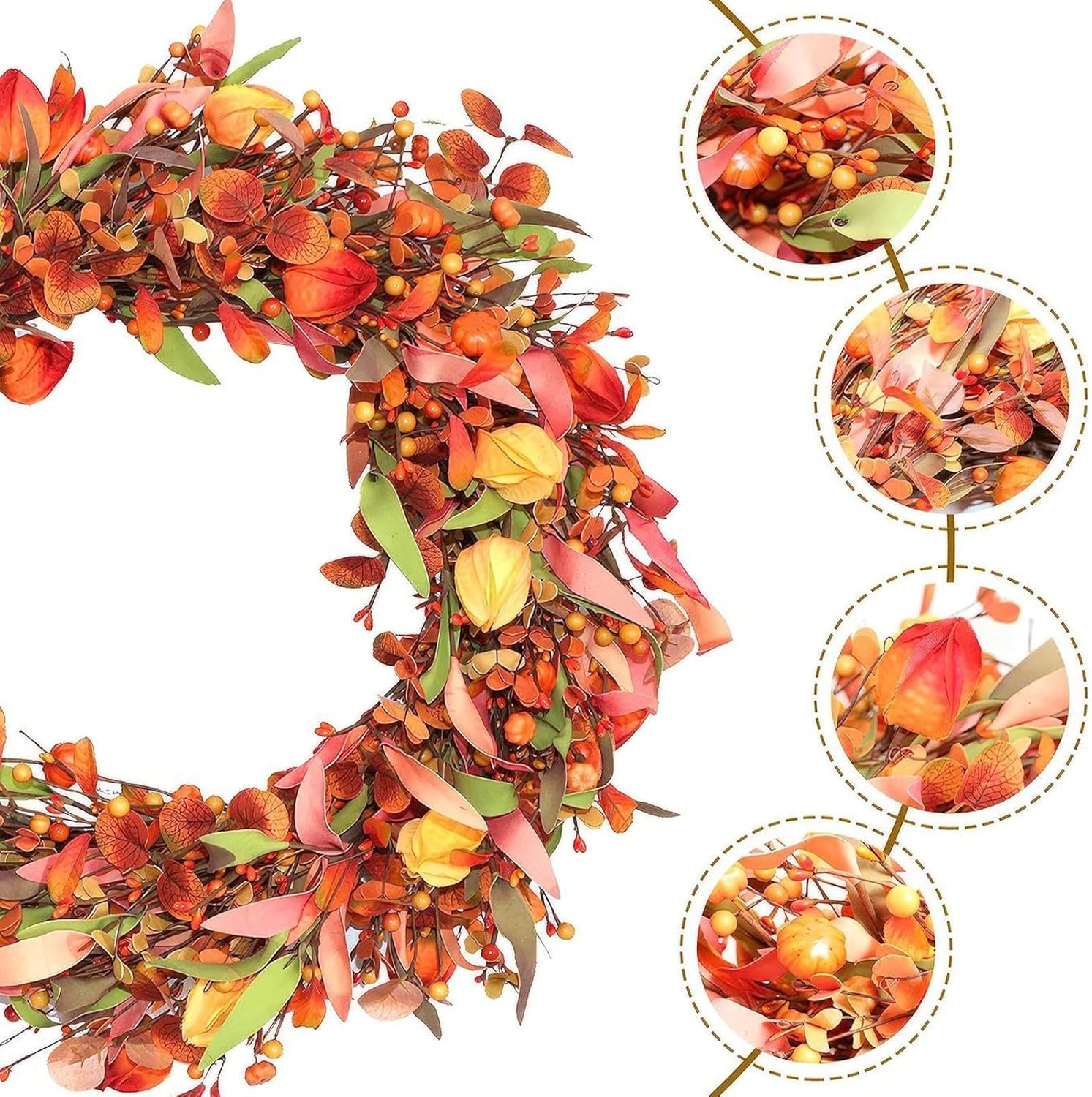 Decorazione Autunnale per Esterni: Le ghirlande autunnali per porta d'ingresso un punto focale stupendo per l'ingresso di casa, offrendo un'atmosfera calda e accogliente durante la stagione del raccolto; queste decorazioni per feste autunnali si integrano alla perfezione in qualsiasi ambiente, realizzando un tema autunnale elegante che dà il benvenuto agli ospiti con il fascino stagionale e lo spirito festivo, valorizzando l'attrattiva esterna con dettagli naturali e design vibrante per a Materiale Resistente alla Rottura: Prodotta con materiale PVC solido, questa ghirlanda autunnale per porta d'ingresso fornisce un'eccellente resistenza alla rottura, assicurando un utilizzo prolungato attraverso diverse stagioni, perfetta per accogliere gli ospiti con un tocco festivo durante le vacanze o per l'arredamento quotidiano, grazie alla sua costruzione che evita fratture e preserva la forma anche dopo ripetuti impieghi. Design Intrecciato a Mano: Caratterizzato da un design intrecciato a mano e una base in rattan robusta, queste ghirlande autunnali incorporano tematici autunnali come foglie, bacche arancioni e zucche decorative. Sono perfette per creare un'atmosfera di benvenuto alla porta d'ingresso durante le fresche giornate d'autunno, aggiungendo un tocco festoso e invitante alla decorazione 'ingresso di casa con naturali e duraturi. Decorazione Autunnale : Questa corona autunnale per la porta crea una ricca atmosfera mostrando vivaci colori autunnali e lo spirito del raccolto, rendendola perfetta per celebrare il Ringraziamento con famiglia e amici mentre aggiunge calore alla decorazione domestica durante gli incontri stagionali, ideale per abbellire l'ingresso con autunnali e festivi. Dimensione Perfetta e Versatile: La ghirlanda autunnale misura 56 cm di diametro quando è completamente espansa e si adatta con facilità a vari spazi domestici; dopo averla scartata, moa e i rami per aumentare la pienezza e le dimensioni, rendendola ideale per porte, pareti o caminetti durante la stagione autunnale, mantenendo un aspetto naturale e accogliente nell'arredamento a casa con una decorazione stagionale che valorizza ingressi e ambienti interni.