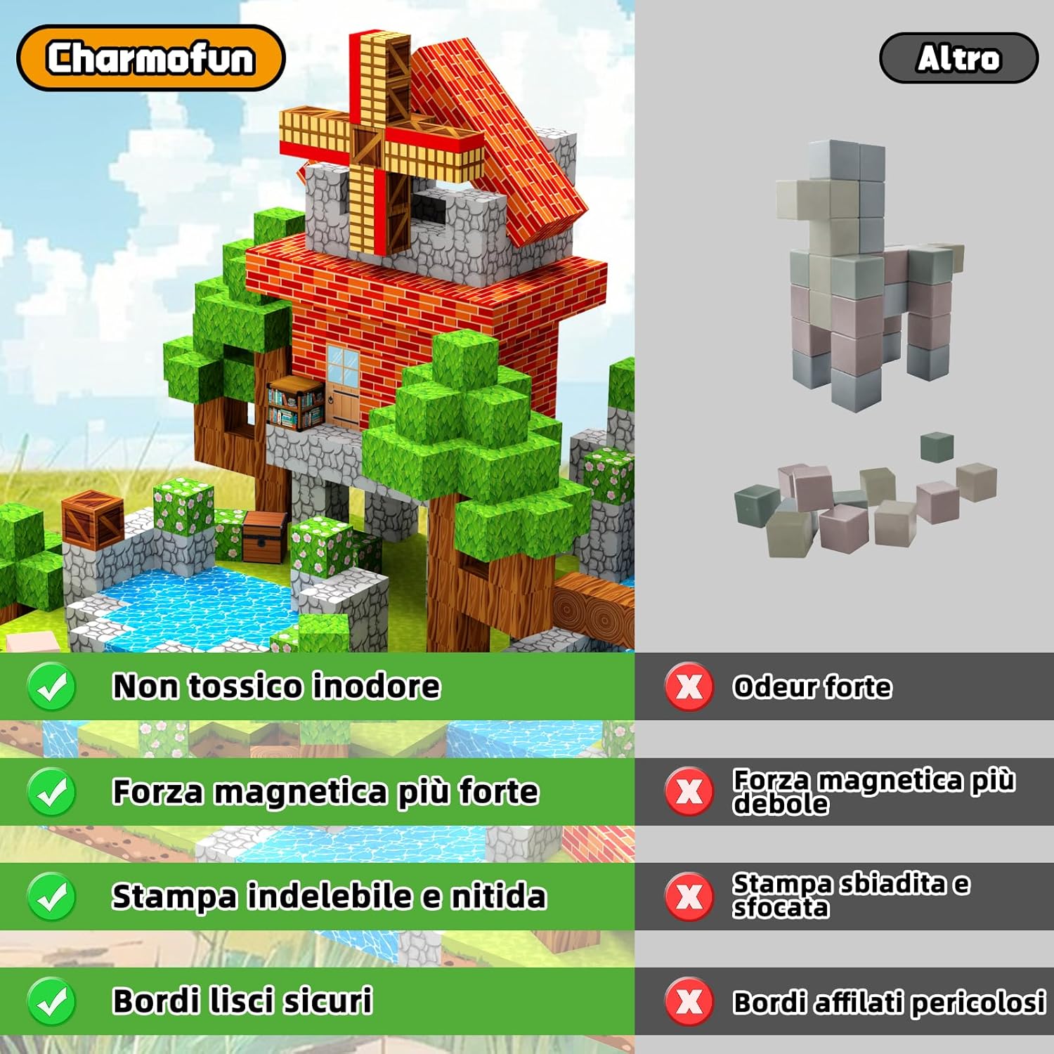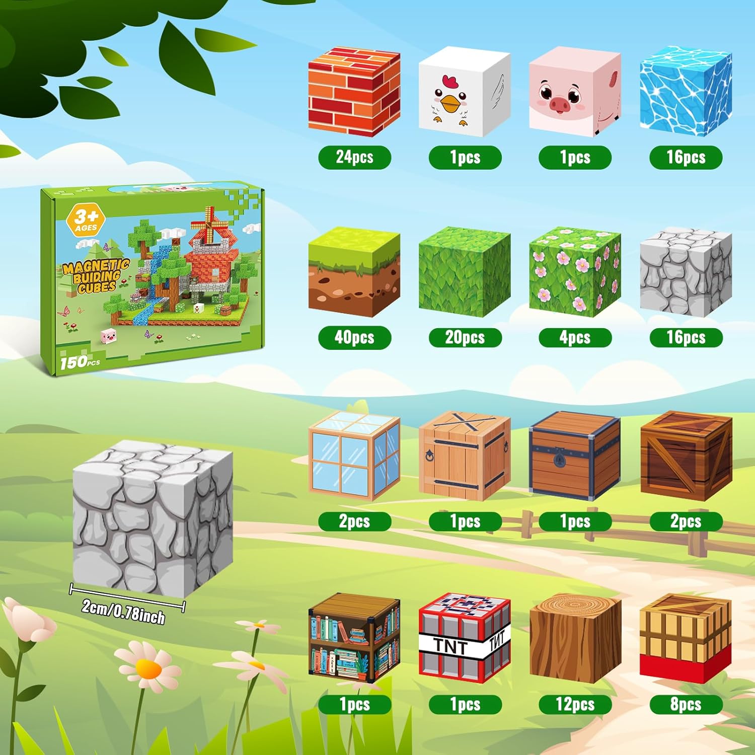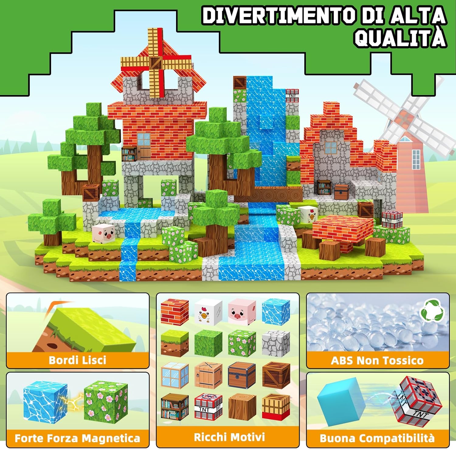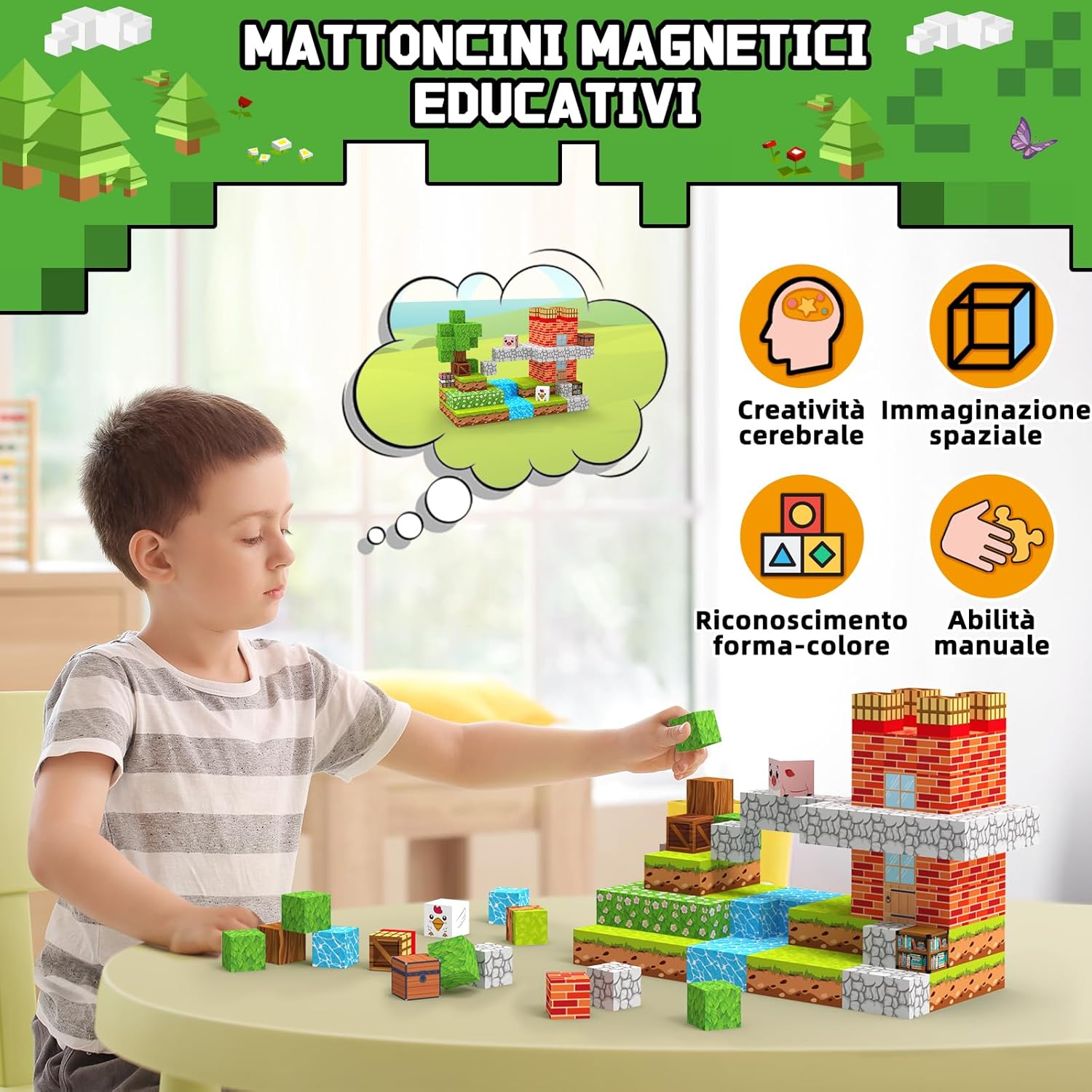 🌳【150 Pezzi Costruzioni Magnetiche e 16 Colori】 Questo set costruzioni magnetiche contiene 150 pezzi quadrati con 16 vivaci motivi. Tra questi vi sono: acqua, animali, fiori, mulini a vento e altro ancora, che consentono di creare scenari semplici o complessi. La ricca varietà di pezzi e combinazioni di colori permette ai bambini di percepire i colori intensi e il senso architettonico, stimolando la loro immaginazione e creatività senza limiti, per creare il proprio mondo fantastico