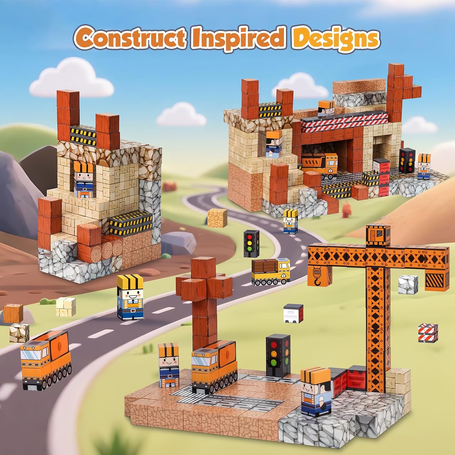 Set di Cubi Magnetici: Questo gioco di costruzioni magnetiche per bambini contiene 150 cubi magnetici e raccoglie ricchi elementi tematici di costruzione: ingegneri, veicoli da cantiere, strade, gru a rotazione, cubi di legno e pietra (tutti sotto forma di modelli). Permette ai nostri piccoli architetti di sviluppare l'immaginazione e costruire liberamente il mondo della costruzione che immaginano! Gioco di Giochi Magnetici : Questo giocattolo di blocchi magnetici per bambini, con i suoi ricchi elementi di costruzione e un dolce suono di cigolio, cattura l'attenzione dei più piccoli e incoraggia il gioco senza schermo. Stimola il pensiero creativo mentre sviluppa la concentrazione, la pazienza, la coordinazione occhio-mano, le capacità di collaborazione, la percezione spaziale e le abilità motorie. I bambini imparano a collaborare e a rafforzare la loro fiducia mentre giocano! Materiali di Alta Qualità: Questo gioco di costruzioni magnetiche è realizzato in plastica ABS durevole, con più punti di contatto magnetico integrati per rafforzare la forza magnetica. Dispone di un design con bordi sigillati e una struttura solida, e tutte le superfici di contatto sono trattate per essere lisce — rendendo i cubi magnetici sicuri da giocare, durevoli e difficili da rompere! I colori vivaci e i design divertenti sono applicati tramite un processo di trasferimento acquatico multiplo: sono senza odori, più definiti e resistenti al sbiadimento. Gioco Educativo Divertente: Questo giocattolo di costruzione cubi magnetici è adatto a bambini 3 anni e oltre. Permette di sviluppare l'immaginazione per assemblare diverse strutture e scene di costruzione, dal semplice al complesso! Ogni cubo magnetico si assembla facilmente, e i diversi design possono essere combinati per formare attrezzature complete per i cantieri o figure di ingegneri. Questo aiuta i bambini a rimanere concentrati e impegnati in contesti sociali, mentre imparano a interagire con gli amici e a collaborare per completare le loro creazioni! Regalo Bambini Perfetto: Questo set di cubi costruzioni magnetiche è un'ottima scelta di regalo bambina & bambino 3-12 anni. Sia come regalo di Natale, regalo di compleanno per bambini, o per riunioni familiari o attività scolastiche, è un regalo educativo di qualità! Adatta a molte occasioni — scuole, viaggi, educazione a domicilio, asili nido, week-end in famiglia — per intrattenere i bambini e rafforzare la loro concentrazione!