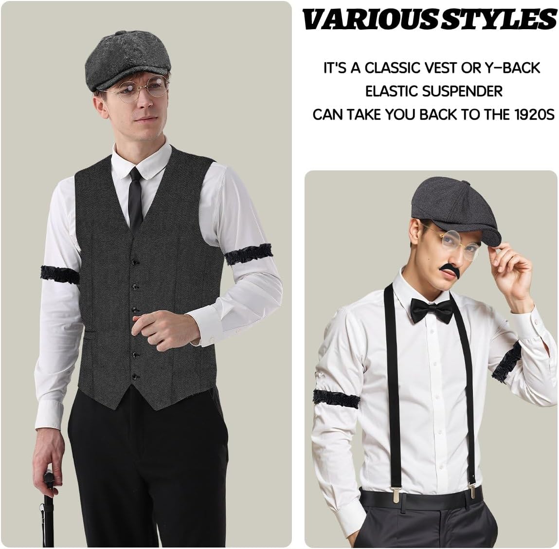 Costume anni '20, gilet da uomo con accessori bretelle, stampella, orologio da tasca, baretto, occhiali da cravatta, per costume da mafia, costume 1920S, gangster Peaky Blinders, carnevale, Halloween