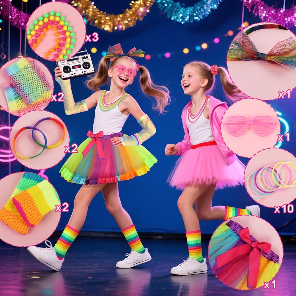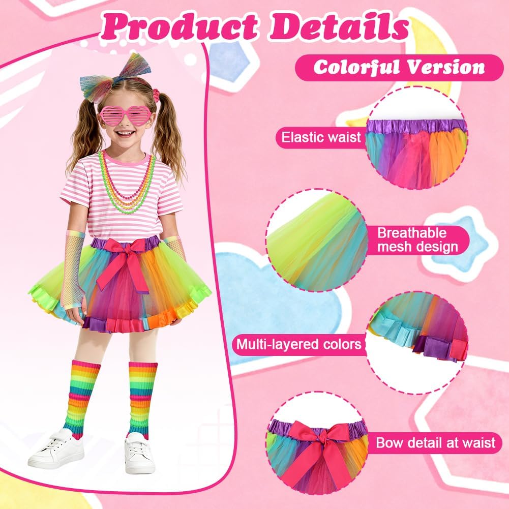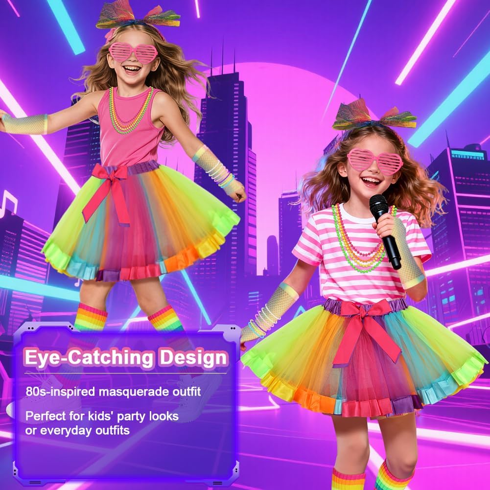 Set di Travestimenti Anni '80 per Bambine: questo elegante set per bambine include una gonna a rete colorata, un paio di maniche, un paio di cavigliere color arcobaleno, un paio di occhiali rosa-rosso, 10 braccialetti, due braccialetti color arcobaleno, una fascia per capelli e quattro collane colorate. Con tutti gli accessori, puoi indossare l'intero set o personalizzarlo a tuo piacimento. Alta Qualità: il nostro elegante tutù fluo è realizzato in 100% poliestere di alta qualità per il massimo comfort. I guanti e i leggings sono super elastici, garantendo una vestibilità perfetta per tutte le corporature. Gli occhiali e la collana sono realizzati in plastica liscia e resistente. Ogni pezzo è stato accuratamente selezionato per creare un look anni '80 completo. Design Retrò: il tutù è circondato da una varietà di reti colorate, creando un design unico e vivace che si adatta perfettamente a qualsiasi look retrò. Gli occhiali presentano un design a forma di cuore per un look più vivace. Sono inclusi anche leggings arcobaleno e guanti a rete. Una collana di perline colorate, abbinata a un braccialetto fosforescente a 10 colori e a una fascia per capelli con fiocco in pizzo vintage, ti farà distinguere a qualsiasi festa. Versatili: questi accessori si ispirano alle feste a tema anni '80 e sono perfetti per feste anni '80, feste a tema retrò, feste in maschera, esibizioni di band, Halloween, feste in discoteca e molto altro. Ricrea i Ricordi Degli Anni '80: questi accessori non solo evocano la nostalgia, ma sottolineano anche il significato di quell'epoca, incoraggiando il tuo bambino a travestirsi e a godersi la festa con la famiglia e gli amici, creando ricordi indelebili e godendosi l'atmosfera retrò.