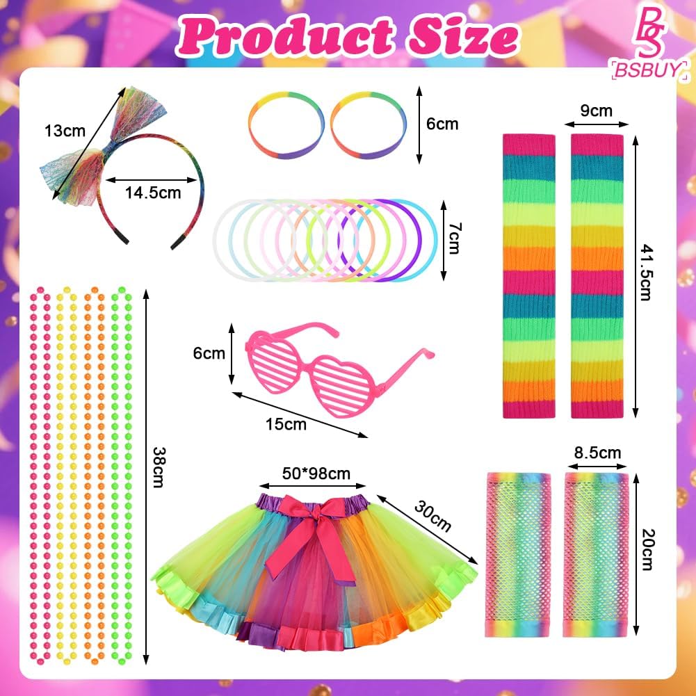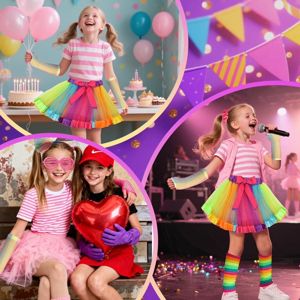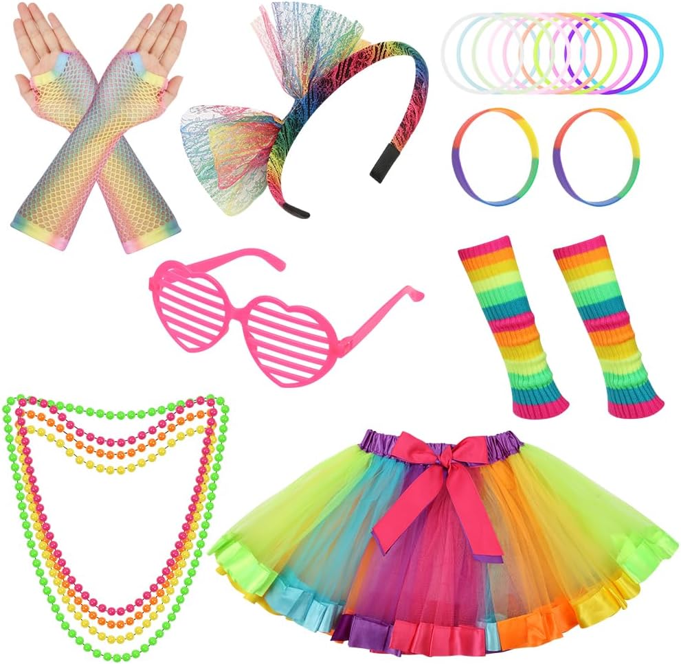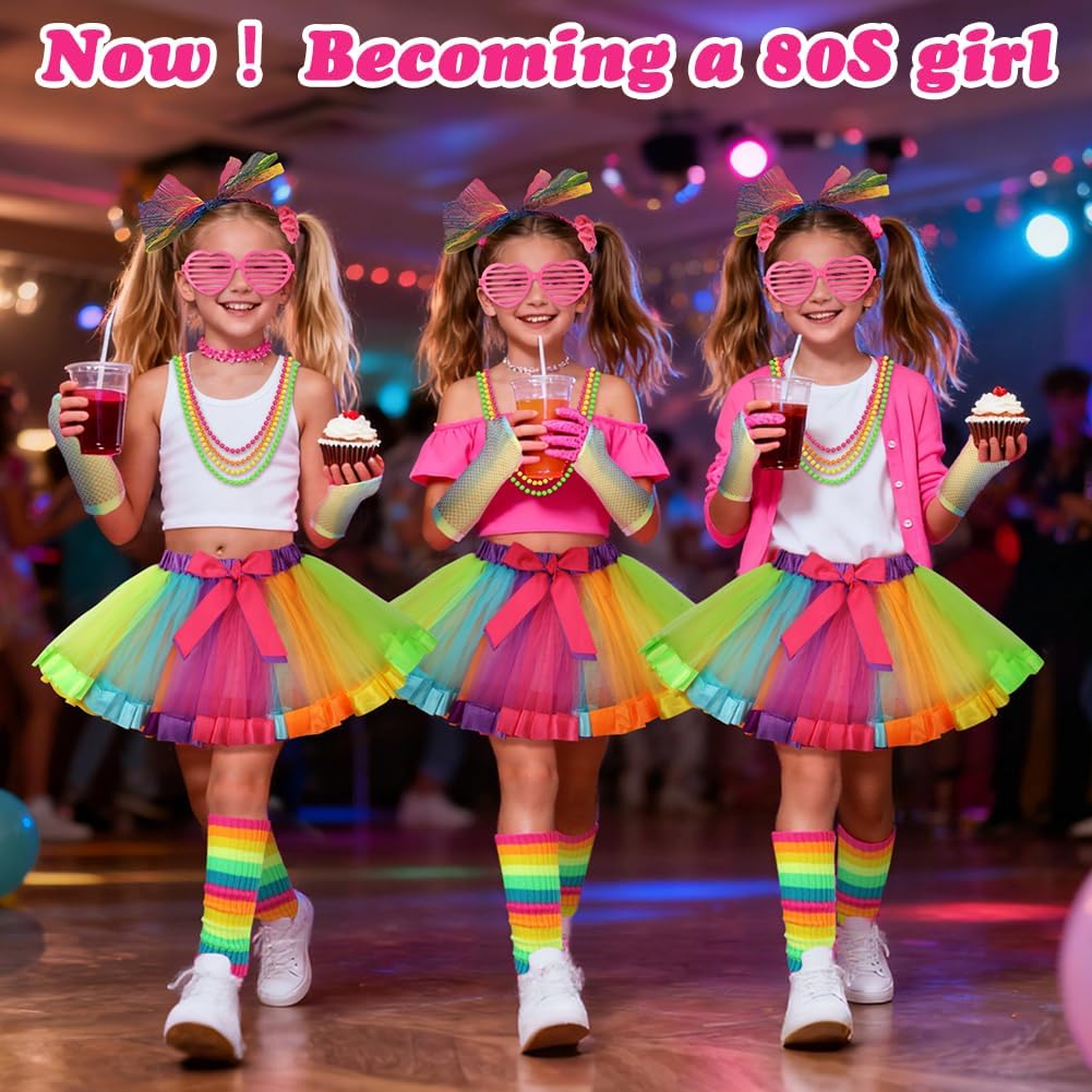 Set di Travestimenti Anni '80 per Bambine: questo elegante set per bambine include una gonna a rete colorata, un paio di maniche, un paio di cavigliere color arcobaleno, un paio di occhiali rosa-rosso, 10 braccialetti, due braccialetti color arcobaleno, una fascia per capelli e quattro collane colorate. Con tutti gli accessori, puoi indossare l'intero set o personalizzarlo a tuo piacimento. Alta Qualità: il nostro elegante tutù fluo è realizzato in 100% poliestere di alta qualità per il massimo comfort. I guanti e i leggings sono super elastici, garantendo una vestibilità perfetta per tutte le corporature. Gli occhiali e la collana sono realizzati in plastica liscia e resistente. Ogni pezzo è stato accuratamente selezionato per creare un look anni '80 completo. Design Retrò: il tutù è circondato da una varietà di reti colorate, creando un design unico e vivace che si adatta perfettamente a qualsiasi look retrò. Gli occhiali presentano un design a forma di cuore per un look più vivace. Sono inclusi anche leggings arcobaleno e guanti a rete. Una collana di perline colorate, abbinata a un braccialetto fosforescente a 10 colori e a una fascia per capelli con fiocco in pizzo vintage, ti farà distinguere a qualsiasi festa. Versatili: questi accessori si ispirano alle feste a tema anni '80 e sono perfetti per feste anni '80, feste a tema retrò, feste in maschera, esibizioni di band, Halloween, feste in discoteca e molto altro. Ricrea i Ricordi Degli Anni '80: questi accessori non solo evocano la nostalgia, ma sottolineano anche il significato di quell'epoca, incoraggiando il tuo bambino a travestirsi e a godersi la festa con la famiglia e gli amici, creando ricordi indelebili e godendosi l'atmosfera retrò.