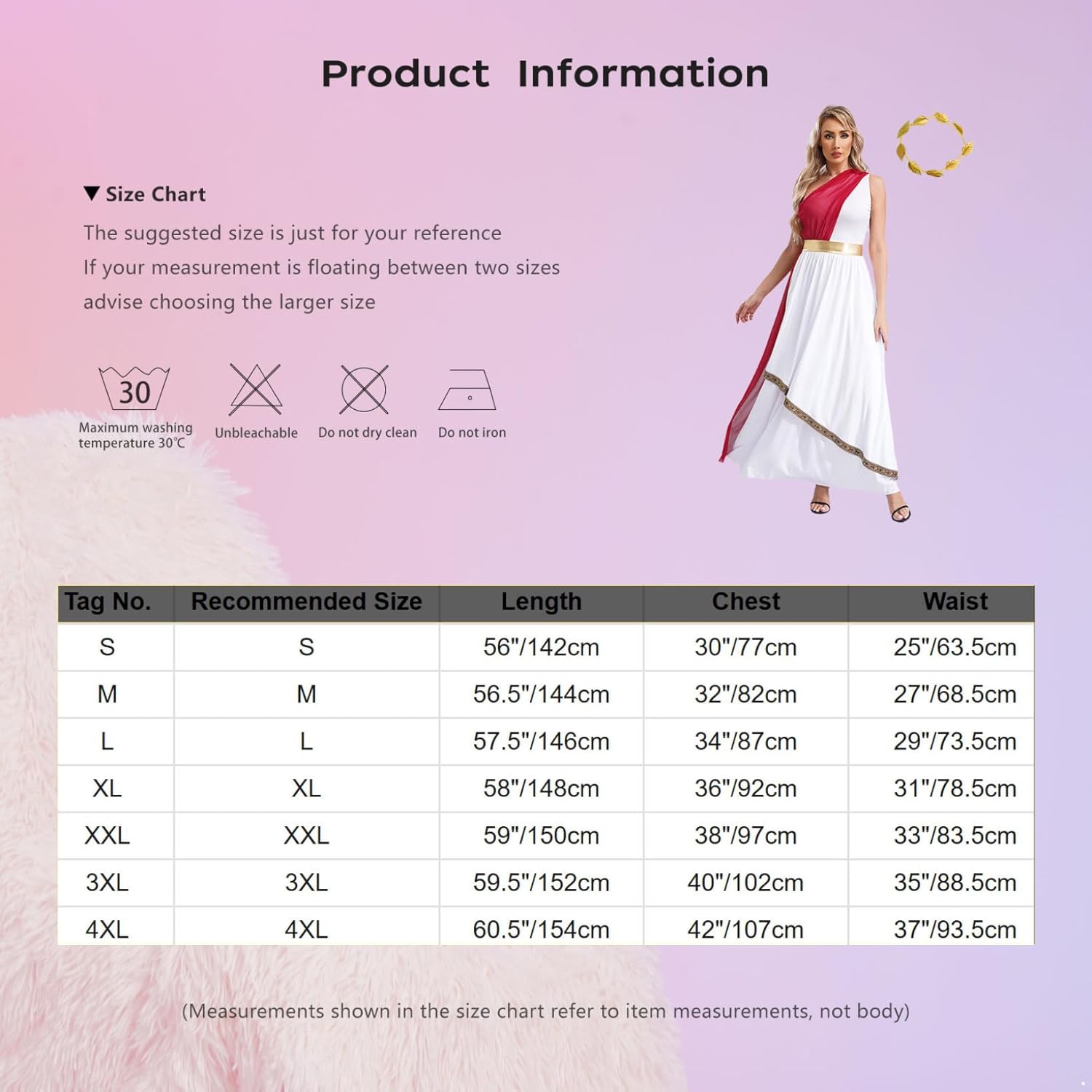 Descrizione prodotto Imposta include : 1 pezzo di vestito, 1 pezzo di copricapo Condizione : Nuovo con cartellino Materiale : 90% poliestere, 5% spandex, 5% metallo Etichetta No.---|---Dimensione Consigliata---|----Lunghezza----|-----Torace----|------Vita--- ------S---------|--------------S-------------|----56"/142cm----|----30"/77cm---|---25"/63.5cm ------M---------|--------------M-------------|---56.5"/144cm---|----32"/82cm---|---27"/68.5cm ------L---------|--------------L-------------|---57.5"/146cm---|----34"/87cm---|---29"/73.5cm ------XL--------|-------------XL-------------|----58"/148cm----|----36"/92cm---|---31"/78.5cm -----XXL--------|-------------XXL------------|----59"/150cm----|----38"/97cm---|---33"/83.5cm -----3XL--------|-------------3XL------------|---59.5"/152cm---|---40"/102cm---|---35"/88.5cm -----4XL--------|-------------4XL------------|---60.5"/154cm---|---42"/107cm---|---37"/93.5cm Avviso di sicurezza Il borsa non è un giocattolo. Tenere lontano da fuoco e fiamme.
