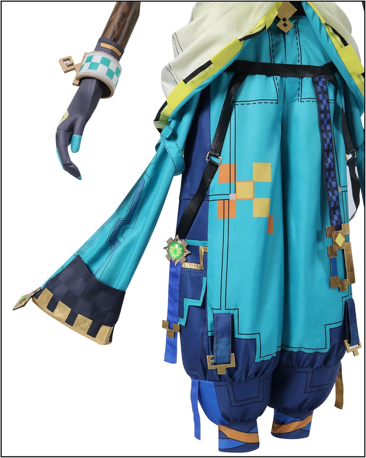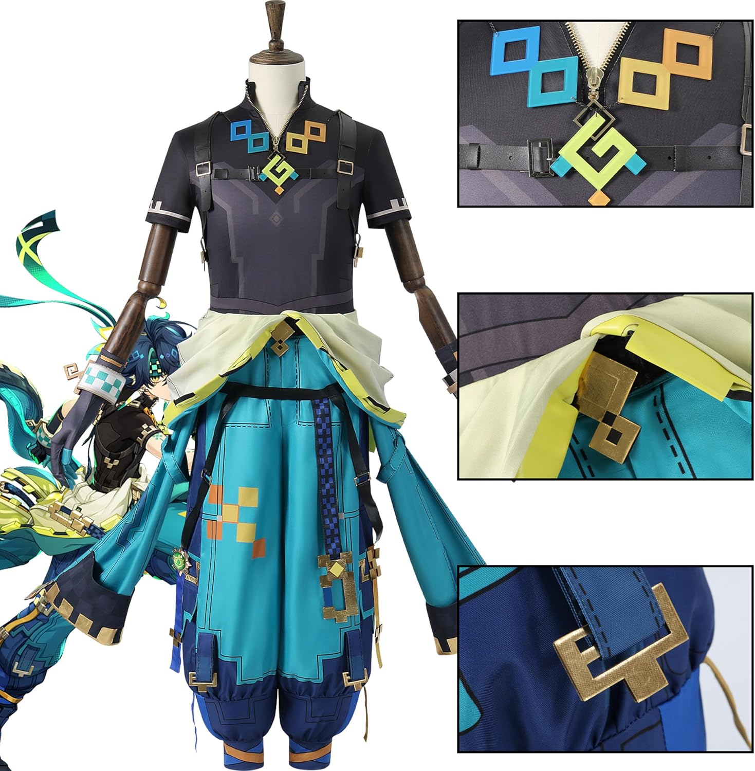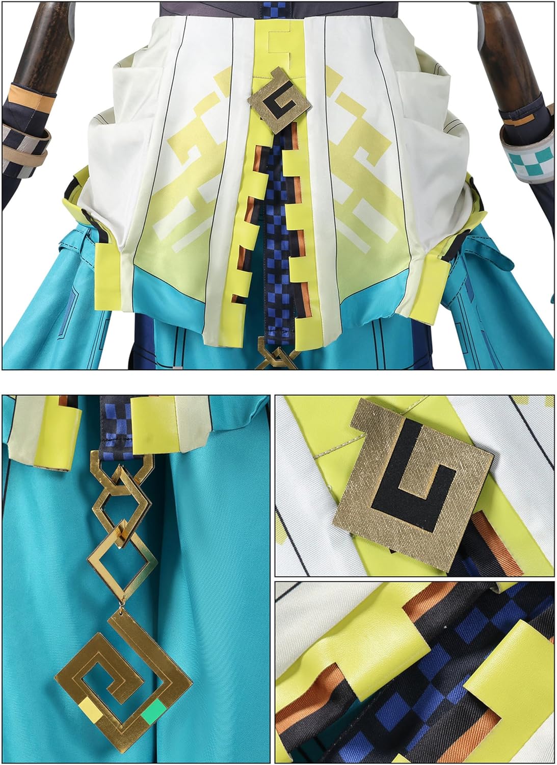Immergiti nel mondo del cosplay con questo straordinario costume Kinich, un capolavoro di design e dettagli. Il completo presenta una combinazione accattivante di colori blu navy e turchese, arricchita da eleganti motivi geometrici dorati. Il costume include una parte superiore nera con dettagli decorativi sul colletto, una gonna-pantalone turchese con sovrapposizioni in tessuto chiaro e giallo, e pantaloni blu navy con decorazioni geometriche. Gli accessori distintivi includono fibbie dorate, elementi decorativi geometrici multicolore e una spilla decorativa verde. Ogni elemento è stato realizzato con attenzione ai dettagli, dalle cuciture precise alle applicazioni geometriche. Il design unico combina elementi moderni e fantastici, perfetto per eventi di cosplay o convention. La costruzione accurata garantisce comfort durante l'uso prolungato. Il costume presenta anche dettagli come cinghie regolabili e chiusure strategicamente posizionate per una vestibilità ottimale. I materiali utilizzati offrono una bella resa visiva mantenendo la praticità necessaria per questo tipo di abbigliamento.
