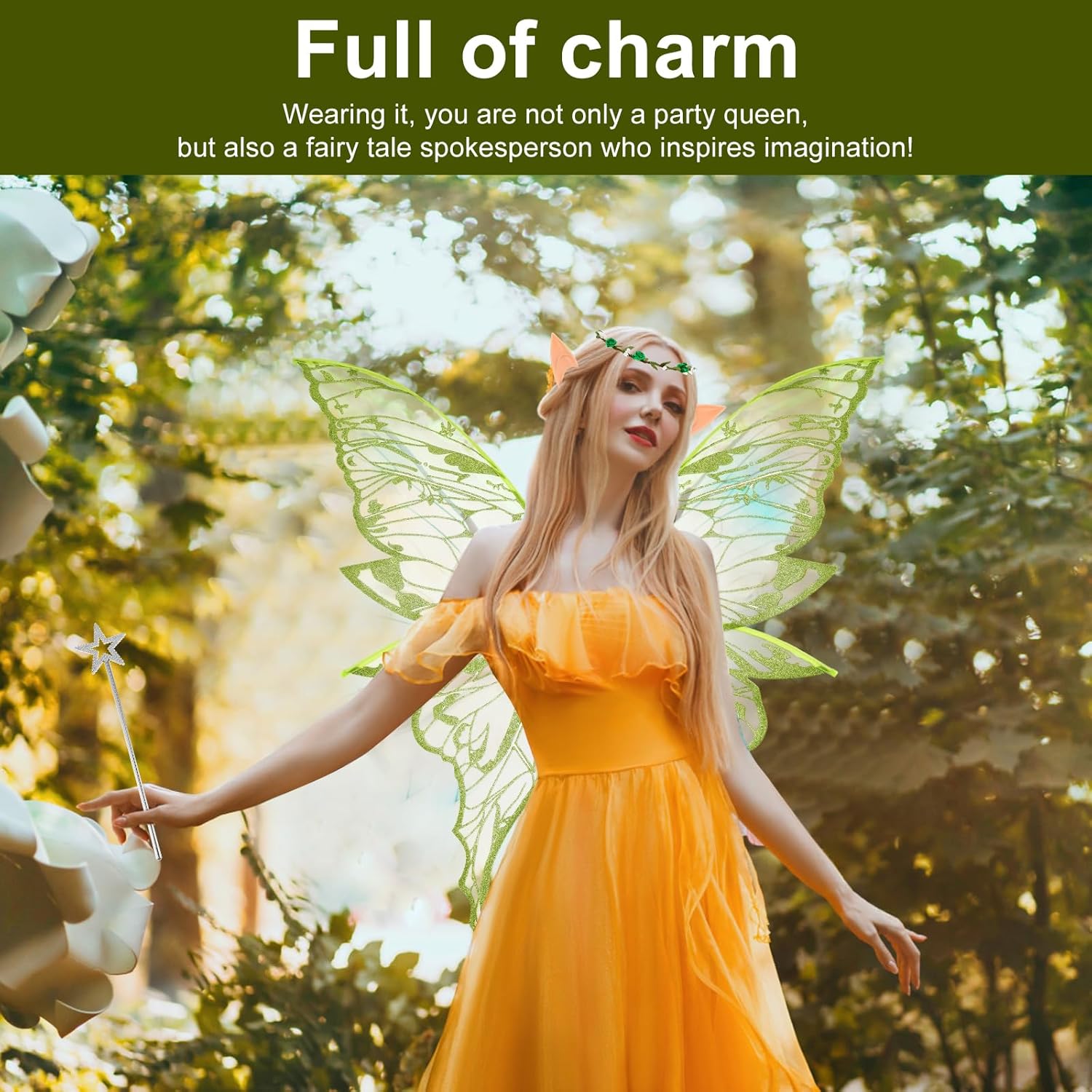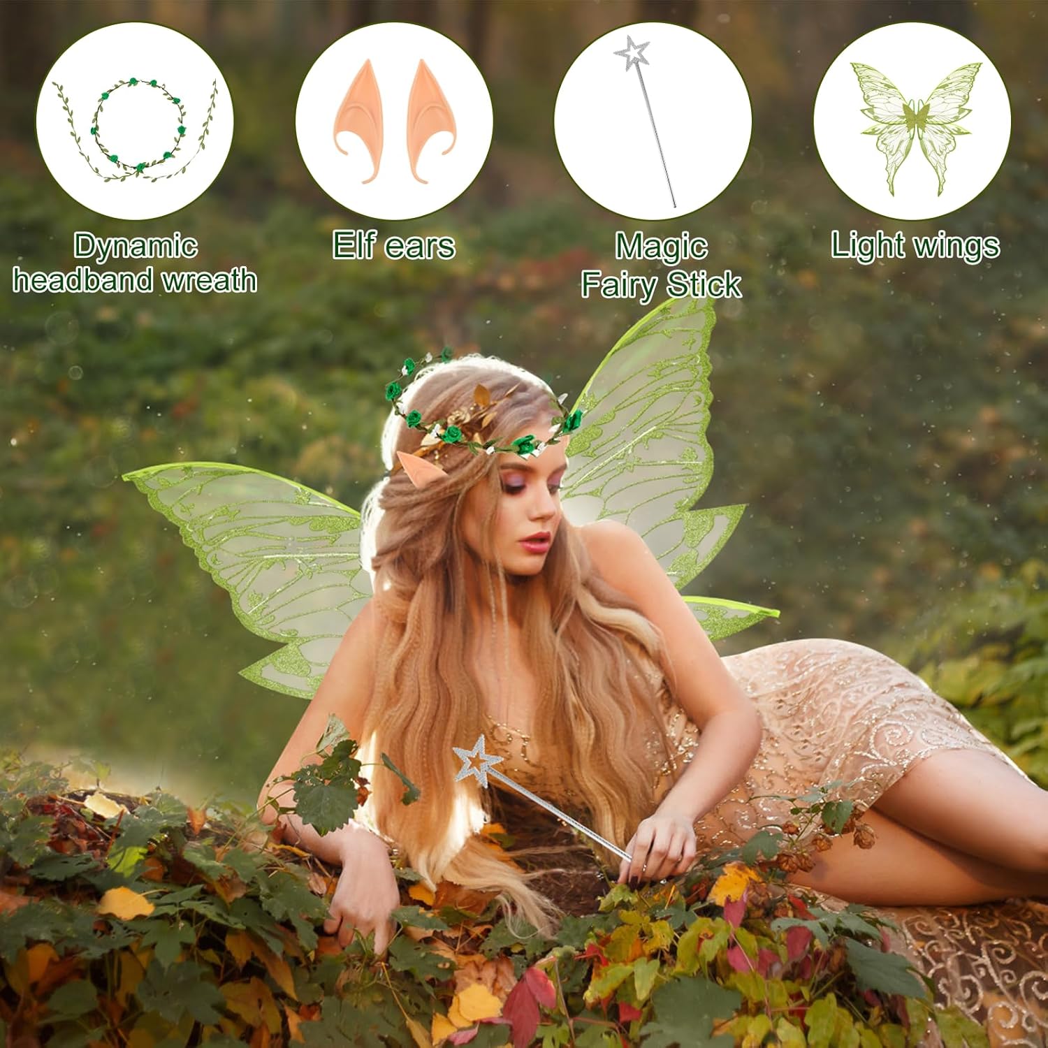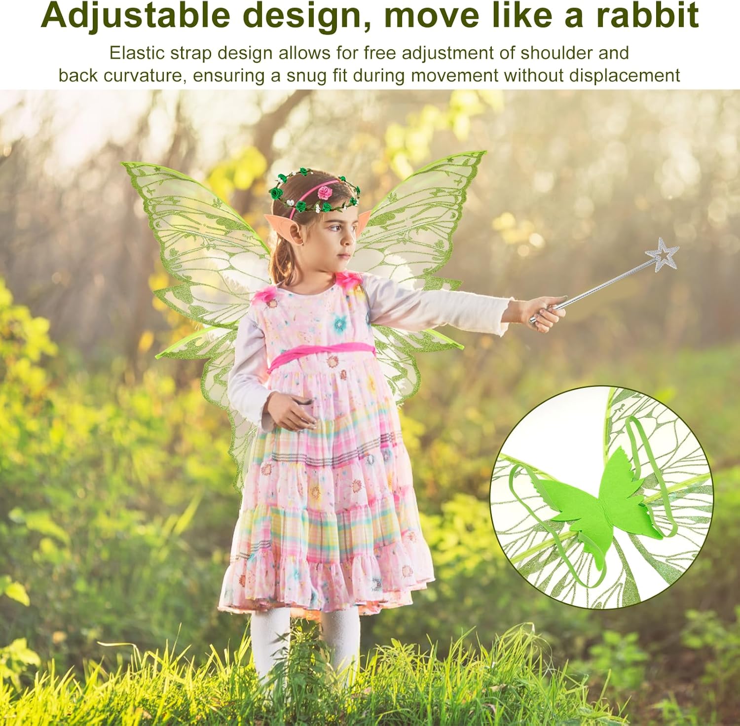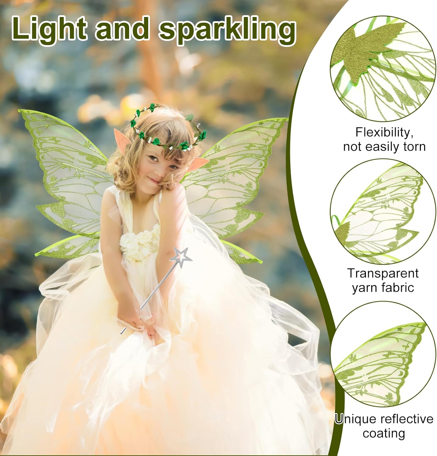 Set di costumi con ali di fata magica: questo set di costumi con ali di fata è progettato per fate grandi e piccole. Con le ali luminose, un'elegante ghirlanda per capelli, orecchie da elfo e una bacchetta magica, ti trasformerai in modalità favola con un solo clic. Che si tratti di una festa o di un momento di fantasia quotidiana, indossalo e cattura gli occhi della folla con la tua aureola. Materiale fantastico, leggero e brillante: questo set di costumi con ali di fata è realizzato in garza trasparente di alta qualità, flessibile e resistente agli strappi, sembra piume. L'esclusivo rivestimento riflettente fa fluire le ali nella luce come la luce delle stelle, come se colpissero e volassero con le ali in qualsiasi momento. Che si tratti di un elfo della foresta da favola o di un'elegante fata farfalla, questo costume magico ti trasforma in un batter d'occhio in una figura da favola. Design regolabile: il design della cinghia elastica consente la regolazione continua della curvatura delle spalle e della schiena e garantisce una vestibilità sicura durante l'allenamento. Le ali oscillano naturalmente con i movimenti - Correre, saltare e persino rotolare sono stabili come una roccia Ali piene di sogni, piene di fascino: dalla fata delle farfalle alla principessa del ghiaccio, ciascuna delle tue trasformazioni delizierà il pubblico! Lo squisito copricapo e la bacchetta magica aggiungono storia ad ogni mossa. Sorpresa natalizia, scelta calda: elfi notturni di Halloween, fate della neve di Natale, principesse fantasy per la festa di compleanno. Questa scena del costume con ali di fata può essere risolta con questo set. Regalalo ai tuoi migliori amici/bambini e fai brillare i loro cuori da favola con questa radiosa sorpresa. Fai risplendere ogni momento importante con questo regalo magico