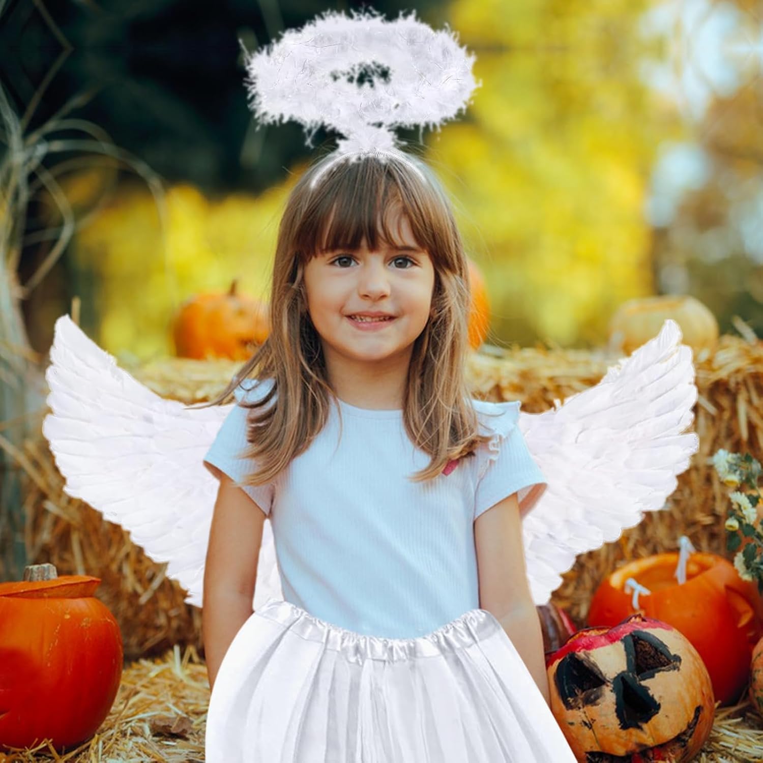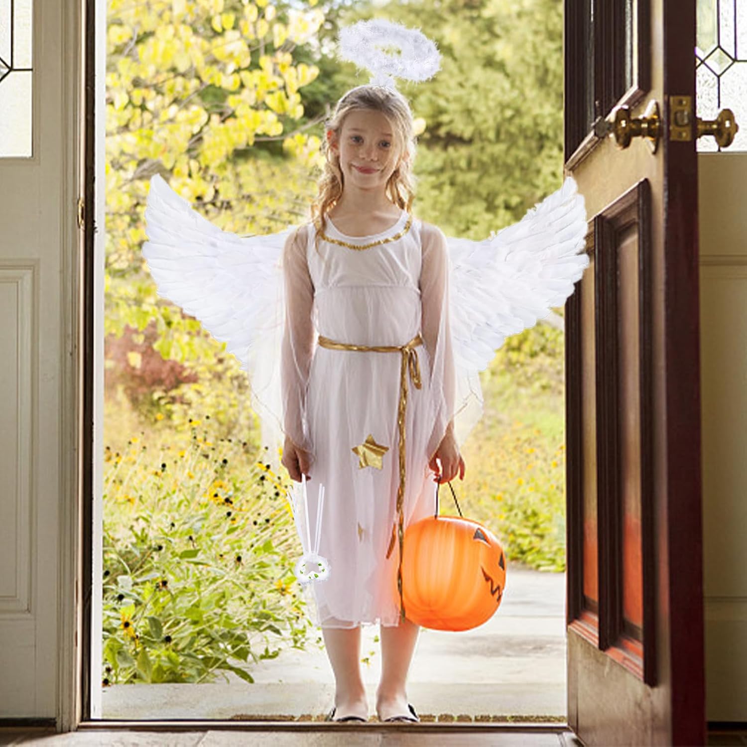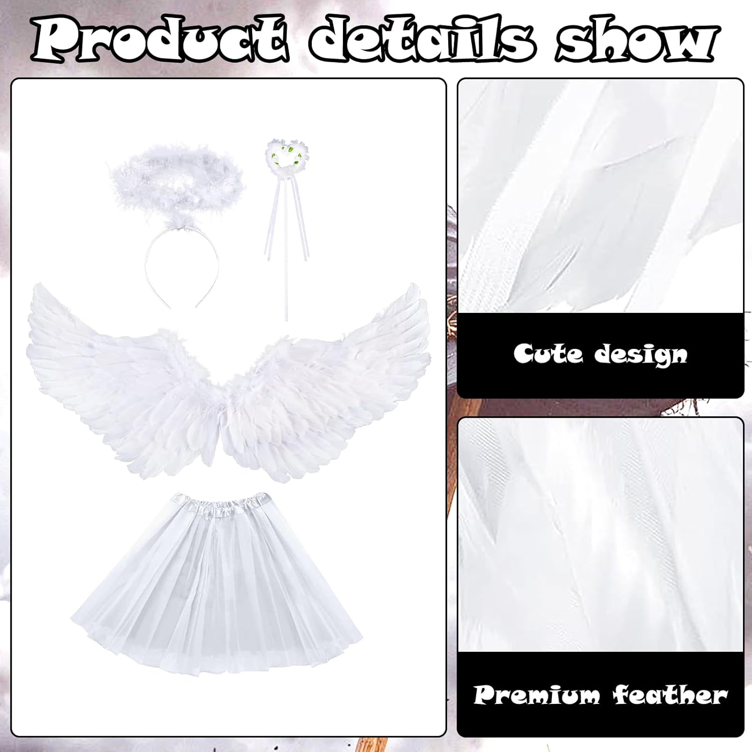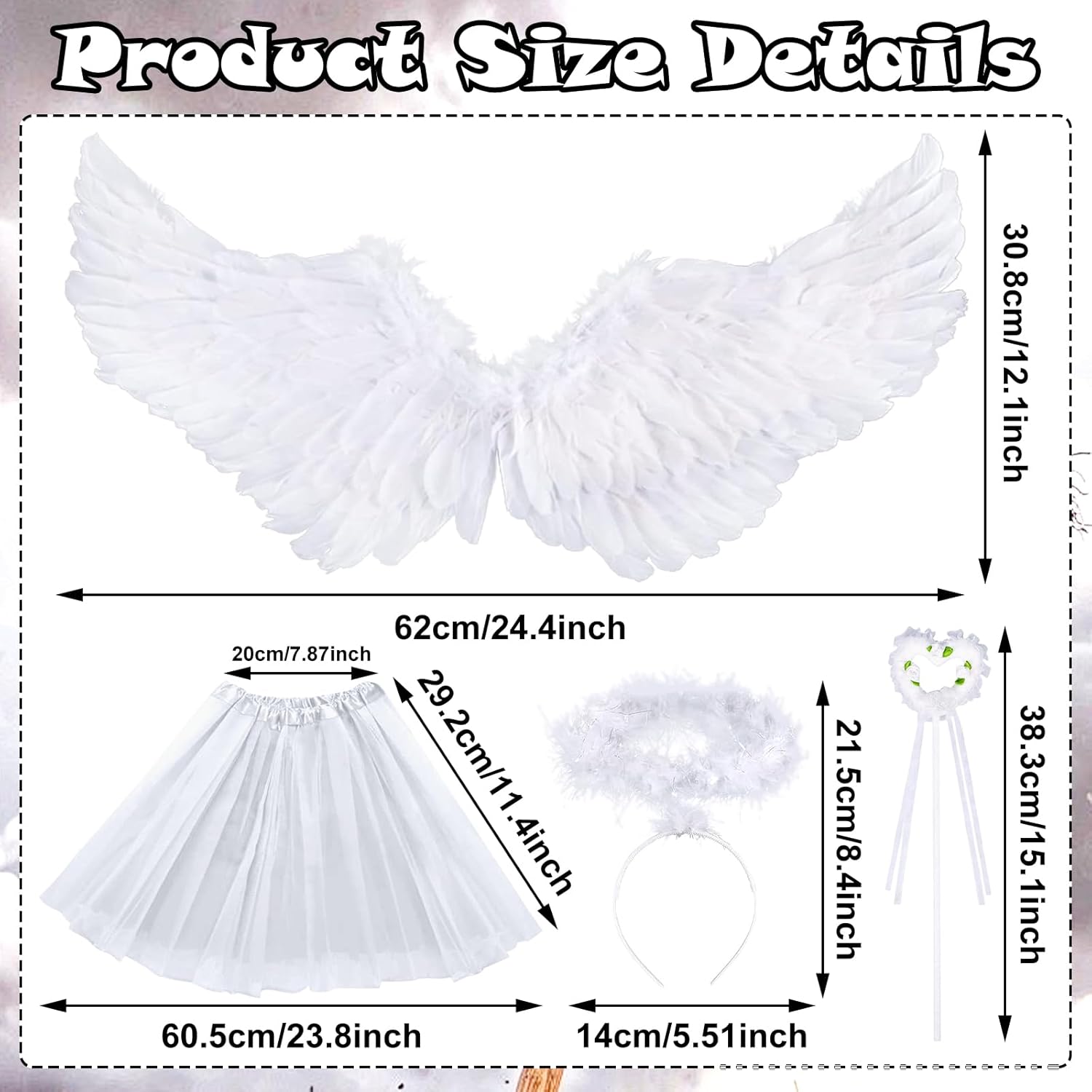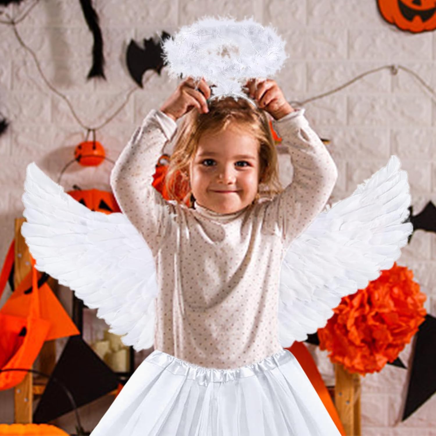 Descrizione prodotto Questo costume da angelo di Halloween comprende una gonna da ballo bianca, ali, un cerchietto per capelli e una bacchetta magica che ti permettono di creare facilmente un completo completo outfit. Le ali d'angelo sono decorate con lussureggianti piume lucide, la gonna è realizzata in morbido poliestere sottile ed è comoda e resistente. Le ali hanno un'apertura alare di 60 cm e un'altezza di 32 cm, la gonna è di circa 30 cm di lunghezza, si adatta alla maggior parte dei bambini e degli adulti. Ideale per Halloween, Natale e altre feste, giochi di ruolo e servizi fotografici, nonché come regalo per ragazze. Colore: Bianco Materiale: tessuto. Contenuto: 1 x ali d'angelo + 1 x abito da ballo + 1 x fascia per capelli + 1 x bacchetta magica. Avvertenze: Misurazione manuale, si prega di considerare un margine di tolleranza di 1-2 cm. A causa della luce e dello schermo, il colore dell'articolo reale potrebbe essere leggermente diverso dalle immagini. Grazie per la comprensione. Avviso di sicurezza no