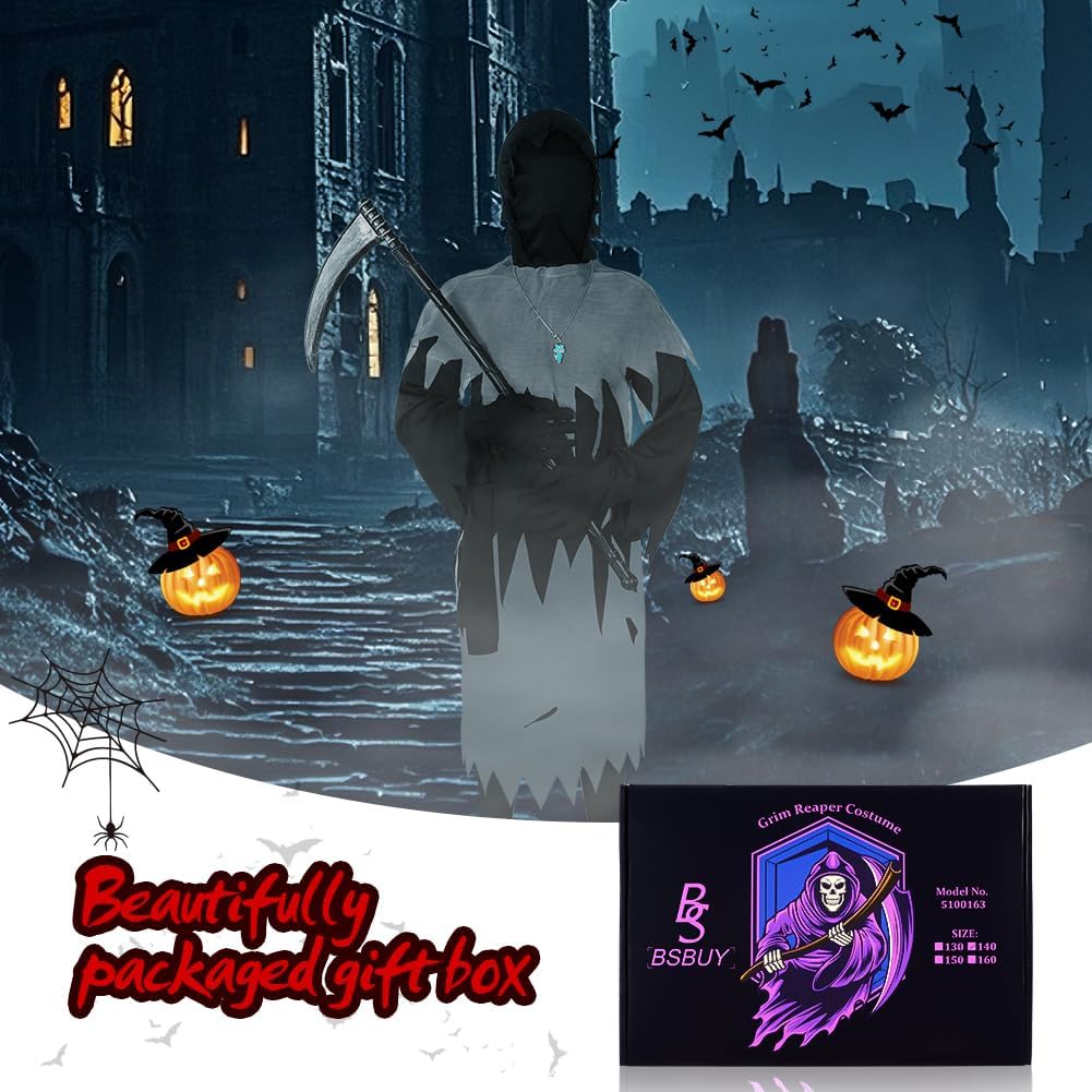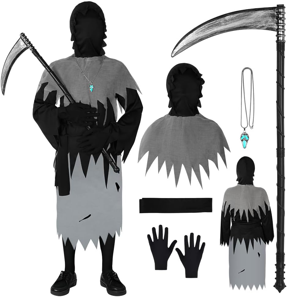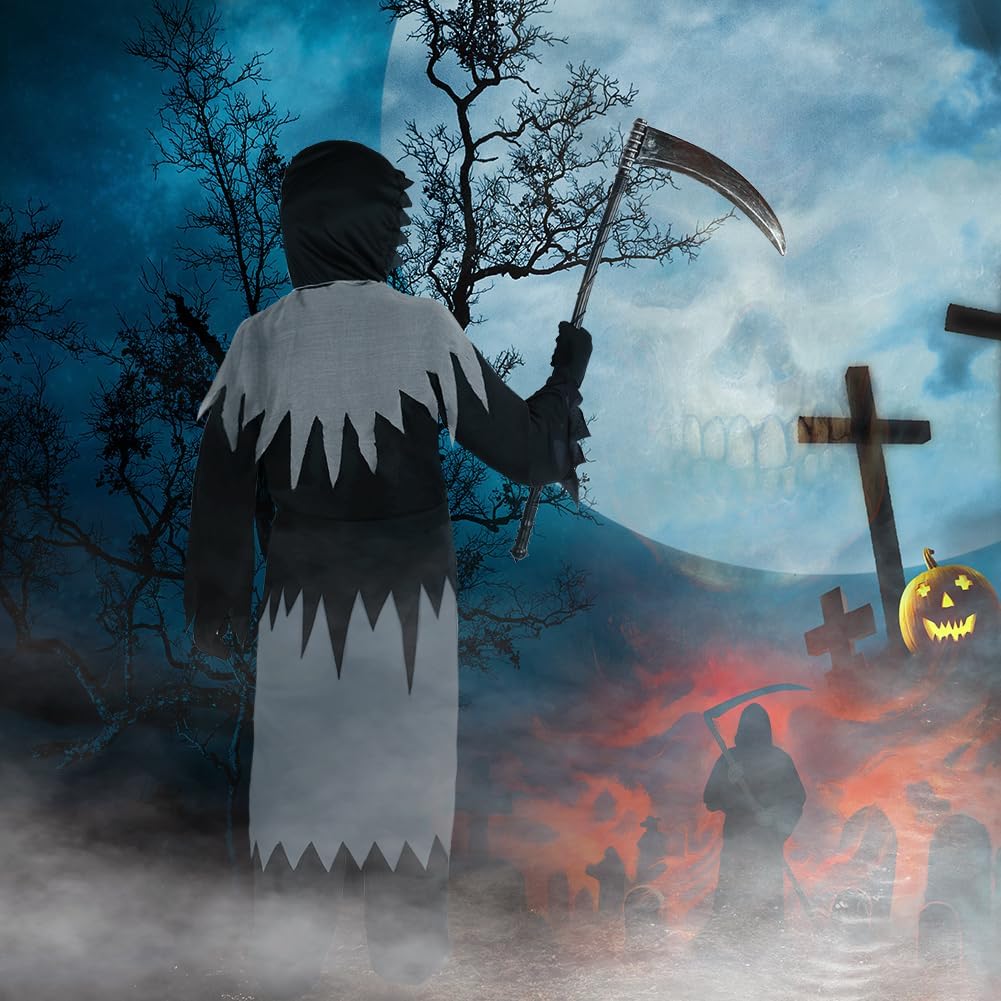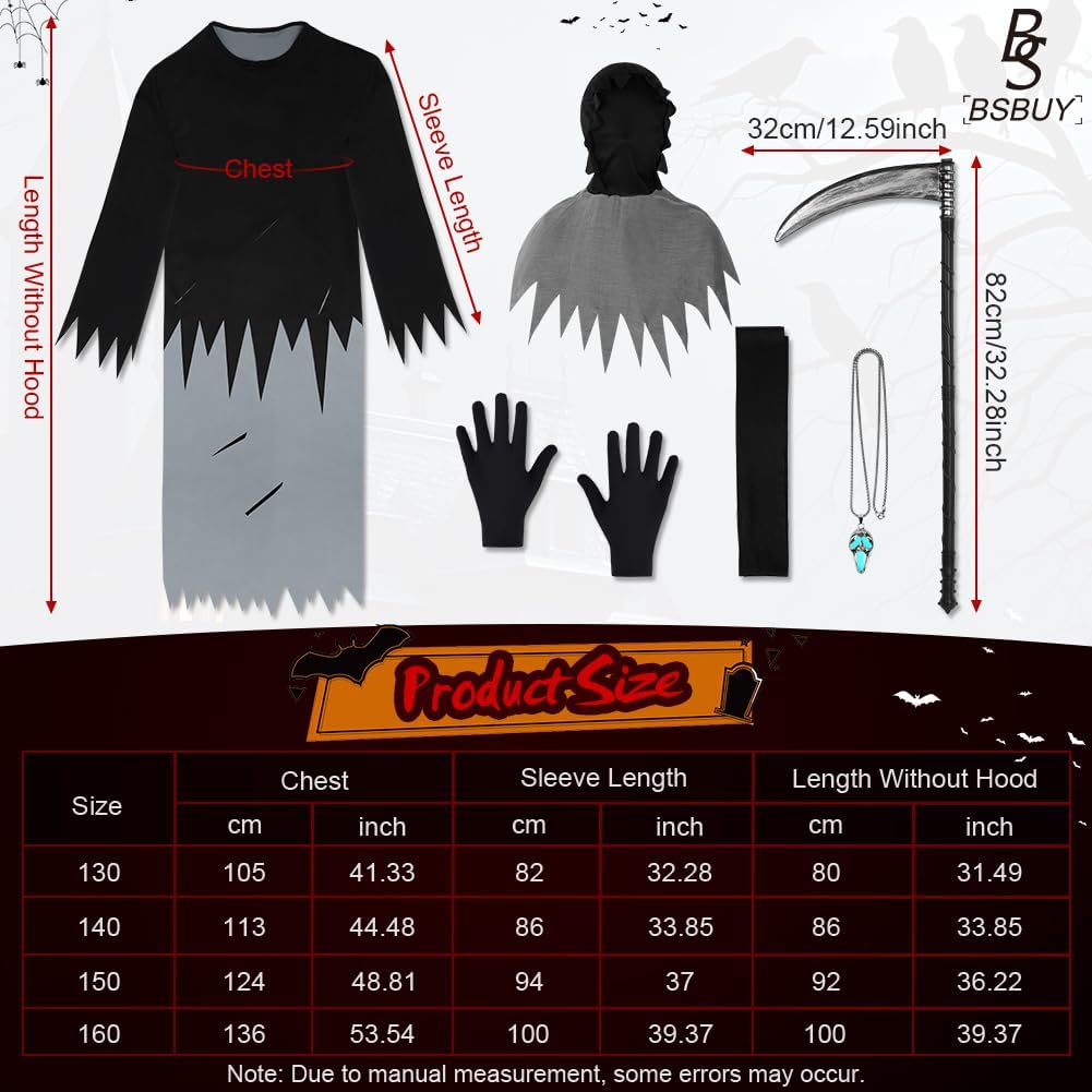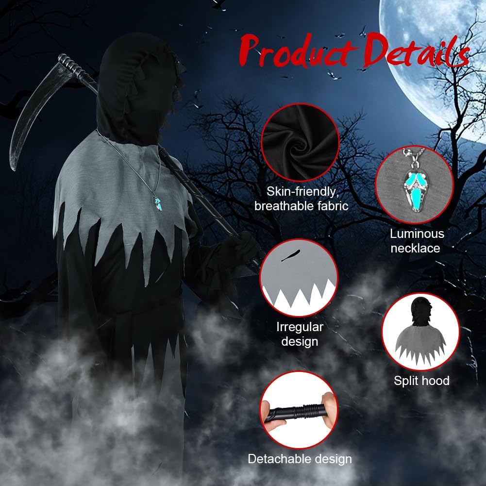 Costume Da Falce Del Tristo Mietitore: Riceverai un set di sei pezzi con la Falce del Tristo Mietitore, tra cui una tunica con cappuccio, guanti, una cintura, una Falce del Tristo Mietitore, una collana fosforescente e un cappello nero. Questi costumi da fantasma sono disponibili in una varietà di stili per soddisfare le tue esigenze e creare un look unico. Design Monopezzo: Ogni costume da Tristo Mietitore di Halloween presenta un design monopezzo, che lo rende facile e veloce da indossare e da togliere, anche per ballare e posare. Consulta la tabella delle taglie nelle immagini prima di ordinare per selezionare la taglia giusta. Facile Da Trasportare: Questo giocattolo con la Falce del Tristo Mietitore è staccabile e può essere smontato in quattro lunghezze regolabili, rendendolo facile da montare durante il tuo evento. Tessuto Di Alta Qualità: Questo costume da fantasma urlante è realizzato in 100% poliestere, traspirante e confortevole, con ampia elasticità per una vestibilità comoda. Questa tunica da Mietitore presenta un'immagine inquietante del Mietitore e maniche con fantasie fantasiose. Occasioni Adatte: Questo spettrale costume da fantasma è perfetto per feste di Halloween, Natale, festival letterari, feste a tema Mietitore, costumi horror, carnevali, cosplay del Mietitore, feste a tema e balli in maschera. È anche un ottimo regalo per bambini e bambine.