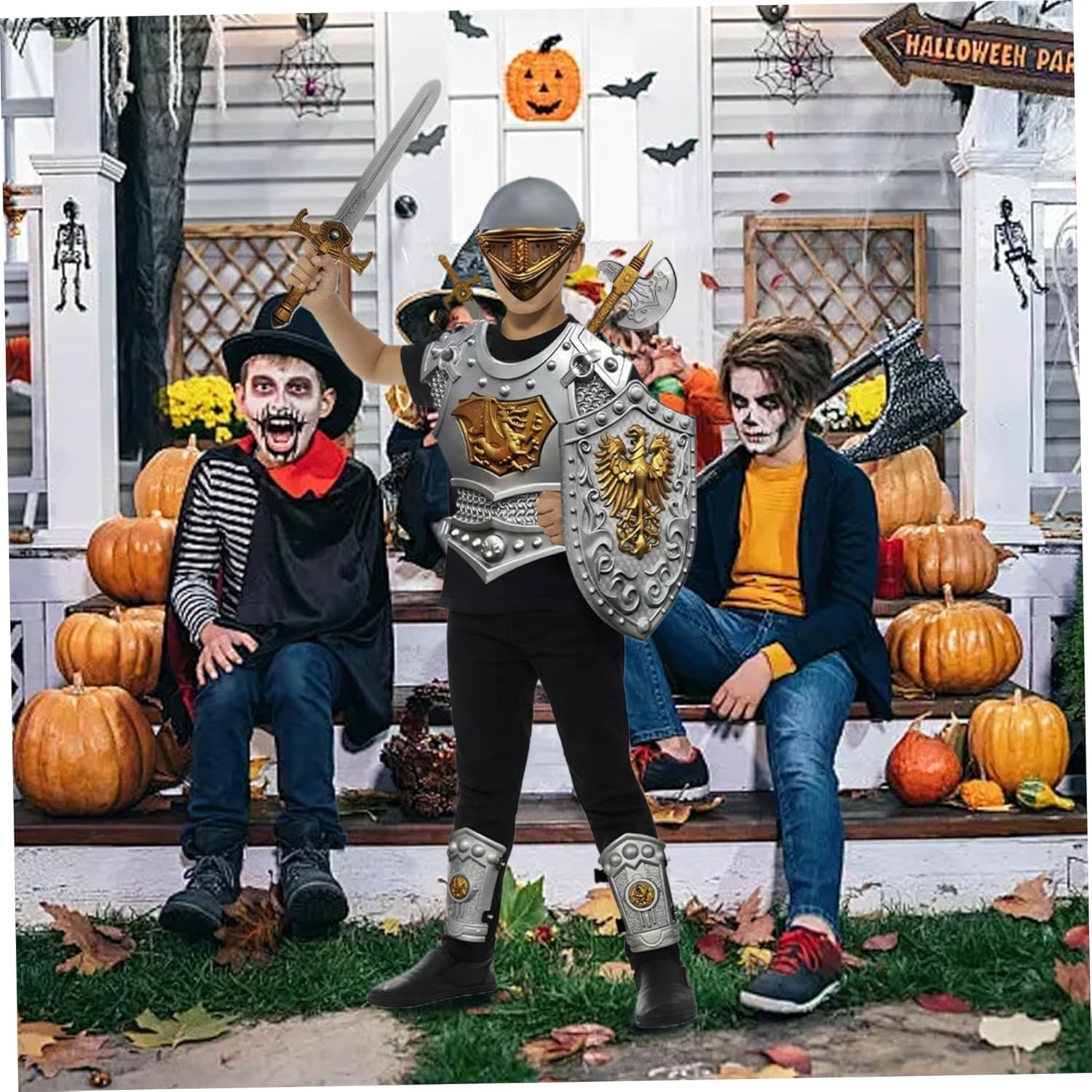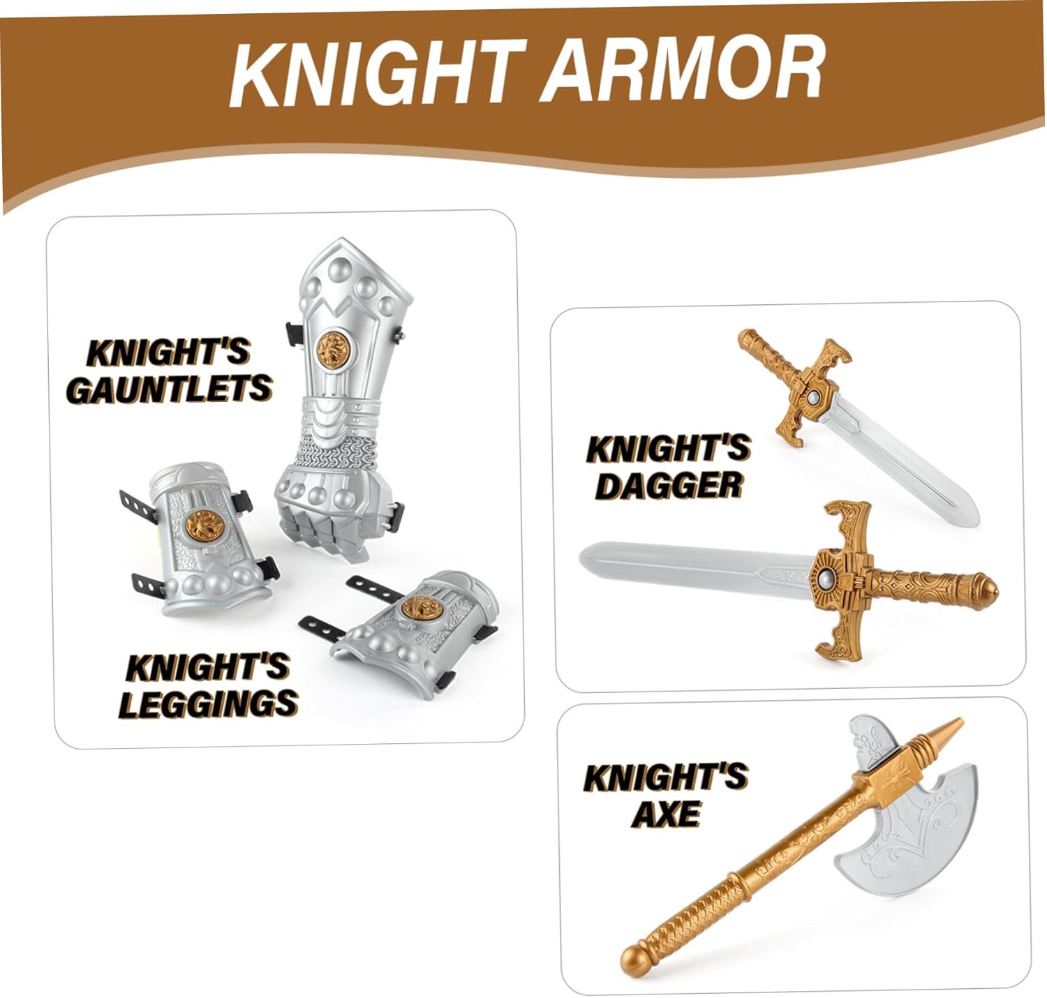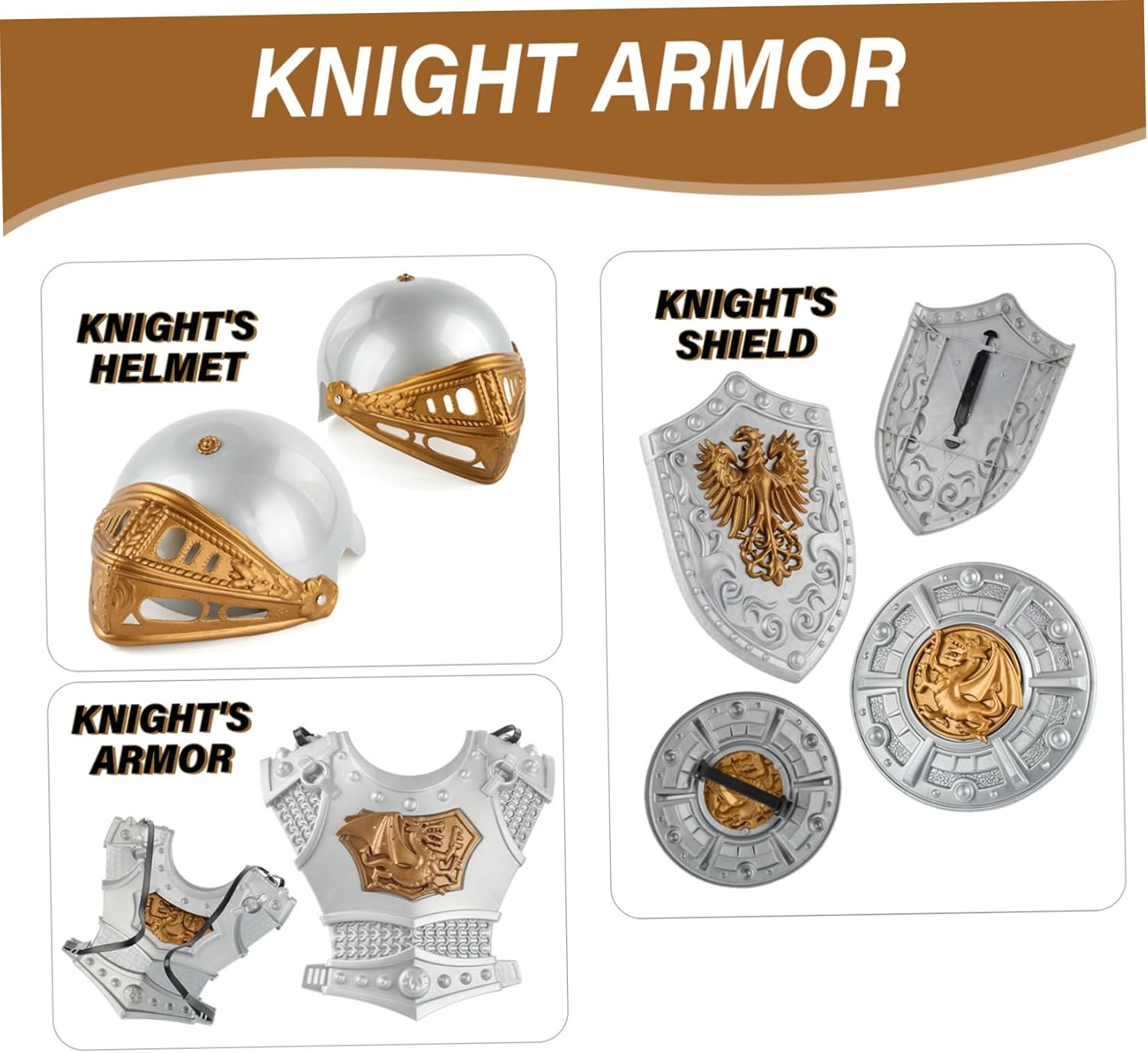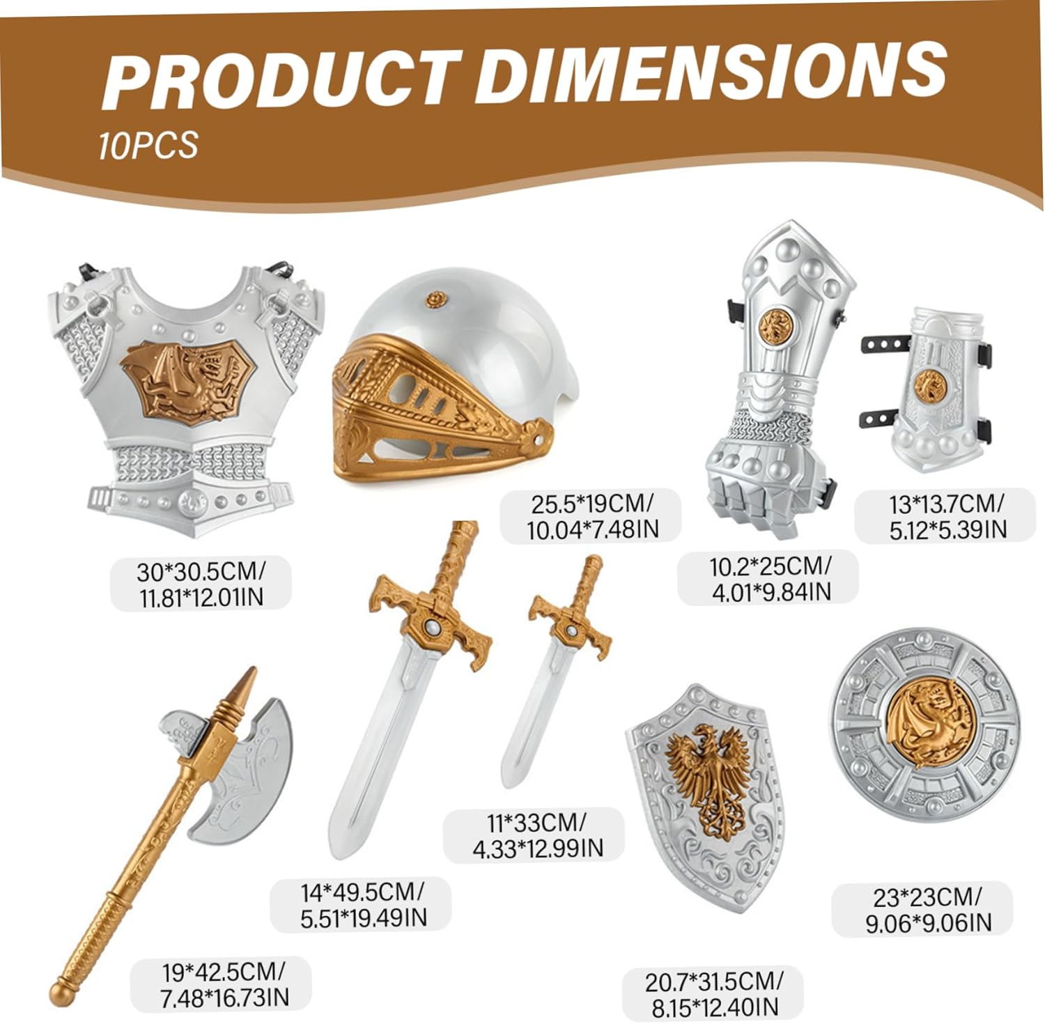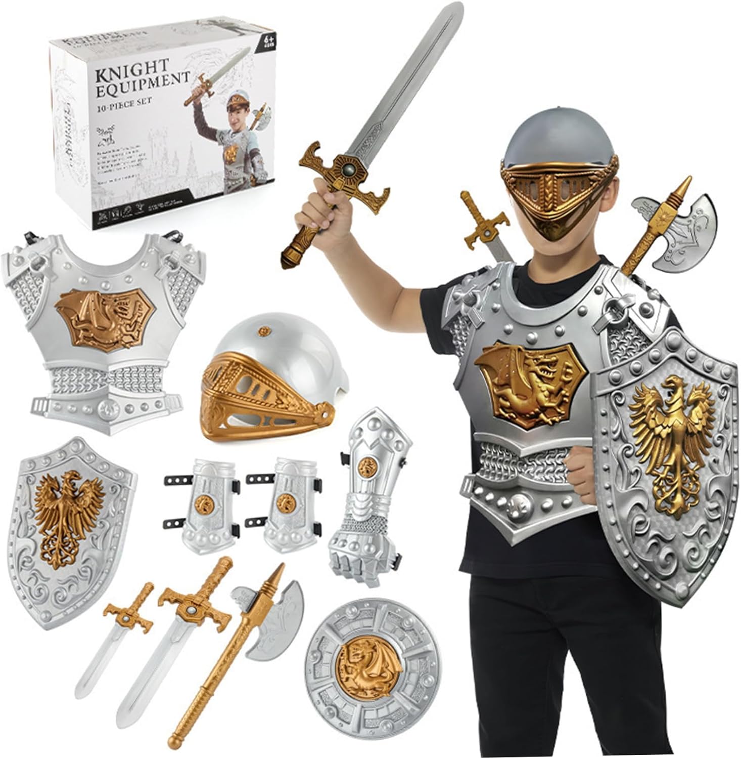 Set completo: il set di armature Knight comprende 10 pezzi, come un casco, scudo, spade, ascia, pugnale, guanti, braccialetti e armature toraciche..Fornisce tutto ciò di cui il bambino ha bisogno per una trasformazione rapida e completa. Costume Knight Kids Knight Armor Ottimo costume per bambini: questo brillante costume per cavalieri medievali per bambini consente loro di trasformarsi in un cavaliere potente e nobile, aiutando a realizzare le loro avventure fantasiose di gioco..Knight Armor Knight Costume Materiale di qualità: realizzato in materiale plastico resistente all'usura e robusto, questo costume da cavaliere è costruito per durare..È facile da mantenere, resistente alla deformazione e ha una finitura lucida, rendendolo visivamente attraente..Knight Costume Medieval Armatura Uso ampio: questo costume da cavaliere è l'ideale per varie occasioni, tra cui Halloween, feste, esibizioni sul palcoscenico e gioco di ruolo..Incoraggia il gioco fantasioso e consente ai bambini di immergersi nel mondo dei cavalieri e delle avventure medievali..Costume da armatura medievale per bambini Una taglia unica si adatta alla maggior parte: l'armatura Knight for Kids offre un design di dimensioni gratuite che è adatto ai bambini e adatto alla maggior parte dei ragazzi..Garantisce una vestibilità comoda e un movimento facile durante il gioco..Costume per bambini i bambini vestono costumi