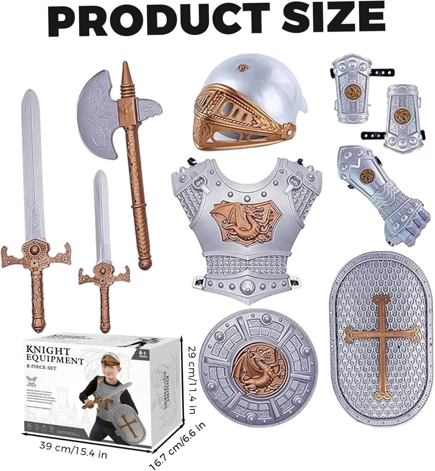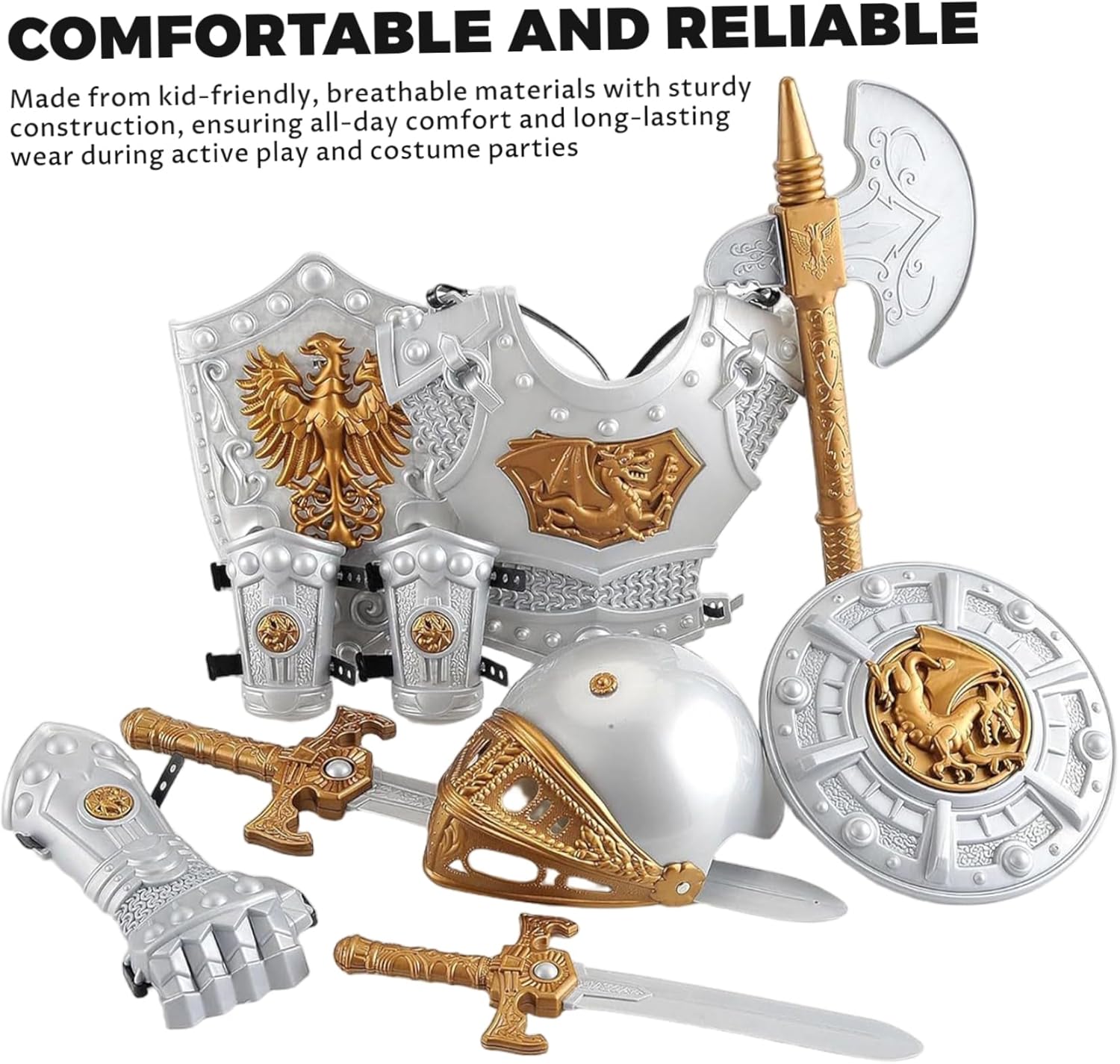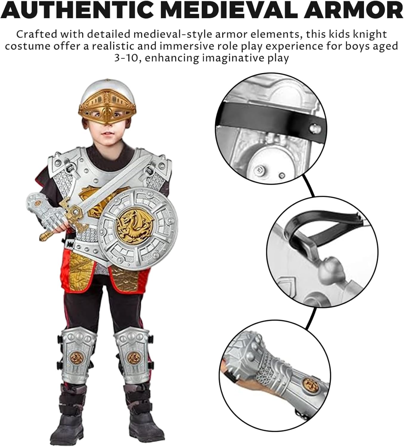 Comodo e affidabile: realizzato con materiali traspiranti adatti ai bambini con struttura robusta, garantisce comfort per tutto il giorno e usura duratura durante il gioco attivo e le feste in costume Set completo del cavaliere: include un elmo, uno scudo, una spada e accessori, fornendo tutto il necessario per un'avventura di travestimento reale completa, aumentando il valore e il coinvolgimento dei bambini Vestibilità perfetta e regolabile: progettato per adattarsi ai bambini dai 3 ai 10 anni con spalline regolabili e dimensioni flessibili, per accogliere i bambini in crescita e garantire facilità di indossare e rimuovere Autentica armatura medievale: realizzata con dettagliati elementi di armatura in stile medievale, questo costume da cavaliere per bambini offre un'esperienza di gioco di ruolo realistica e coinvolgente per ragazzi dai 3 ai 10 anni, migliorando il gioco fantasioso Divertimento versatile travestimento: ideale per Halloween, feste a tema, recite scolastiche e giochi fantasiosi di tutti i giorni, incoraggiando la creatività e la fiducia attraverso il gioco di ruolo di personaggi storici
