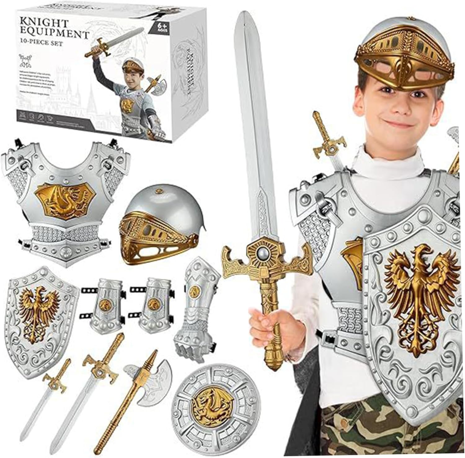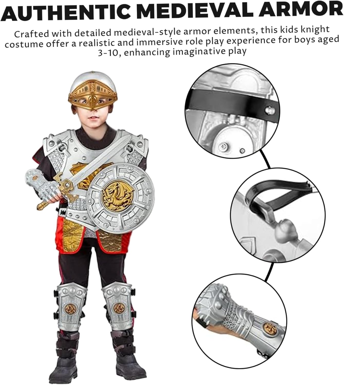 Vestibilità perfetta e regolabile: progettato per adattarsi ai bambini dai 3 ai 10 anni con spalline regolabili e dimensioni flessibili, per accogliere i bambini in crescita e garantire facilità di indossare e rimuovere Divertimento versatile travestimento: ideale per Halloween, feste a tema, recite scolastiche e giochi fantasiosi di tutti i giorni, incoraggiando la creatività e la fiducia attraverso il gioco di ruolo di personaggi storici Comodo e affidabile: realizzato con materiali traspiranti adatti ai bambini con struttura robusta, garantisce comfort per tutto il giorno e usura duratura durante il gioco attivo e le feste in costume Set completo del cavaliere: include un elmo, uno scudo, una spada e accessori, fornendo tutto il necessario per un'avventura di travestimento reale completa, aumentando il valore e il coinvolgimento dei bambini Autentica armatura medievale: realizzata con dettagliati elementi di armatura in stile medievale, questo costume da cavaliere per bambini offre un'esperienza di gioco di ruolo realistica e coinvolgente per ragazzi dai 3 ai 10 anni, migliorando il gioco fantasioso