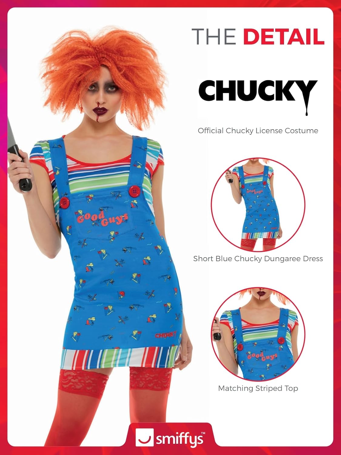 Include il costume blu di Chucky con top e tuta corta. Tieni presente che tutti i prodotti Smiffys vengono sempre forniti in una confezione con il logo Smiffy.