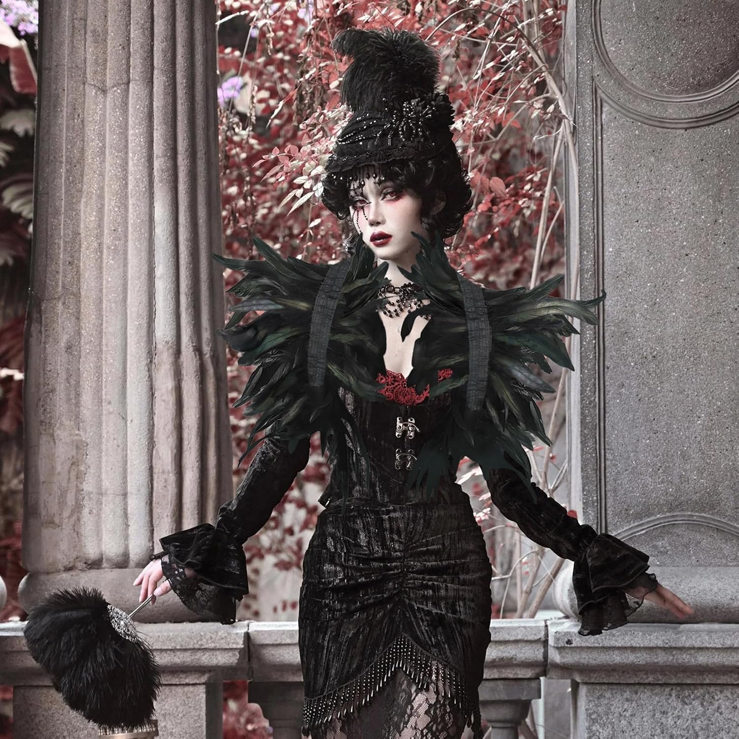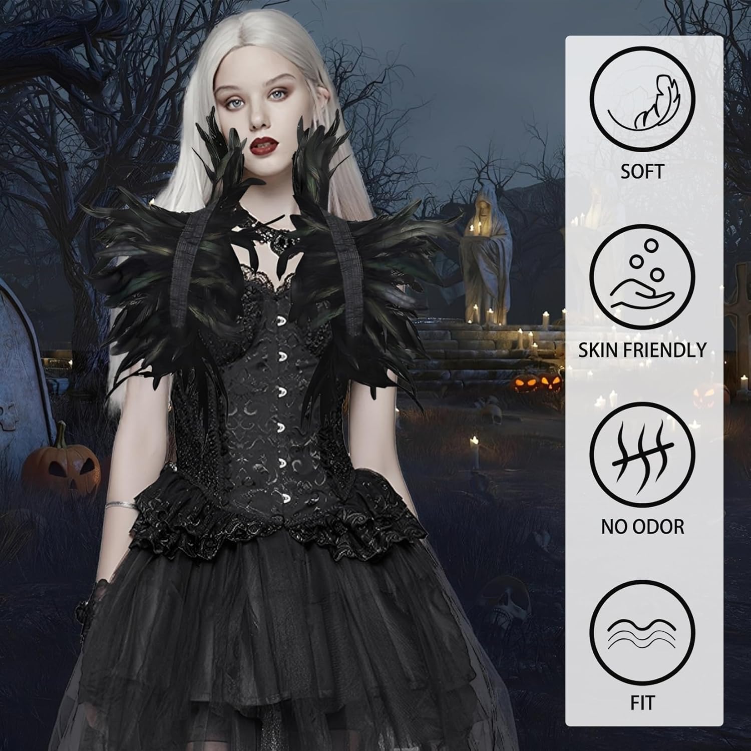 Aspetto elegante: il lussuoso design con piume nere conferisce al costume un aspetto impressionante. Nella luce, le piume brillano e fanno "ballare" il costume Tessuto di alta qualità: il nostro costume da corvo è composto da piume accuratamente selezionate e prive di odori che non prurito. I colori delle piume sono vivaci e corrispondono esattamente alle immagini Facile da indossare e da togliere. Questo costume da corvo da donna è facile da indossare. Basta gettarlo sulle spalle e fissarlo con le due fasce nere lisce sul retro Portatile compatta: il design leggero del mantello nero può essere facilmente riposto in una piccola borsa, ideale per i viaggi o per la conservazione Utilizzo versatile: perfetto per Halloween, cosplay, feste in maschera, feste di vampiro e carnevale. Crea il tuo costume da corvo unico con questo splendido mantello di piume