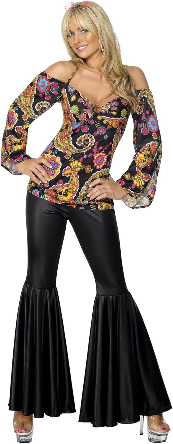 Ein tolles Kostüm! Ich trage normalerweise Größe 40, habe das Kostüm in M bestellt und es passte perfekt. Der Stoff der Hose ist dehnbar, so dass man sie wohl auch bei einer Konfektionsgröße von 38 oder 42 hätte tragen können. Wie schon mehrfach dargestellt, rutscht die Hose leicht, so dass man sich auf jeden Fall eine Befestigung überlegen sollte. ich habe Gürtelschlaufen daran befestigt und einen Gürtel durchgezogen, so hat es prima gehalten. Das Kostüm ist aus einem Satin-Stoff und die Farben sind sehr kräftig. Der Schnitt des Oberteils ist sexy, allerdings ist es bei mir immer ein bisschen hochgerutscht, so dass ich es im Laufe des Abends immer mal wieder runter ziehen musste. Trotz allem: ein tolles Kostüm, das ich jederzeit wieder kaufen würde! Ich wurde auch mehrfach darauf angesprochen! P.S.: Stylingtipp: Ich habe dazu Plateau-Schuhe, eine Lockenperücke mit Stirnband, eine gelbe Hippie-Brille und eine Peace-Kette getragen..