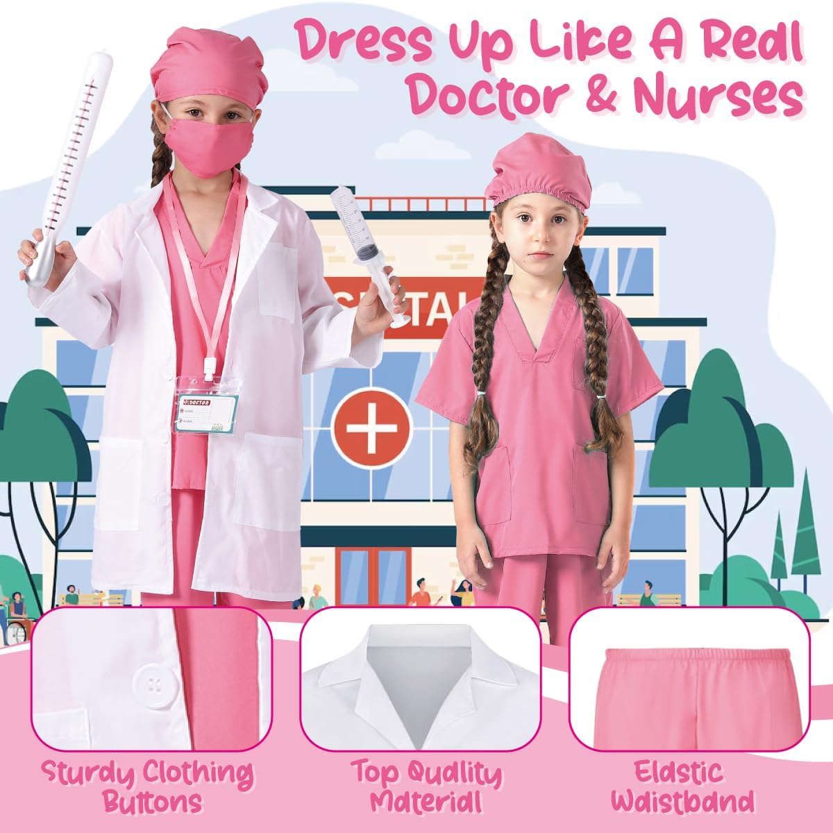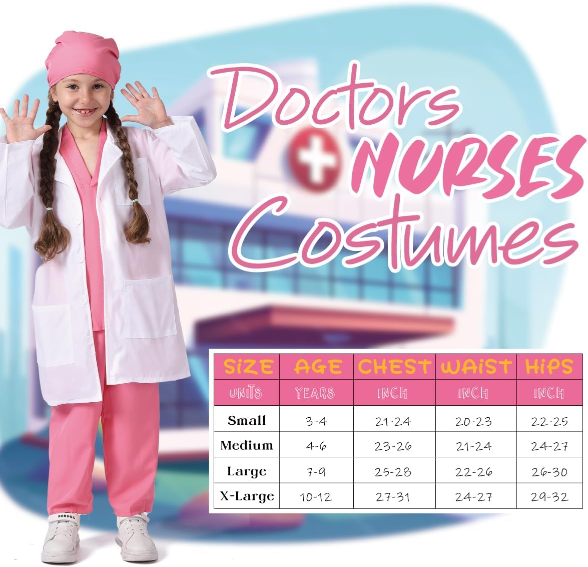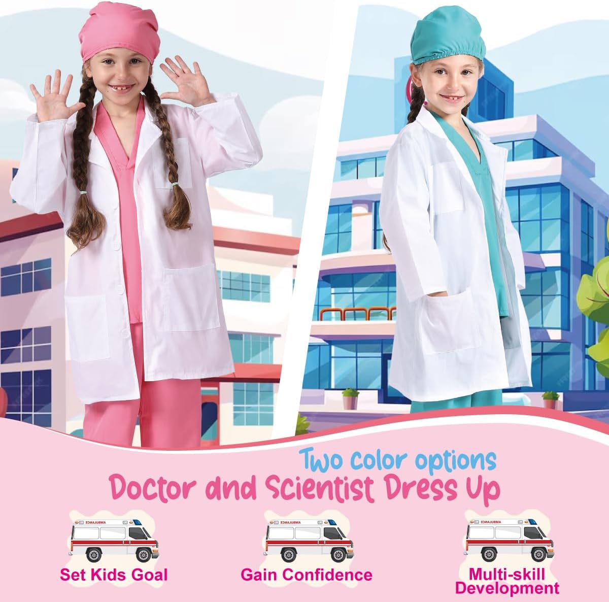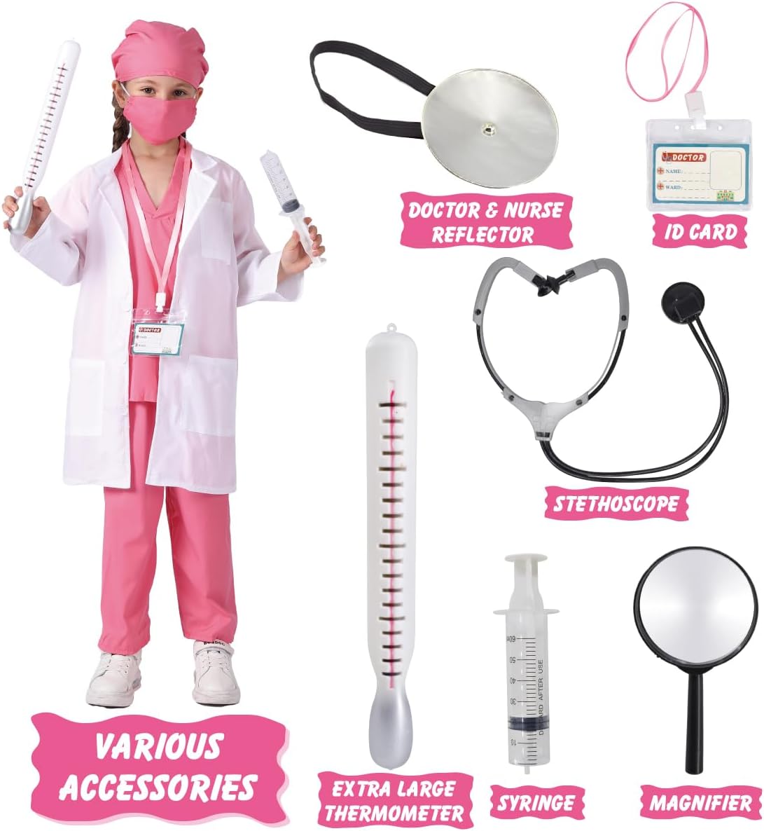 Descrizione prodotto MATERIALE - Poliestere, confortevole e delicato sulla pelle, traspirante e assorbe il sudore, adatto a tutte le stagioni. Dimensioni: quattro misure, adatto per bambini di età compresa tra 3 e 8 anni. Se hai un bambino che vuole diventare un medico un giorno, il set per pediatra è un ottimo regalo per compleanni, festa dei bambini, Natale, Halloween, Ringraziamento e Capodanno e altre occasioni speciali. Giocattolo per stetoscopio davvero funzionante: lo stetoscopio può davvero sentire il battito cardiaco. La parte metallica dello stetoscopio è realizzata in lega di alluminio e la parte in gomma è realizzata in materiale medico, che non è solo facile da usare, ma anche durevole, e il bordo liscio evita lesioni pericolose. Stimola la fantasia: indossa il camice da laboratorio, attacca una foto di te stesso sul documento d'identità, poi indossa gli occhiali e inizia a vedere il paziente. Questo giocattolo educativo può aiutarli a scoprire la creatività, sviluppare capacità di risoluzione dei problemi e migliorare il lavoro di squadra e le capacità di comunicazione. Kit di gioco di ruolo: include 1 camice medico, 1 tuta chirurgica, 1 stetoscopio, 1 kit di pronto soccorso, 1 carta d'identità, 1 montatura per occhiali, 1 cuffia medica, 1 maschera per il viso. Avviso di sicurezza Non adatto a bambini di età inferiore a 3