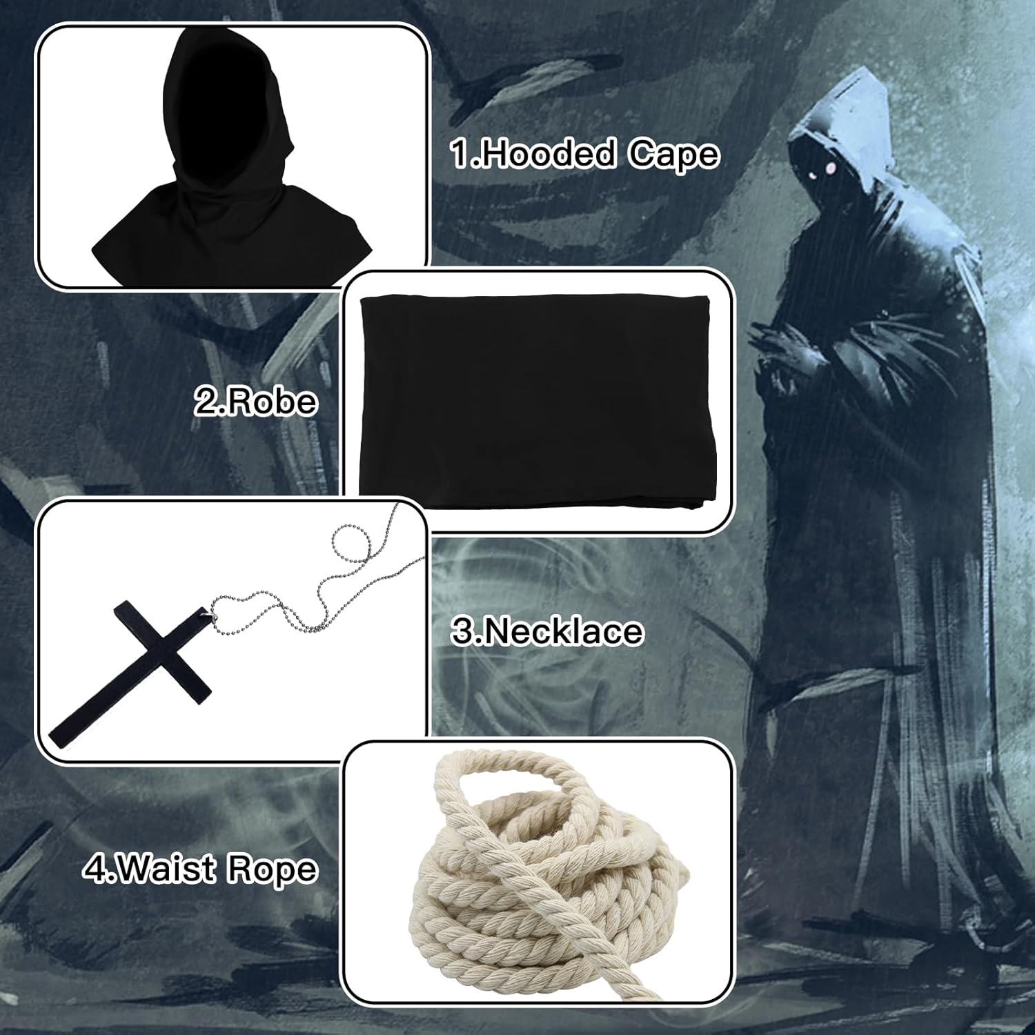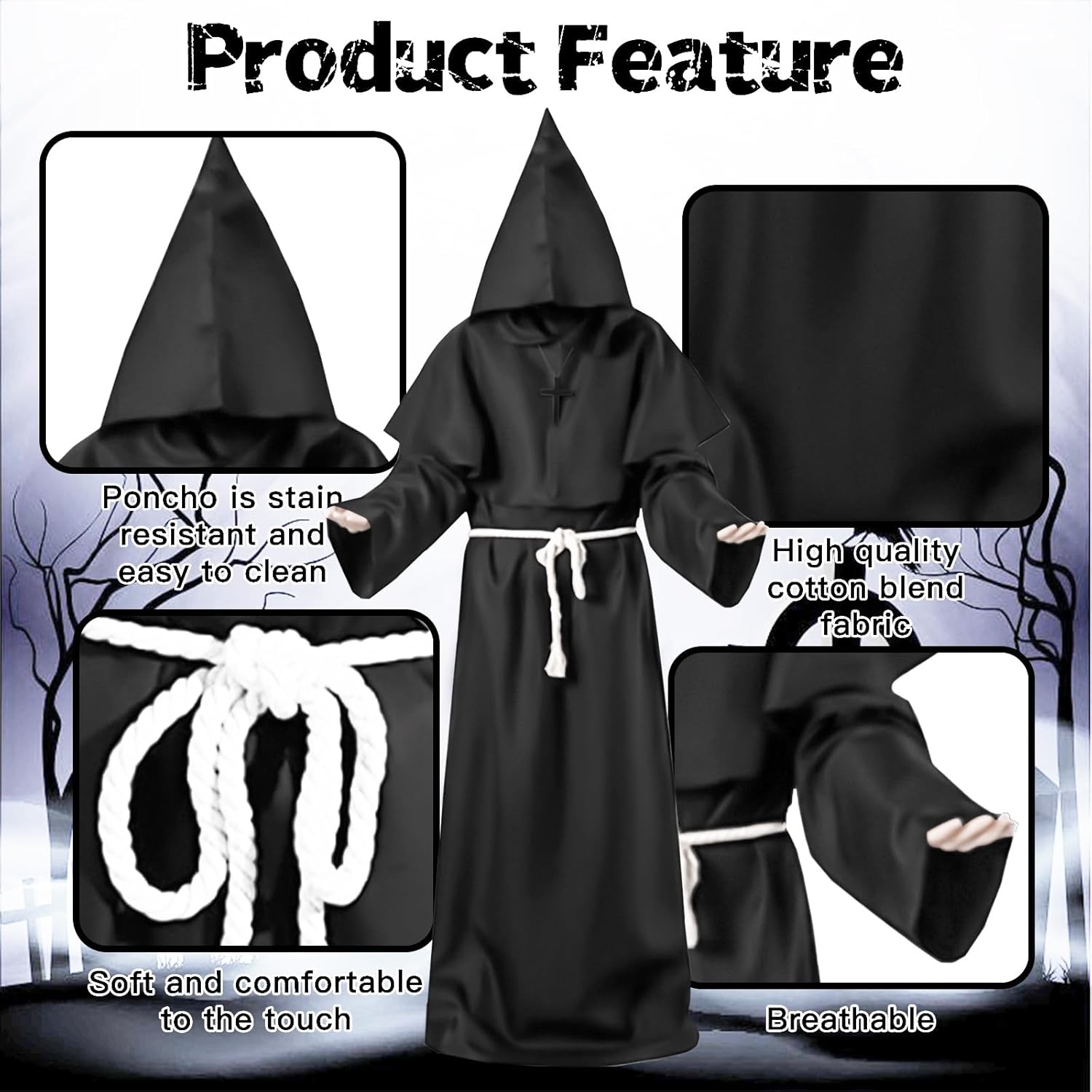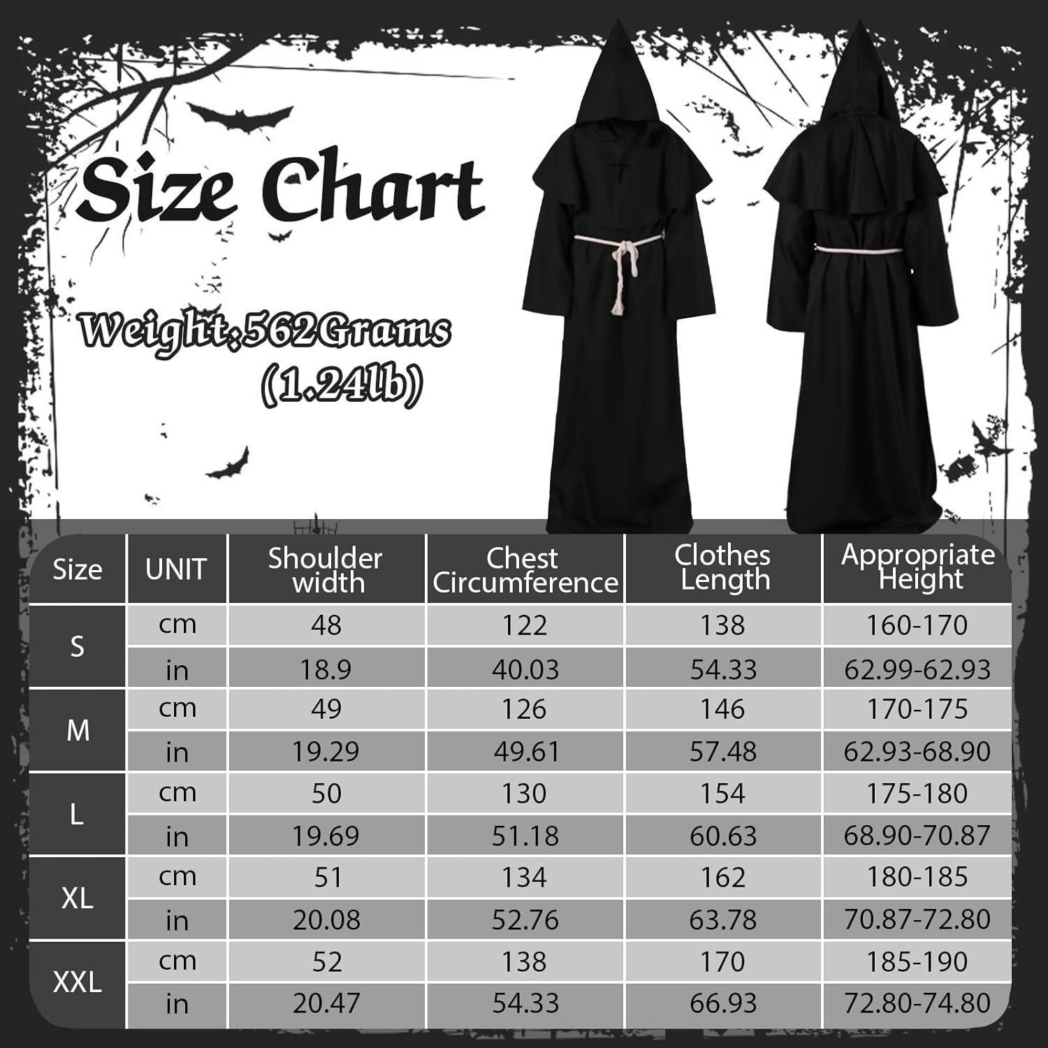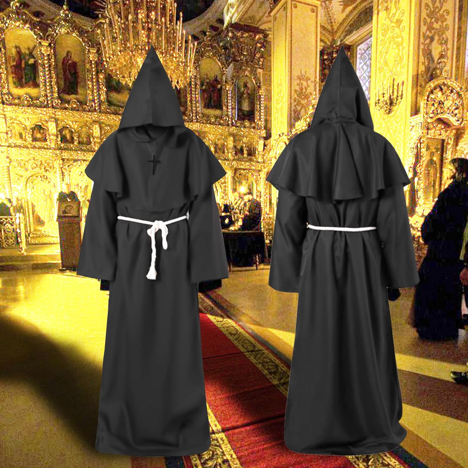 Descrizione prodotto Caratteristiche del prodotto: 1. Sesso illimitato: il design unisex rende questa tuta monaca con cappuccio adatta sia per uomini che per donne. Semplice ed elegante, ripristinando lo stile medievale rinascimentale. 2. Aggiungere un'atmosfera horror: il mantello del costume da monaco è in colori classici e non è facile da vedere al buio. L'orologio può creare un'atmosfera horror durante il festival e lasciare un profondo ricordo. Specifiche: Materiale: poliestere, cotone, legno. Dimensioni confezione: 28,5 x 17 x 5,6 cm (11,22 x 6,69 x 2,02 pollici) Colore: nero Peso: 580,00 grammi (1,28 lb) Il prodotto comprende: 1 vestaglia. 1 mantello. 1 collana con croce. 1 cordino. Attenzione: 1. Misurazione manuale, le dimensioni sono leggermente errate, si prega di capire. 2. A causa delle diverse impostazioni dei monitor, il colore potrebbe essere leggermente diverso, l'immagine è solo di riferimento. Servizio: Ci impegniamo a fornire ai nostri clienti prodotti affidabili e di alta qualità. Se non sei soddisfatto di qualcosa, ti preghiamo di contattarci e Avviso di sicurezza No