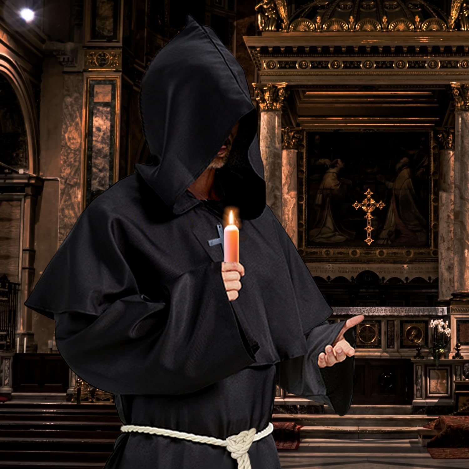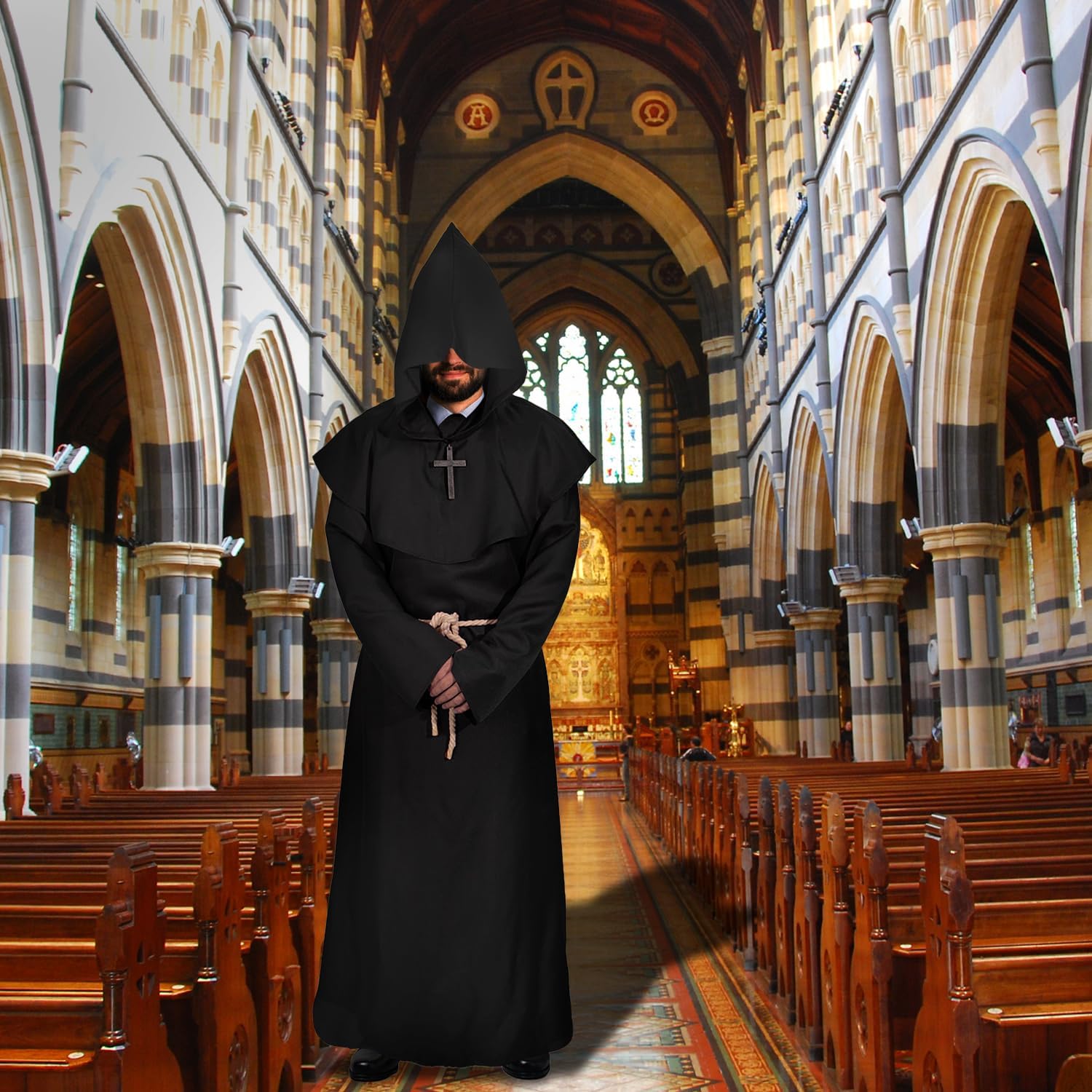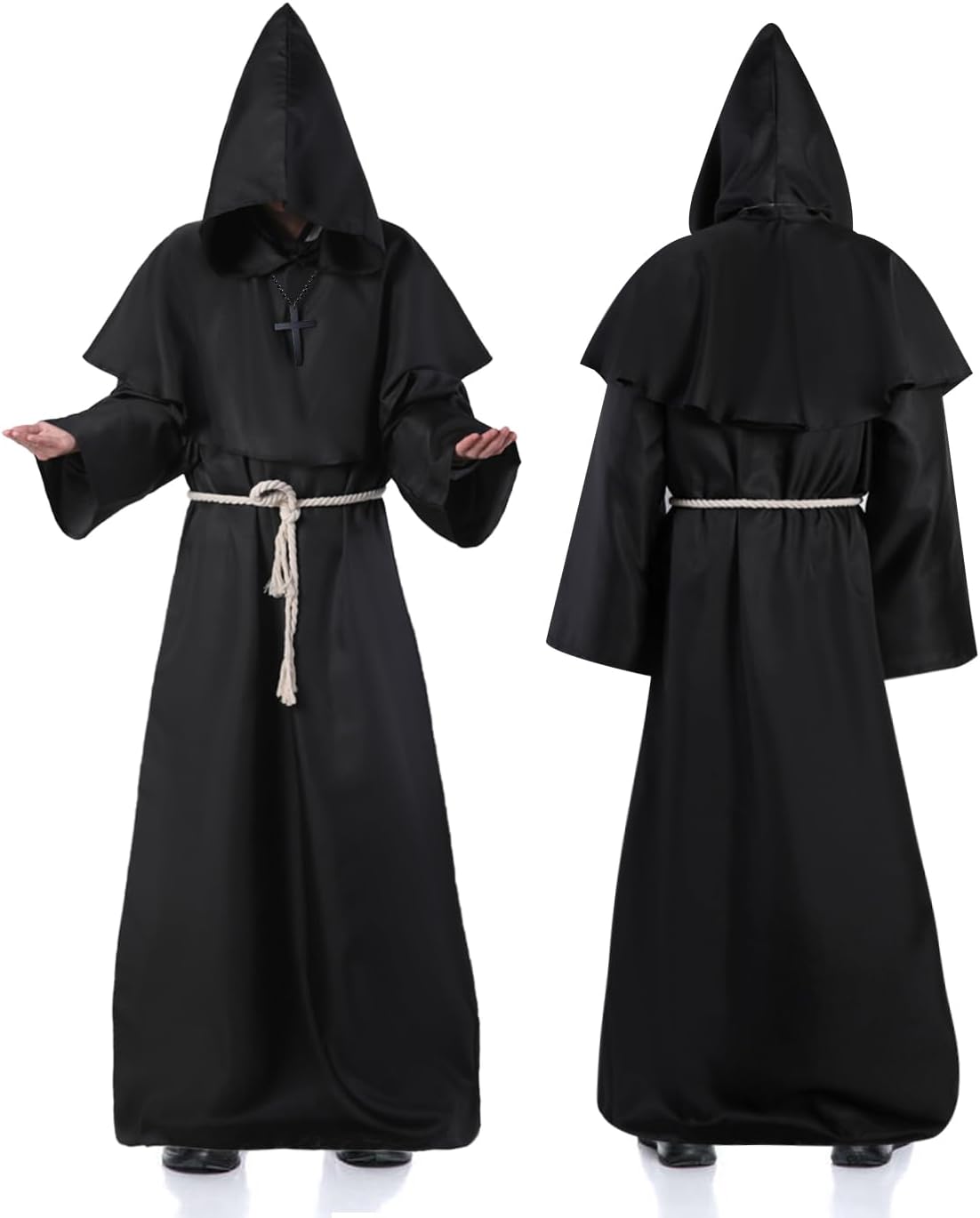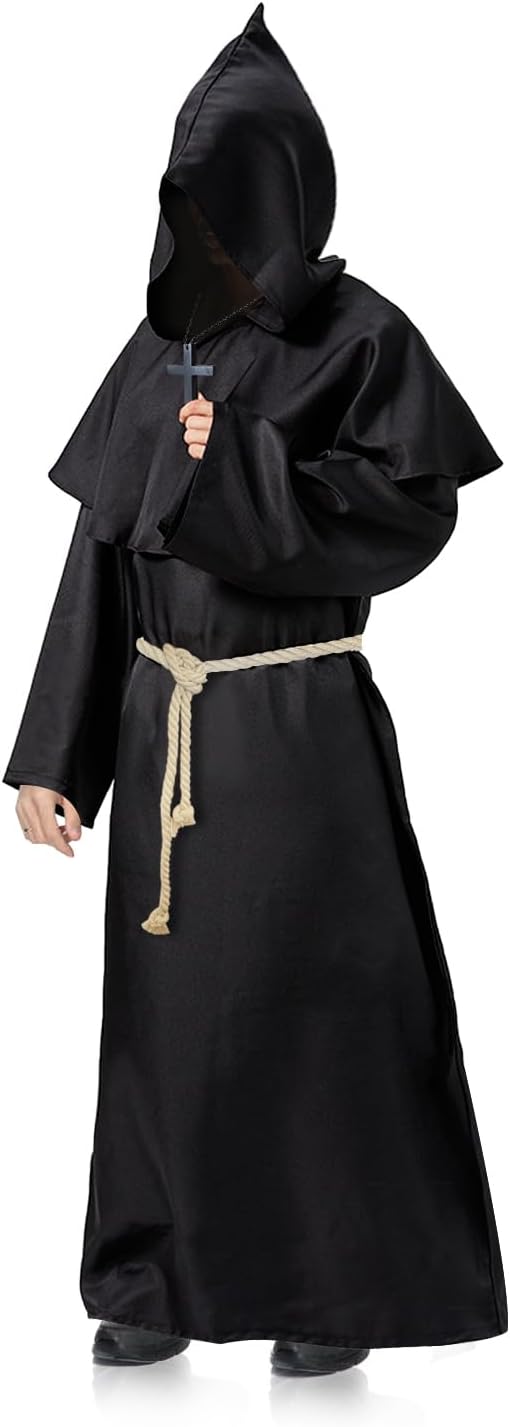 Costume da Monaco Medievale Rinascimentale, Costume Sacerdote Prete Uomo Costume Frate Medieval con Cappuccio e Collana a Croce Abito da Monaco per Halloween Carnevale Cosplay