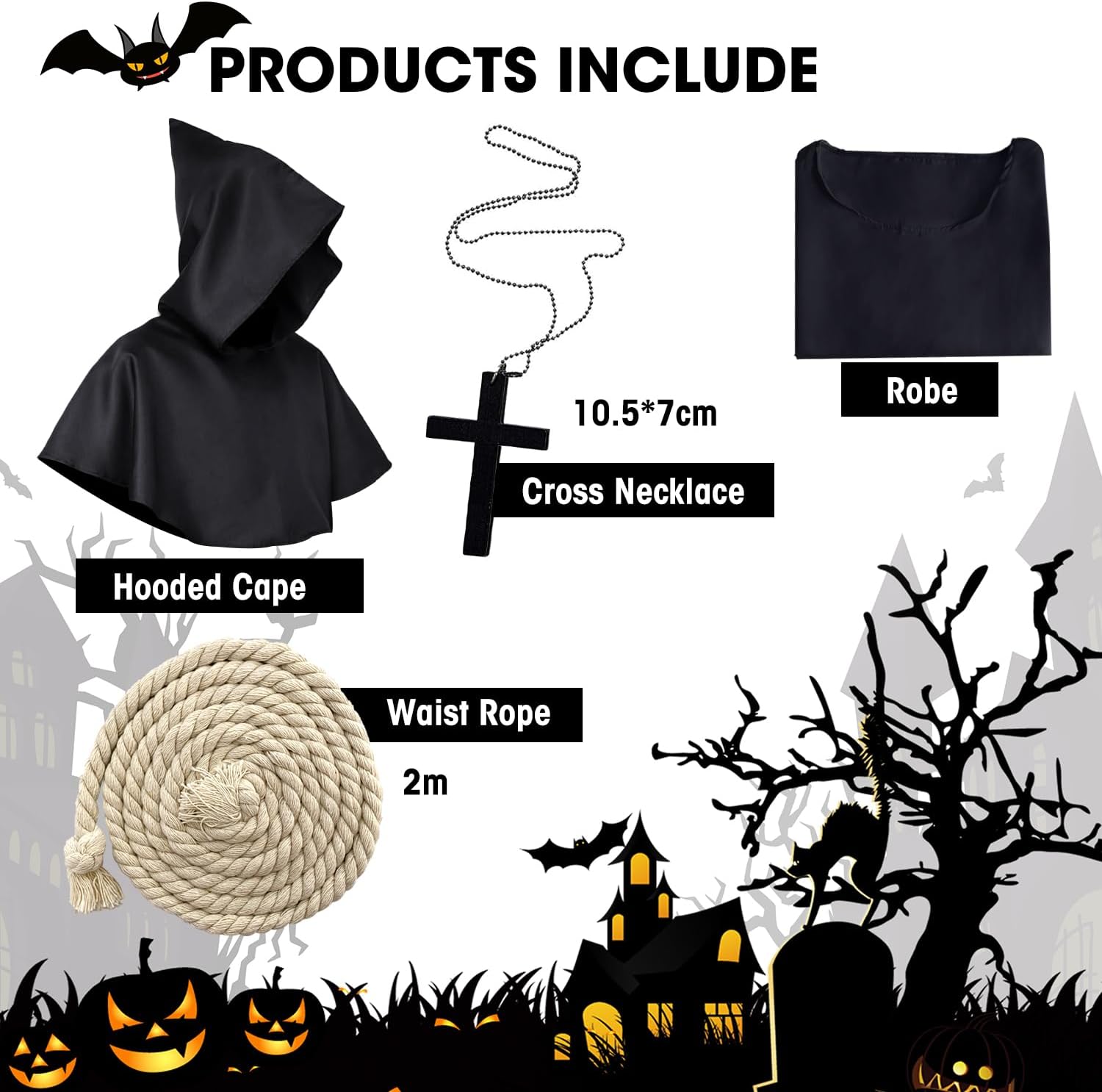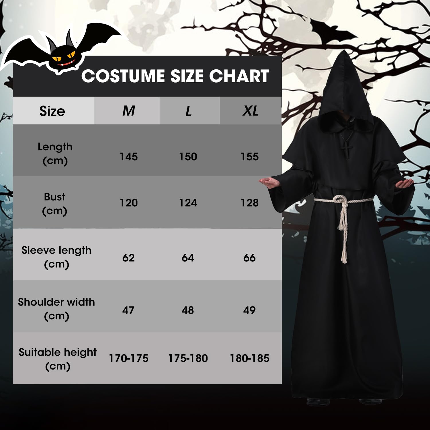 Sono alto 183 centimetri per 80 chili e ho ordinato una taglia XL, poteva andar bene anche una L, ma ho considerato che sotto il saio avrei indossato una tuta quindi ho deciso di ordinare una taglia in più. Il costume è semplice, in tessuto sintetico, composto da due parti, la veste e il cappuccio. Nel set sono compresi anche due accessori: un cordone e una collana con crocifisso che possiamo decidere di indossare o meno, a seconda delle circostanze; per il travestimento di Halloween ho deciso di non indossare gli accessori ma solamente il saio. Con una maschera ben scelta il travestimento è completo, semplice ma fate la vostra orrida figura. Il punto di forza è che potete riutilizzare la veste anche in altre occasioni, essendo semplice e completamente nera anche senza indossare il cappuccio. La fattura e la qualità dei materiali è discreta ma dopotutto utilizzeremo il costume una volta l'anno quindi per il prezzo direi che va più che bene.