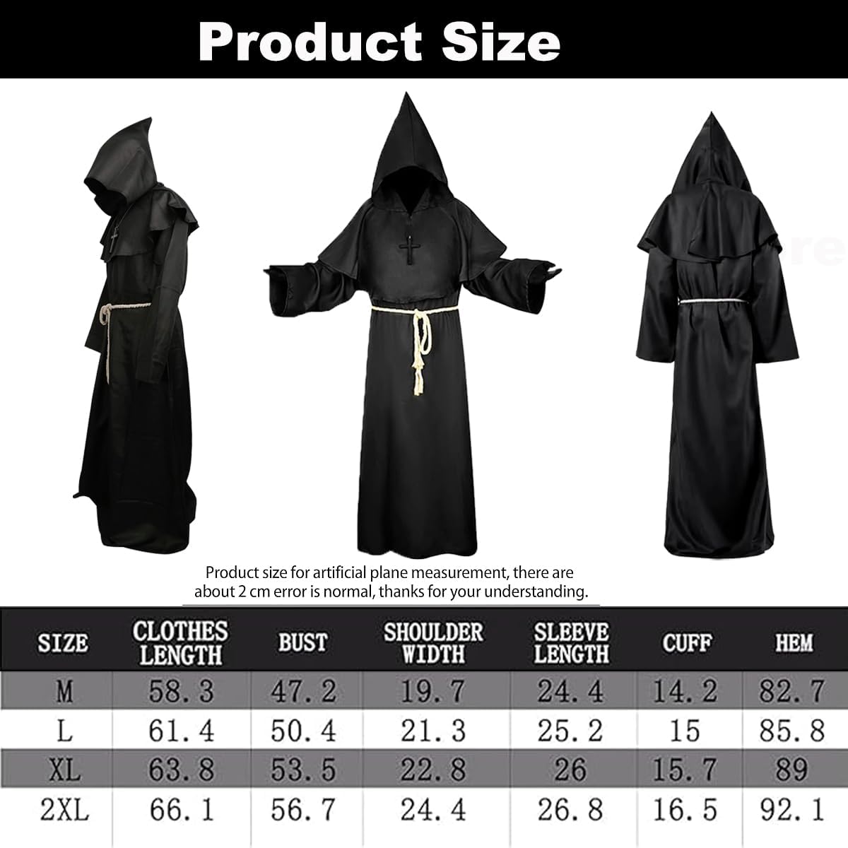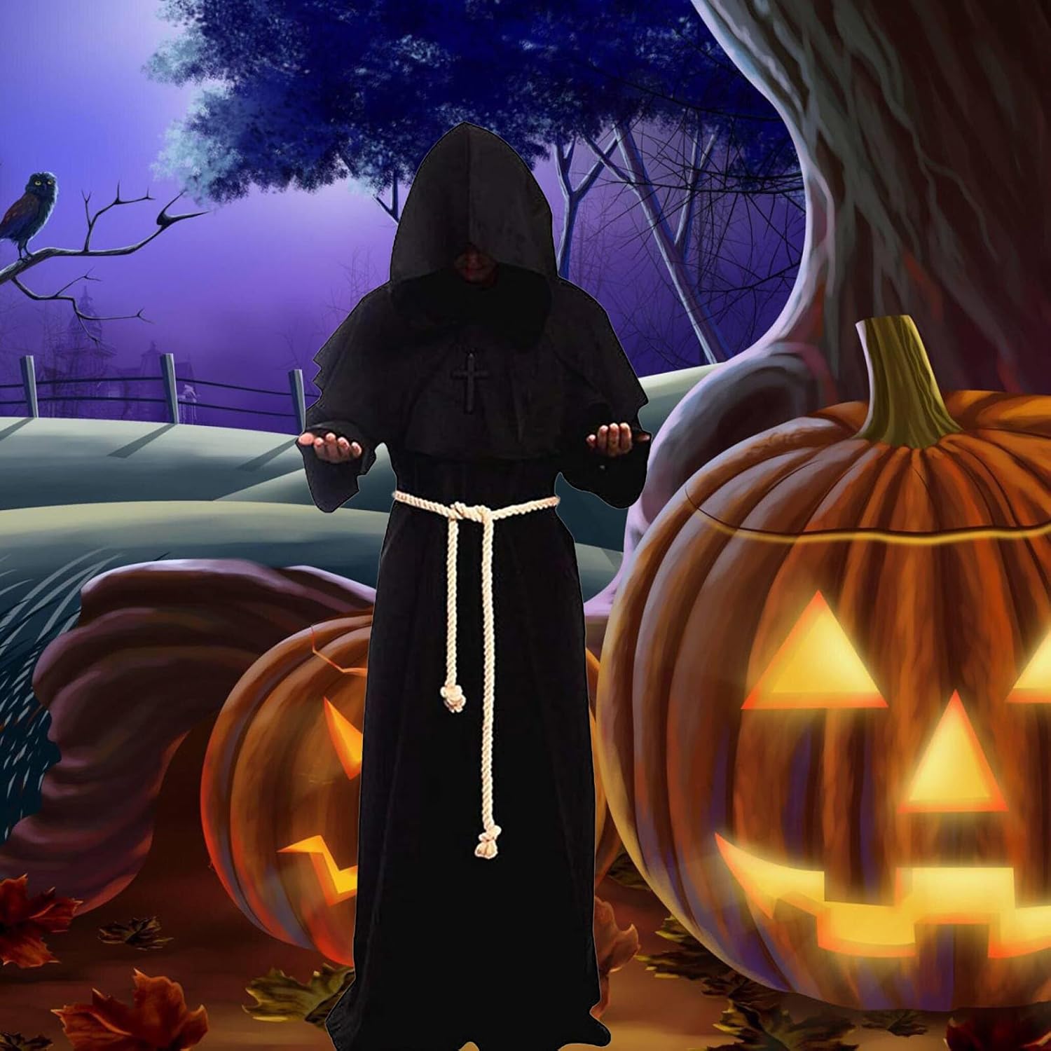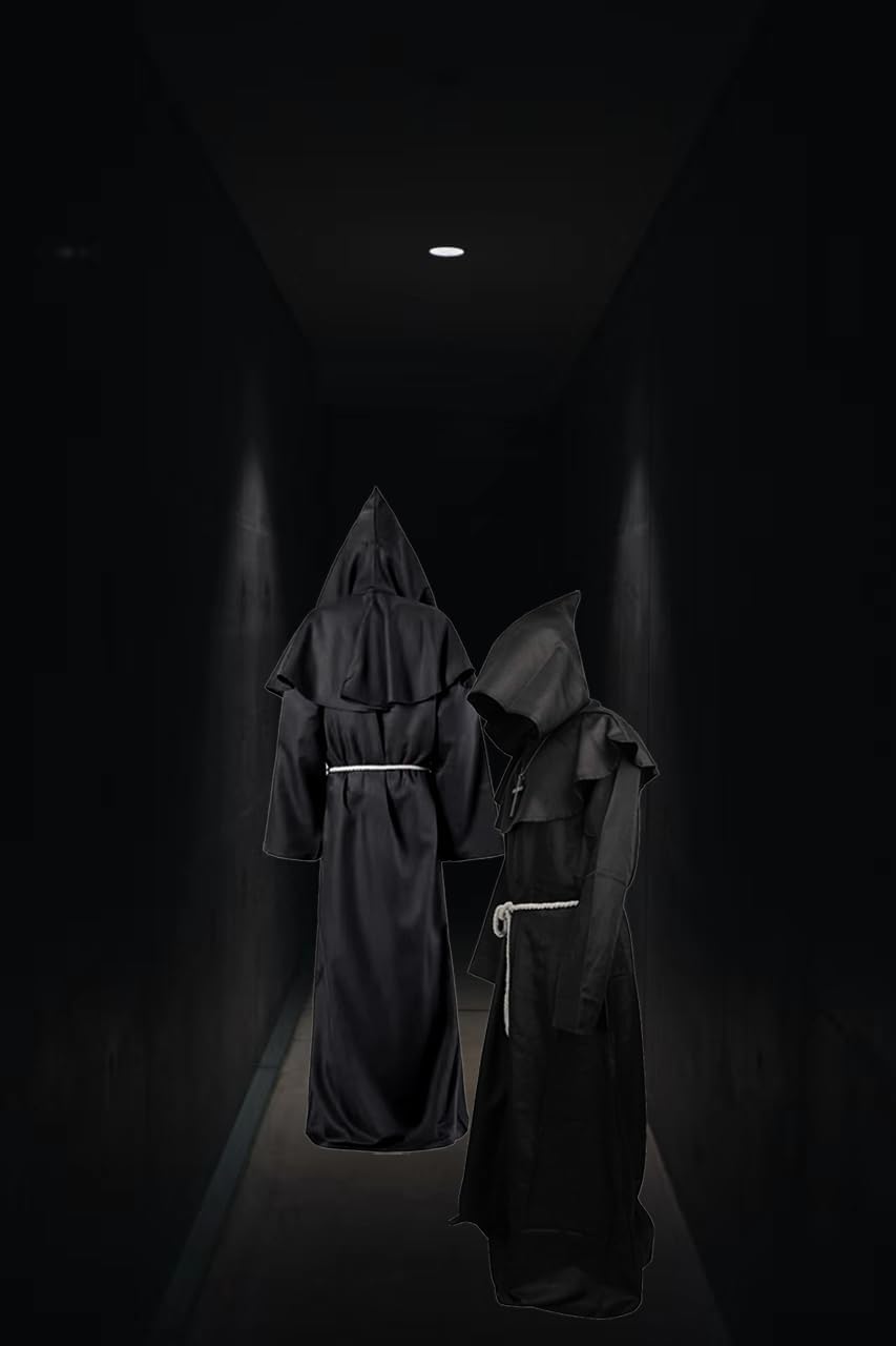 Costume da monaco, veste da prete, veste da monaco con cappuccio, costume da monaco per uomo, con collana a croce, guanti, cintura, costume per Halloween, Carnevale e gioco di ruolo