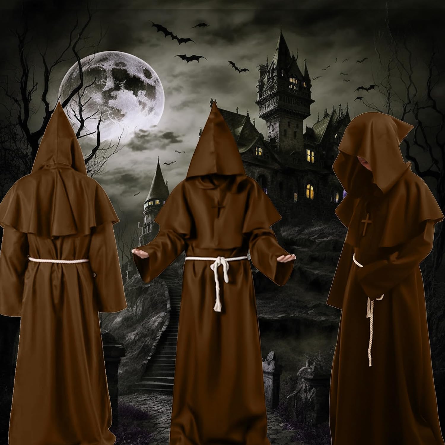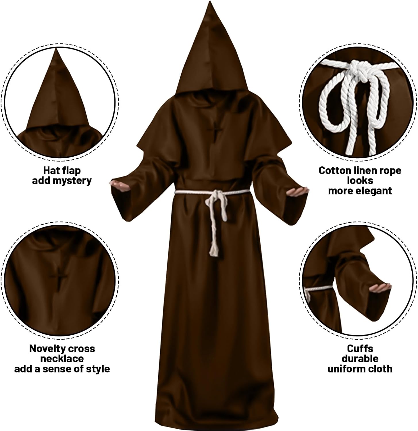 Costume da Monaco, Veste da Sacerdote, Veste da Monaco per Adulti, Rinascimento Medievale con Cappuccio, Cintura e Croce per Cosplay Carnevale Halloween