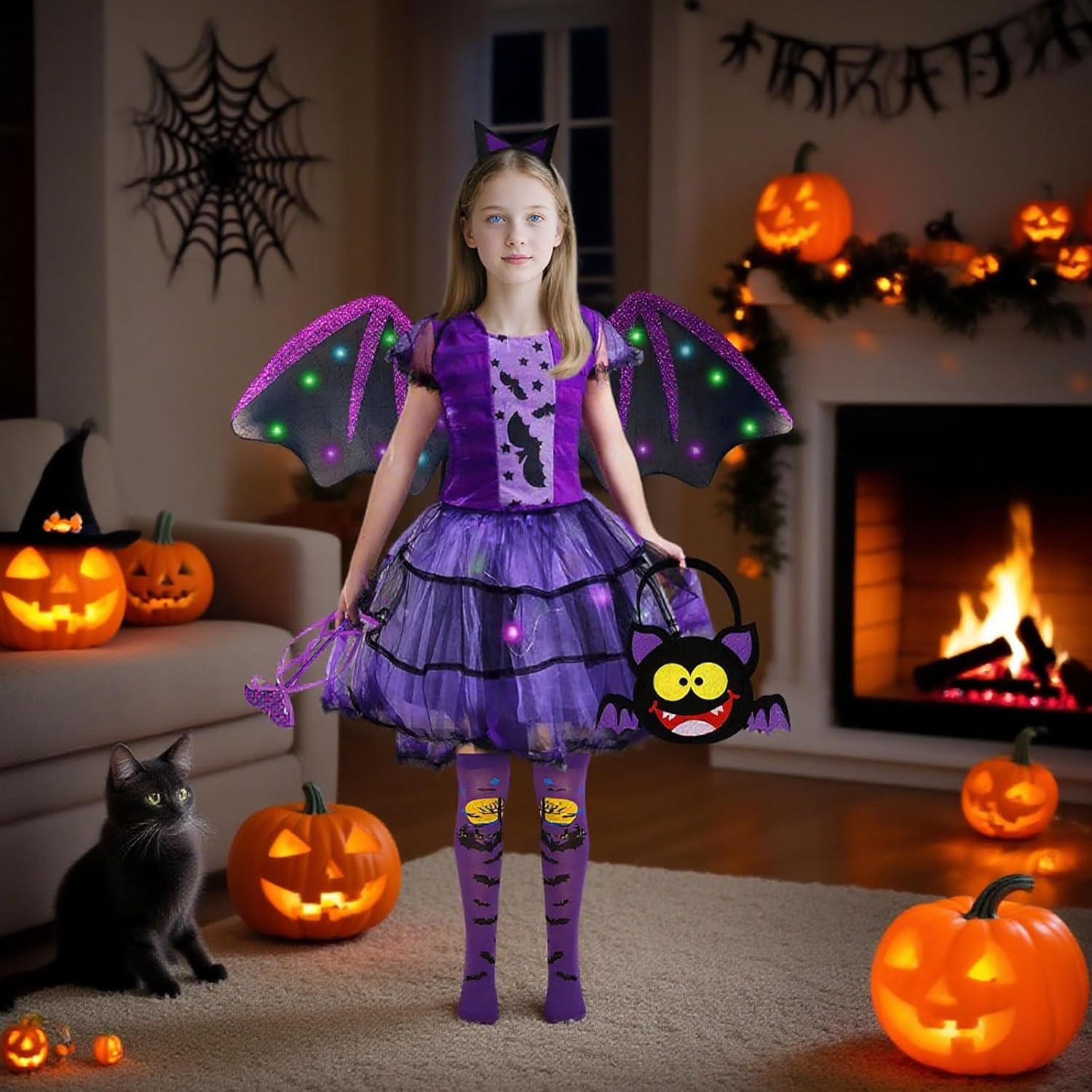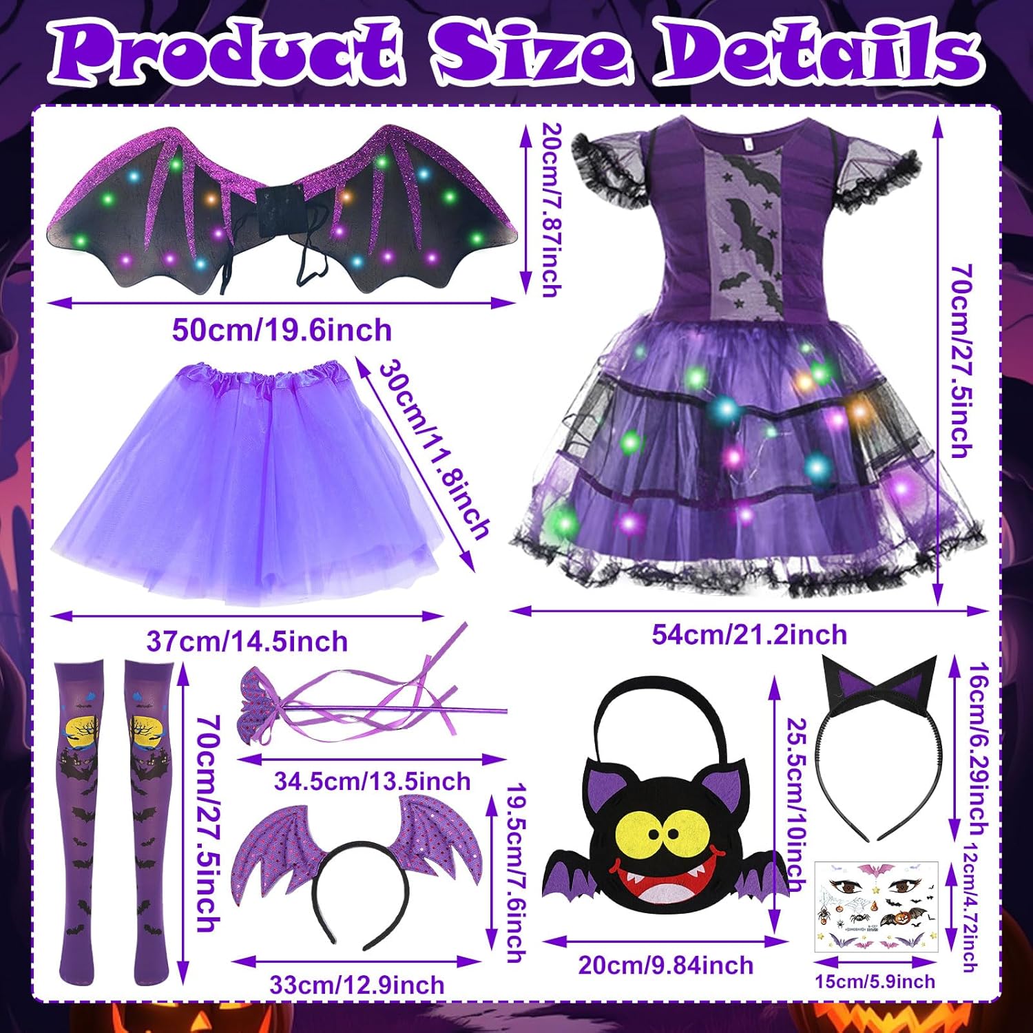 Descrizione prodotto Il costume da pipistrello per bambini è in classico viola e nero. Viene fornito completo di tutù, sia di giorno che di notte, renderà il vostro bambino al centro di una festa di Halloween o di carnevale. Costume di Halloween per bambini, unico e carino, per voi, la buona strega, adatto per Halloween, carnevale, giochi di ruolo, festival, compleanni, feste a tema, ecc. È un ottimo regalo per le ragazze. comprende: costume pipistrello vestito Tutù. Bacchetta magica Sacchetto per caramelle Maschera per occhi di pipistrello ali di pipistrello Fascia per Avviso di sicurezza No