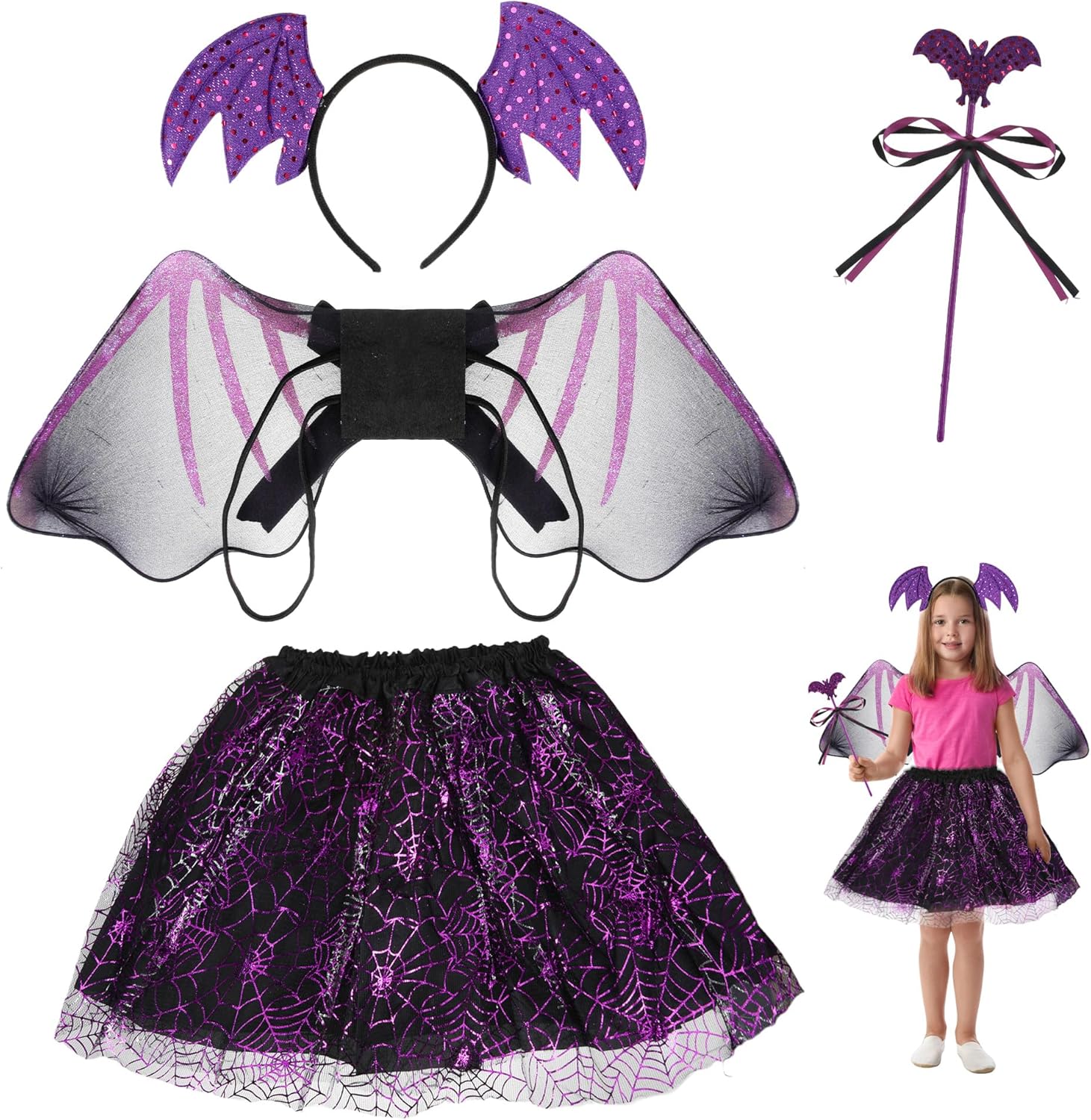 Costume da pipistrello di Halloween per ragazze, costume da strega di Halloween per ragazze comprende gonna tutù viola, ali, calze, fascia per capelli e borsa a tracolla, festa in costume di carnevale Costume di Halloween per bambini