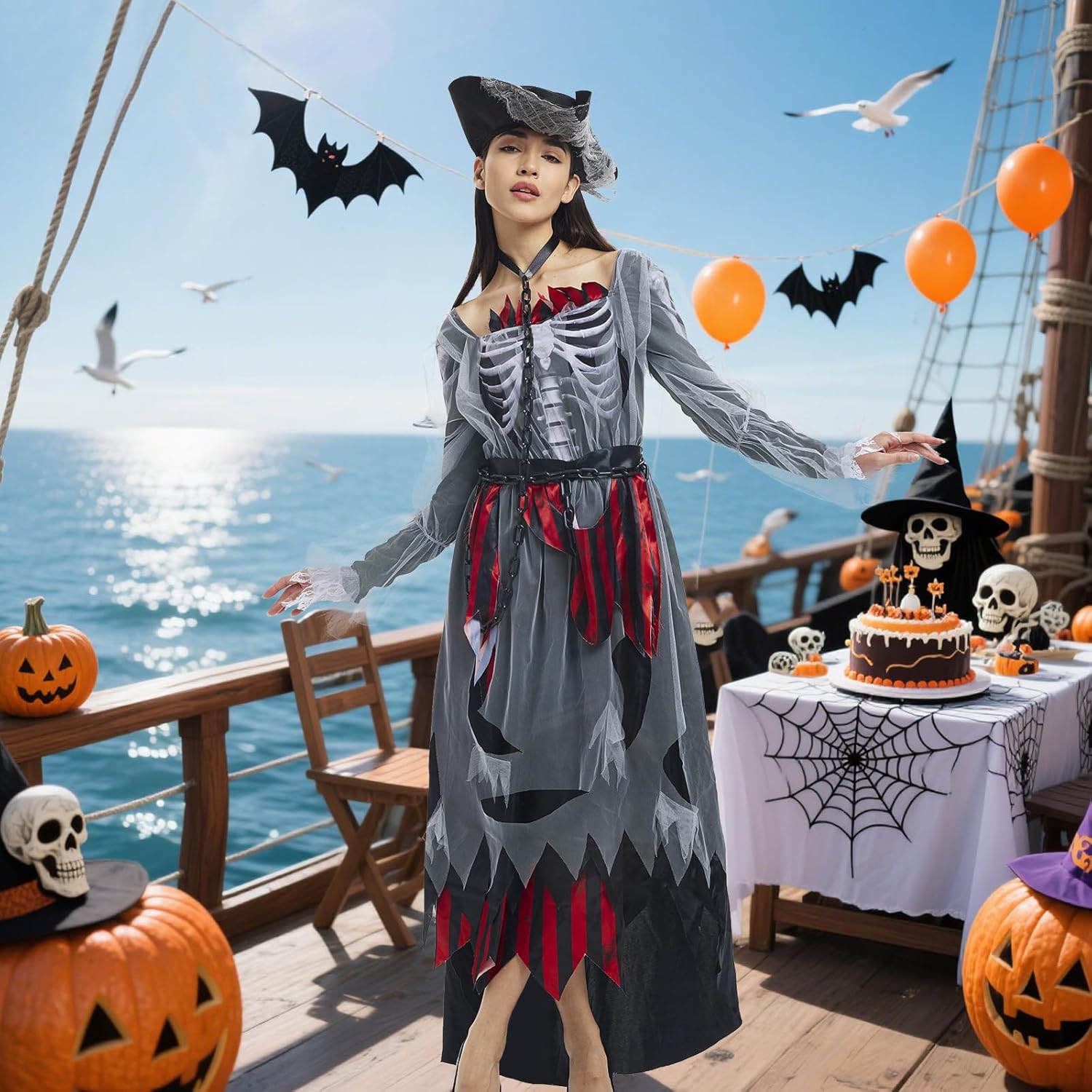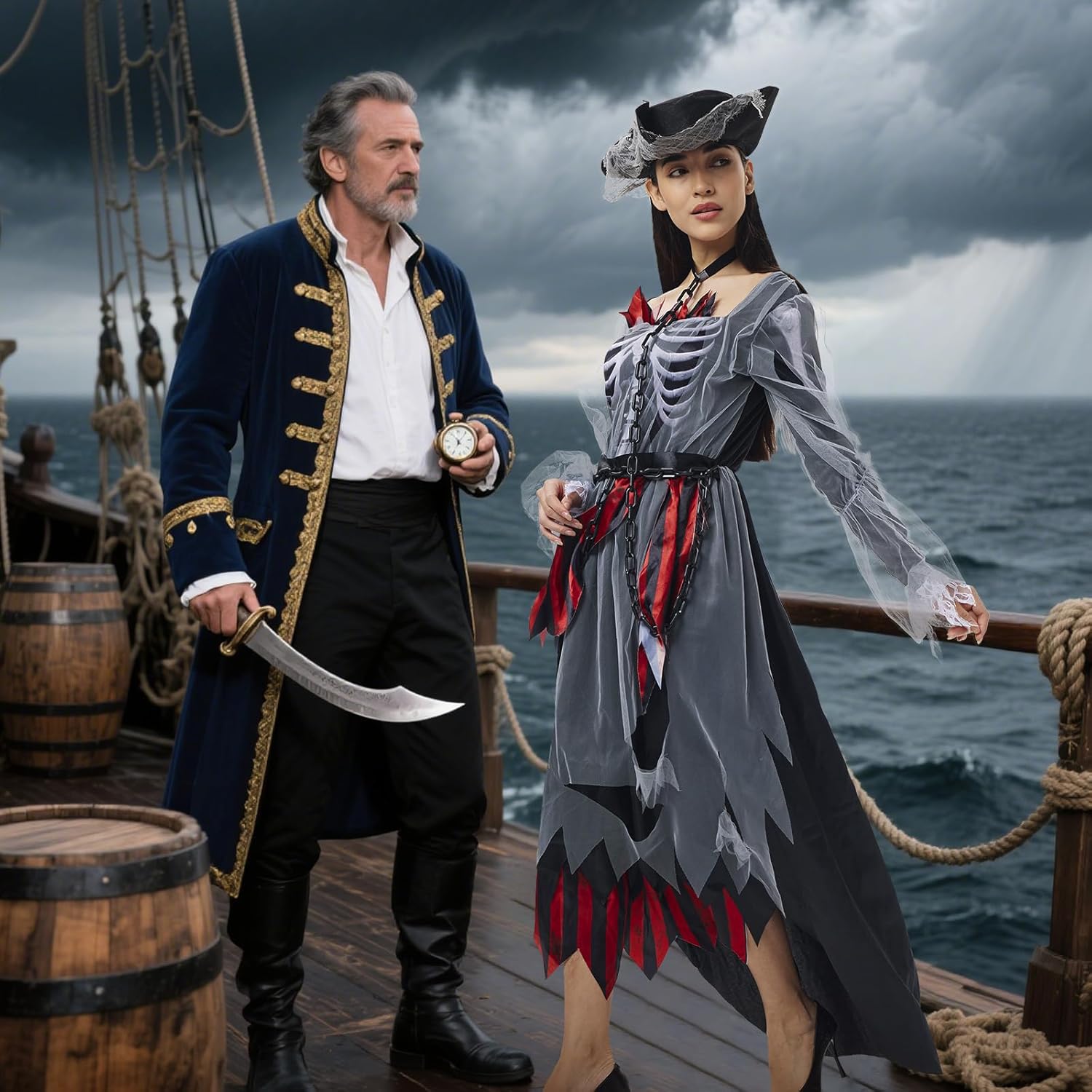 Descrizione prodotto Ahoi, ratti terrestri e fantasmi della notte! Alla festa dei non morti. Voglia di un aspetto spaventoso che cattura tutti gli sguardi? Questa gonna da donna Zombie pirata è il vostro biglietto per il mondo dello stile gotico spaventoso. Mescola il fascino dei pirati con i brividi di zombie. Perfetto per Halloween o qualsiasi festa a tema. Mostra il tuo lato oscuro! Pieno di dettagli che entusiasmeranno Cosa rende questo costume horror medievale così speciale? Una parte superiore con motivo a teschio spaventoso. Una gonna lunga e fluida. Una cintura nera per un tocco misterioso. Il cappello giusto non può mancare. Una collana completa il look. Tutto per il tuo cosplay perfetto! Confortevole e pronto per l'avventura Questo costume non è solo elegante, ma anche comodo. È fatto di tessuti di alta qualità. Leggero e traspirante, ideale per lunghe notti Sentitevi come su una nave fantasma! Per ogni occasione spaventosa. Che si tratti di una festa di Halloween, carnevale, feste spaventose o ballo in maschera. Con questa gonna da donna Zombie da pirata sarete la stella. Mostra il tuo stile unico spaventoso! Avviso di sicurezza No