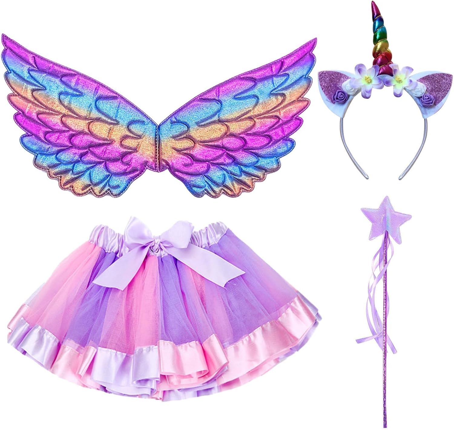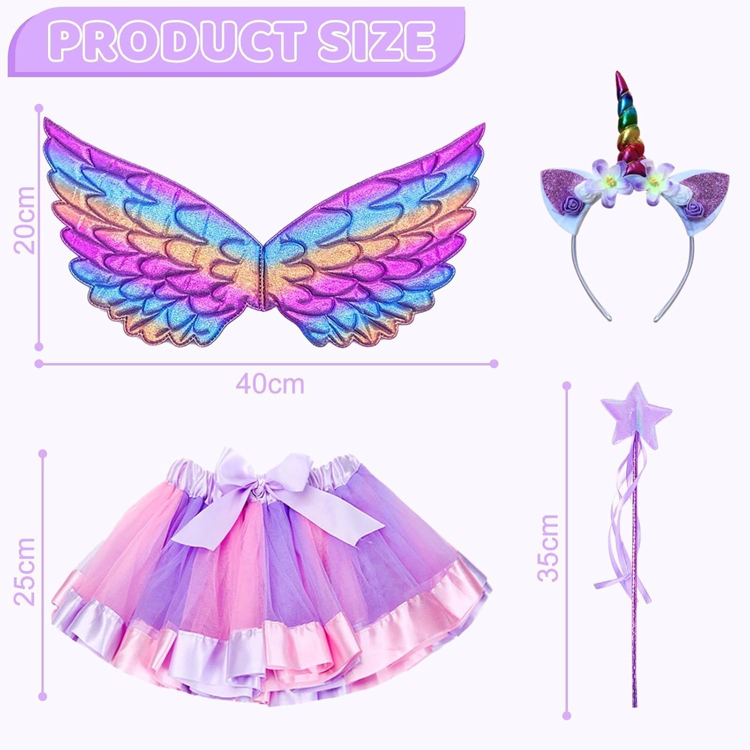 Descrizione prodotto Descrizione del prodotto: Set di 4 costumi per bambini include gonna tutù, ali da fata d'angelo, bacchetta magica e fascia per capelli. Adatto per 3-8 anni. È un regalo ideale per qualsiasi ragazza e un elemento essenziale per le ragazze vestire scatola. Colore e design vivaci, aspetto affascinante e carino. Ottimo rapporto qualità-prezzo e ideale per vestirsi alle feste o divertimento quotidiano. Costume da fata con design in stile angelo, leggero e civettuolo, pieno di moda. Design speciale per far sembrare la tua bella bambina una piccola fata. Ogni bambina ha un sogno di principessa e fata, vestirsi in questo set gonna con fascia ad ala d'angelo, il sogno diventerà realtà. Questa gonna a tutù con elastico consente al bambino di indossarlo più anni con cura. Le ali di fata d'angelo hanno cinghie elastiche che possono essere facilmente circondate su entrambe le spalle su qualsiasi top. La bacchetta magica con nastro darà a qualsiasi ragazza un immenso potere magico mistico! La confezione include: 1 abito da principessa arcobaleno. 1 x ali di colore sfumato. 1 bacchetta magica a forma di stella. 1 cerchietto con unicorno Avviso di sicurezza NO