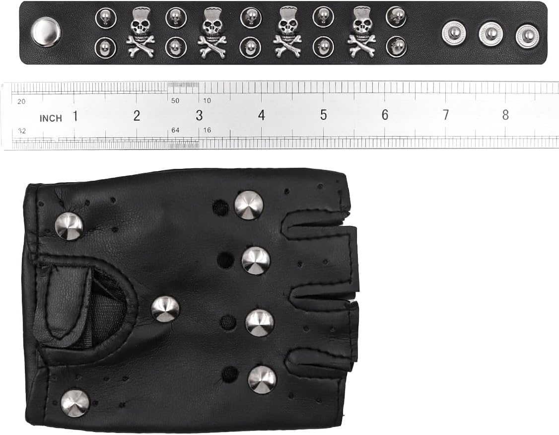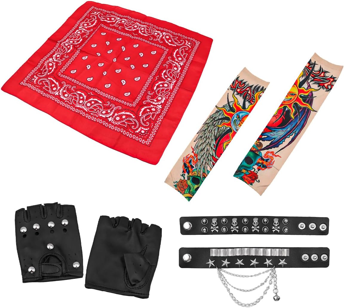 Realizzato in puro cotone, più morbido e spesso rispetto ad altri tessuti. Inoltre, le finte maniche per tatuaggi sono realizzate in poliestere, che è elastico, traspirante e comodo da indossare. L'archetto è regolabile in modo da poter regolare la lunghezza in base alle proprie esigenze. Questo set di parrucche da discoteca Rockstar in metallo pesante ha un design classico, retrò e alla moda, la scelta migliore per i fan di Rockstar, le attività indoor e outdoor degli anni '80 e '90 Può essere utilizzato anche per rave party, spettacoli, feste in maschera, halloween, San Valentino, creando un'atmosfera divertente per Natale, compleanni, feste in maschera o altri eventi festivi La confezione include: 2 maniche finte per tatuaggi sul braccio, 1 braccialetti in pelle PU, 2 guanti, 1 fascia punk