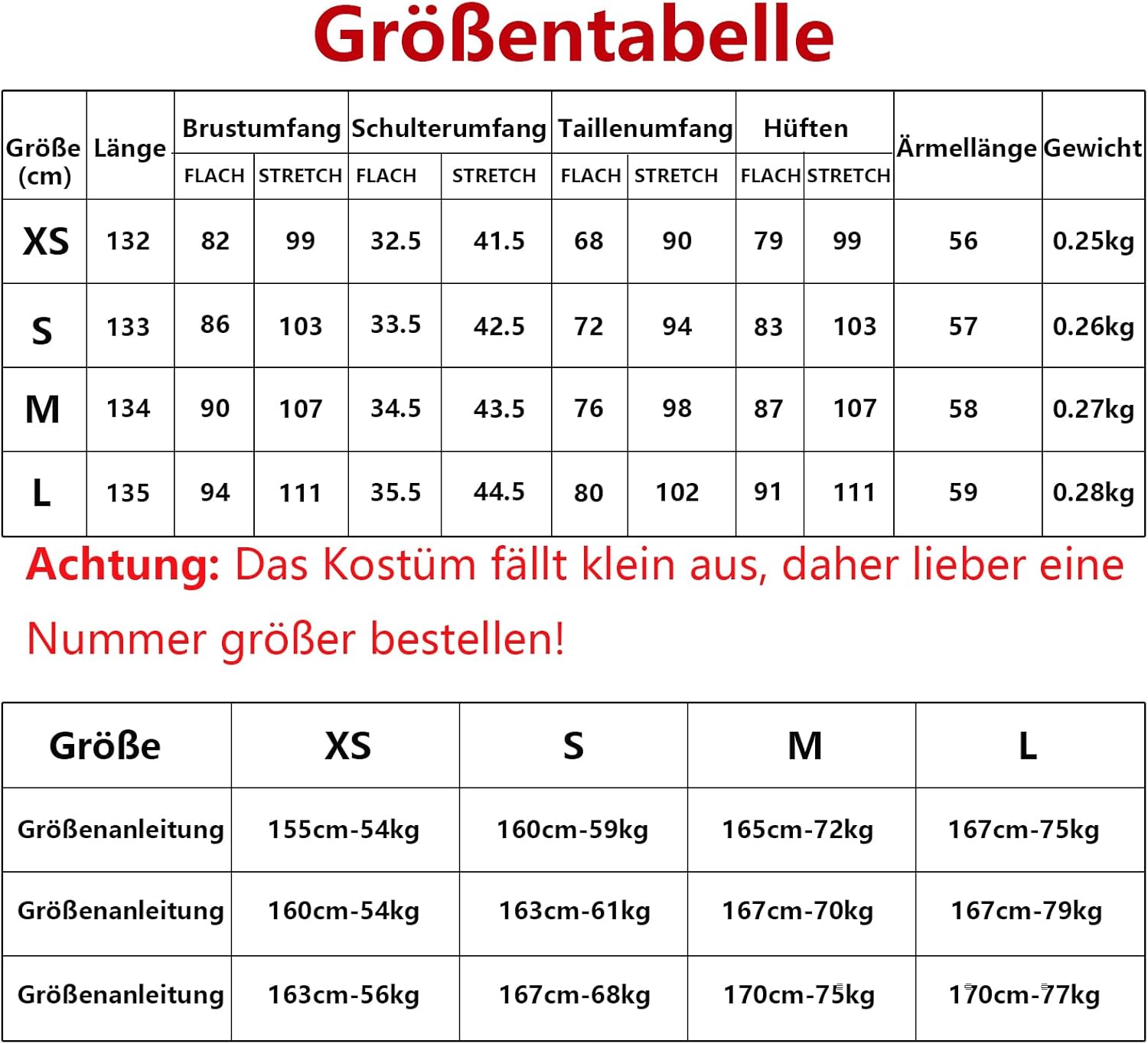 Il costume rispecchia la descrizione del prodotto, ottimo rapporto qualità prezzo. Io ho preso una S e sono 1.62 per 50kg quindi secondo me veste giusto e non piccolo come indicato