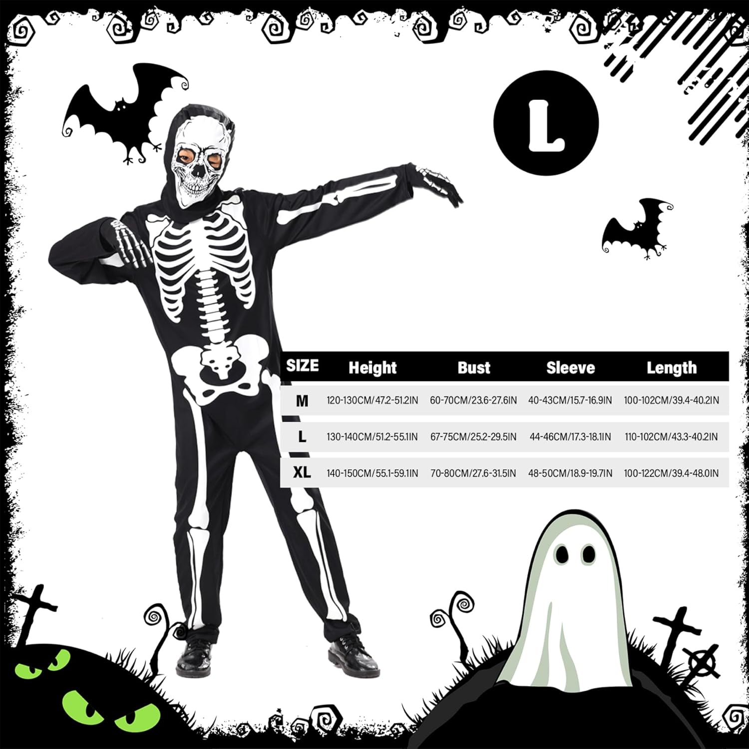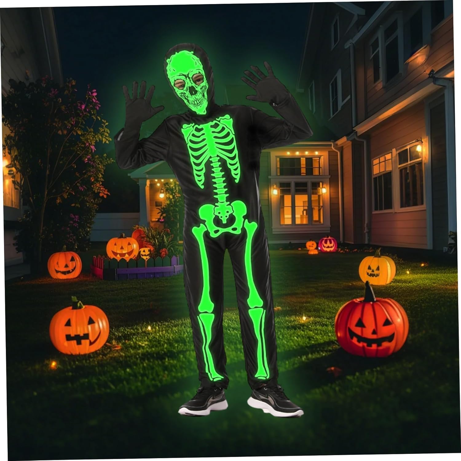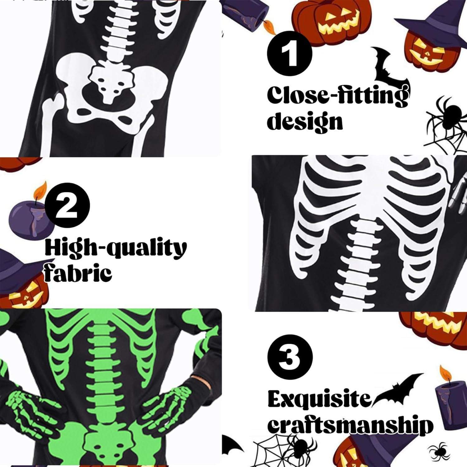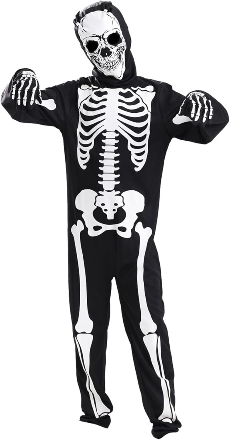 Divertimento bagliore-nel dark: con vibranti stampe scheletriche bagliore nel buio, questo costume assicura che il bambino si distingua durante le feste di Halloween notturne e feste spettrali, aggiungendo eccitazione e visibilità Set completo con guanti: il costume include guanti abbinati, fornendo un look da scheletro senza soluzione di continuità dalla testa ai piedi che migliora l'effetto inquietante e prepara il vestire senza problemi Facile cura e durata: realizzato con tessuti di qualità, questo costume è lavabile in lavatrice e costruita per sopportare le attività energetiche dei bambini piccoli mantenendo il suo bagliore e il suo aspetto vibrante Design unisex per tutti i bambini: progettato per adattarsi a ragazzi e ragazze, questa versatile abito da scheletro ospita bambini di varie dimensioni e stili, rendendolo un'ottima scelta per fratelli o amici Tessuto morbido e confortevole: realizzato con materiali traspiranti e elastici, questo costume a tutto il corpo mantiene i bambini accoglienti e senza restrizioni, perfetti per l'usura per tutto il giorno durante il trucco o il gioco