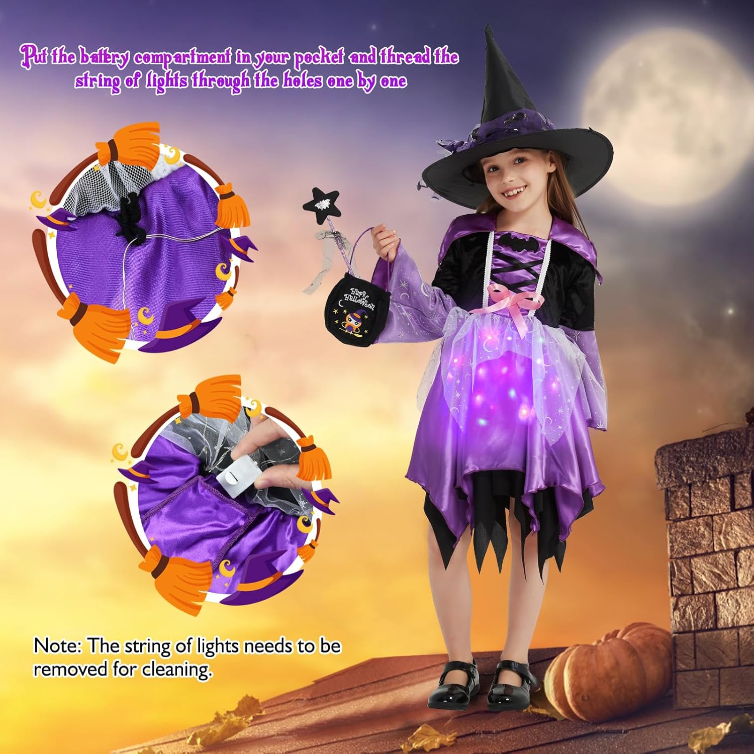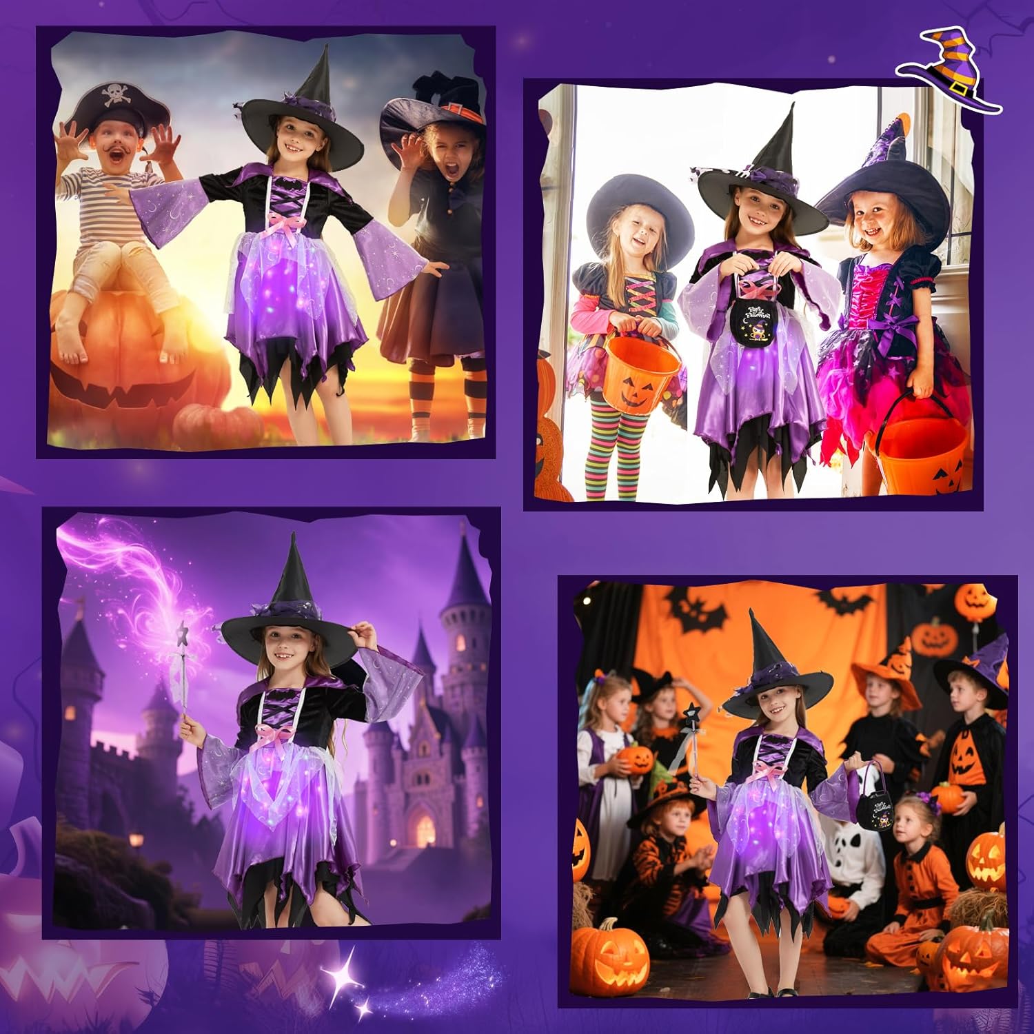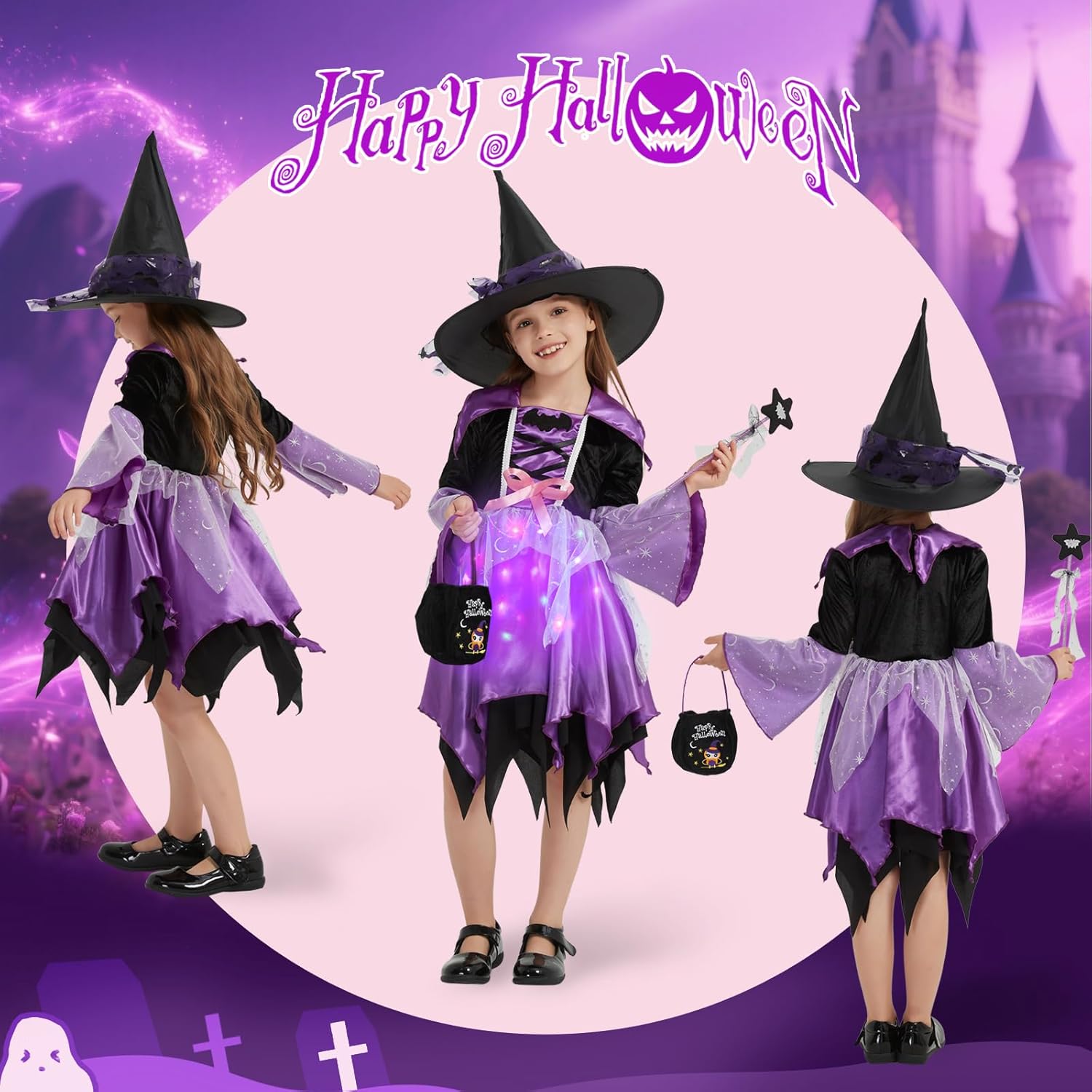 Costume da Strega Bambini, 4 Pezzi Carnevale Costume di Streghetta, Abito + Cappello + Bacchetta Magica + Borsa, LED Abito da Strega per Feste, Compleanni e Party di Halloween