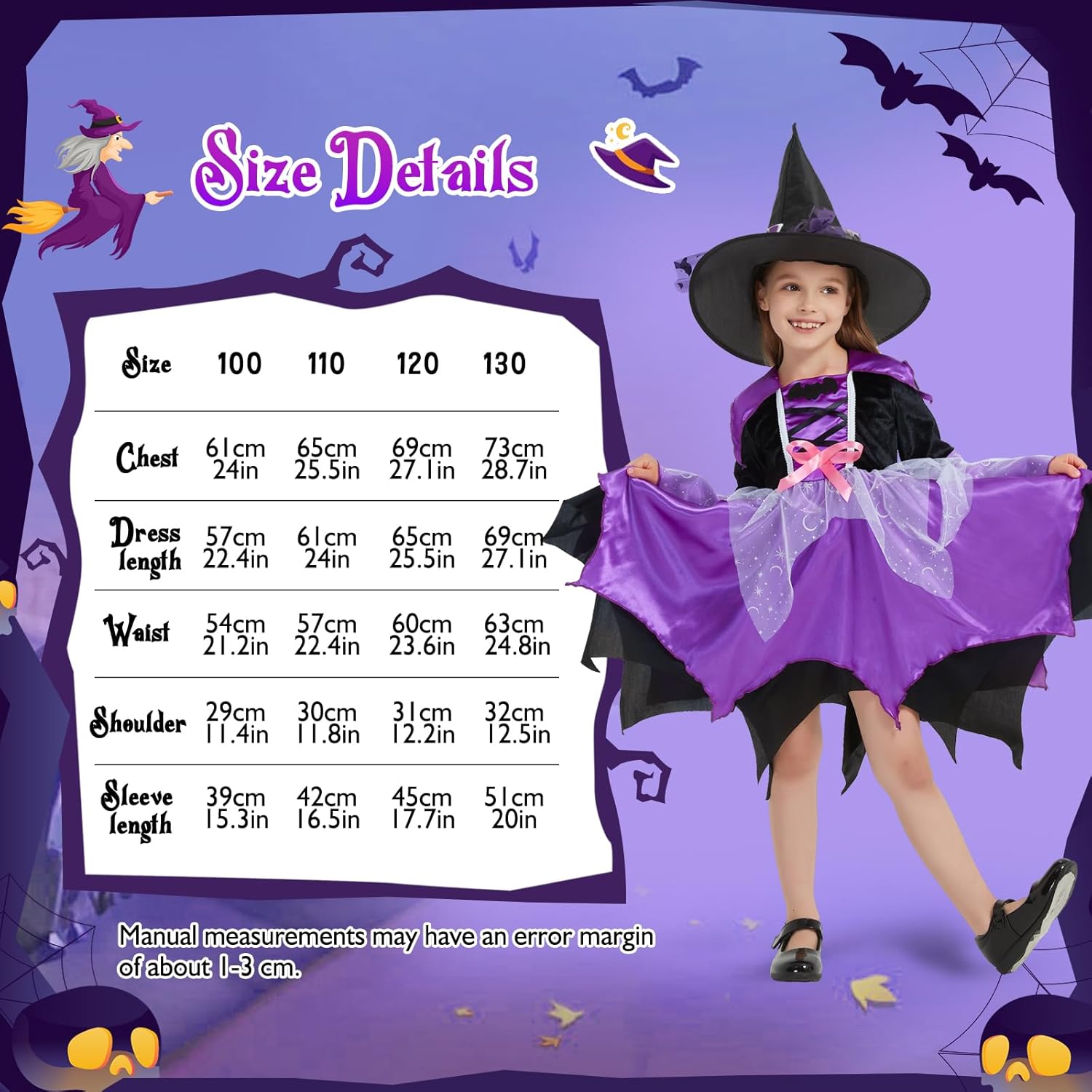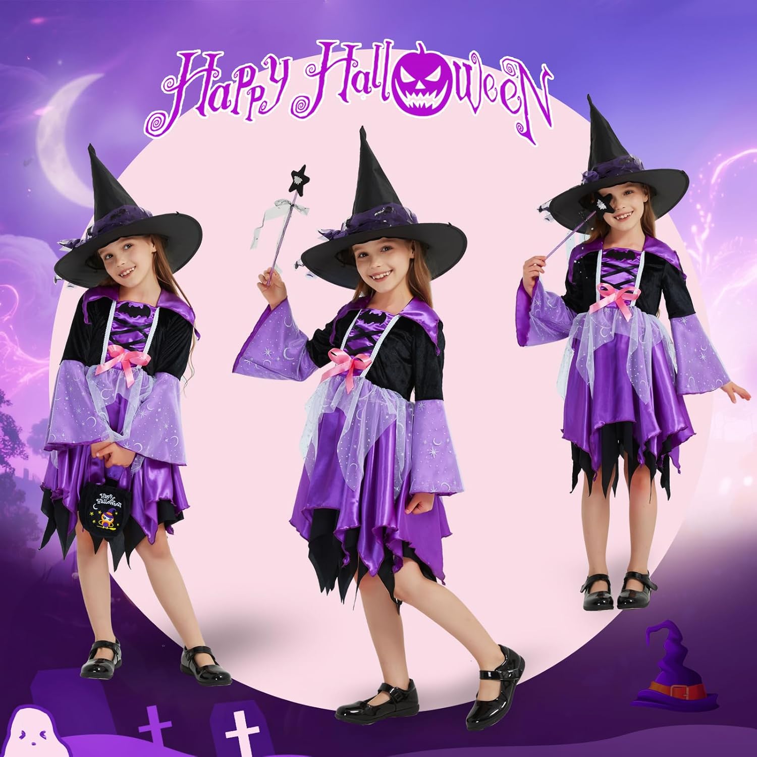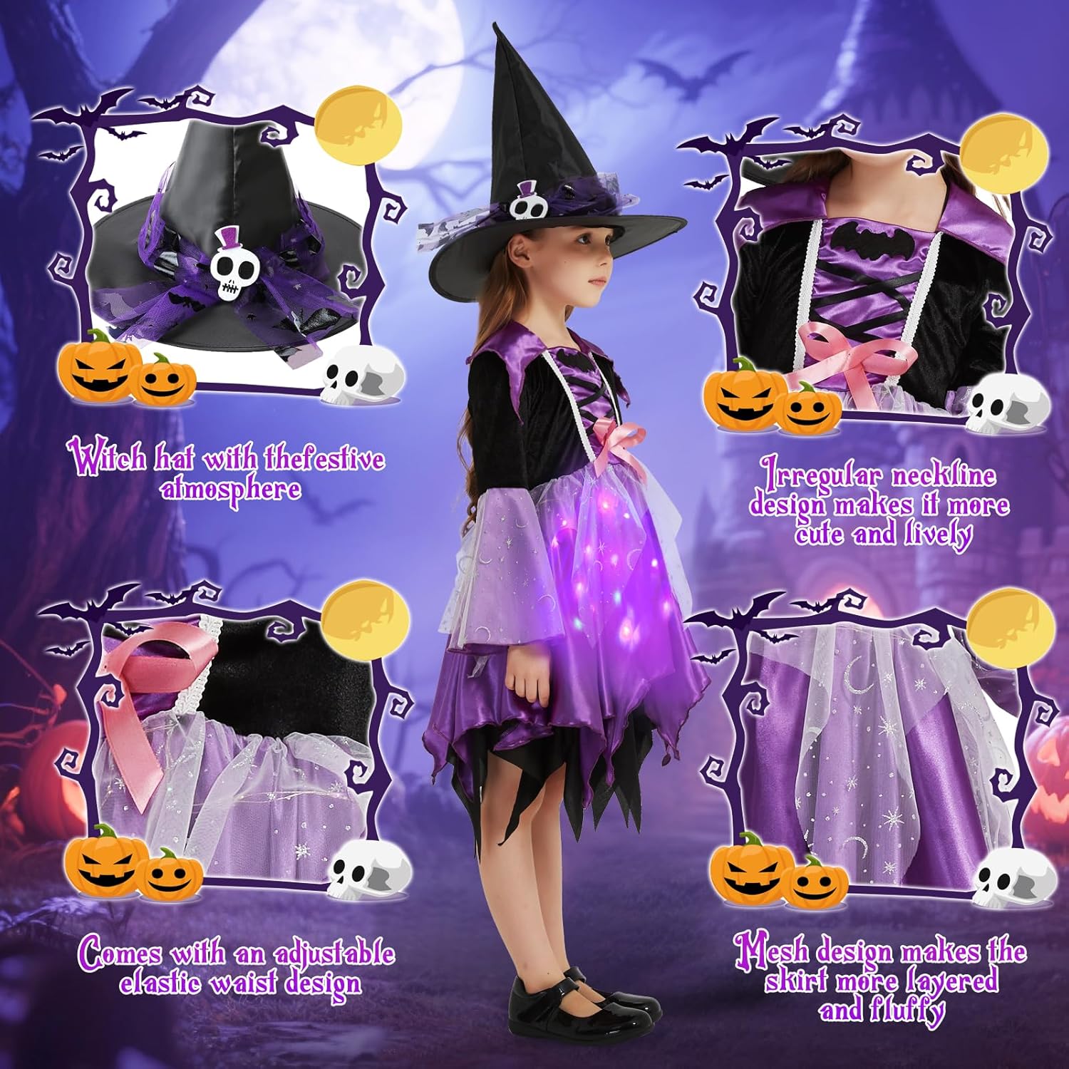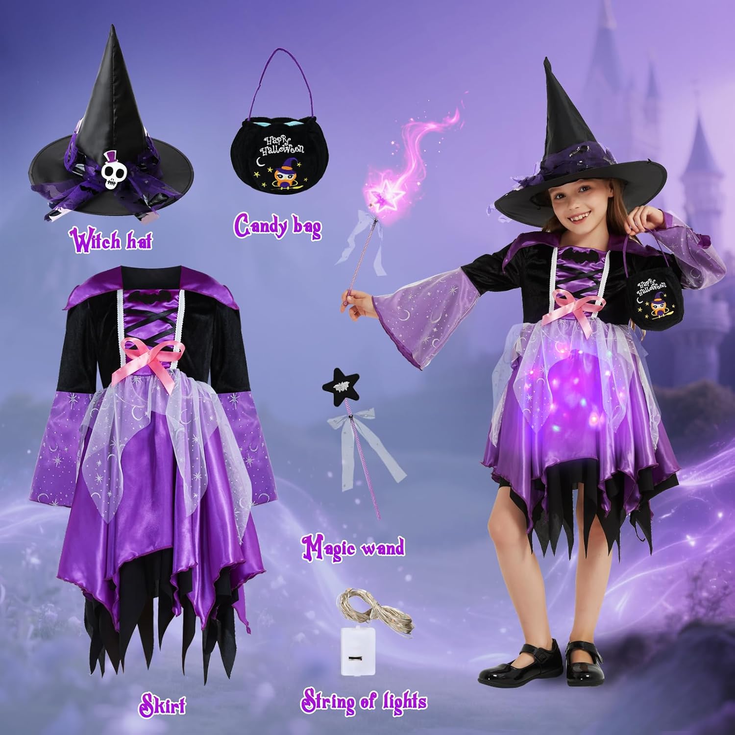 Costume da Strega Bambini, 4 Pezzi Carnevale Costume di Streghetta, Abito + Cappello + Bacchetta Magica + Borsa, LED Abito da Strega per Feste, Compleanni e Party di Halloween