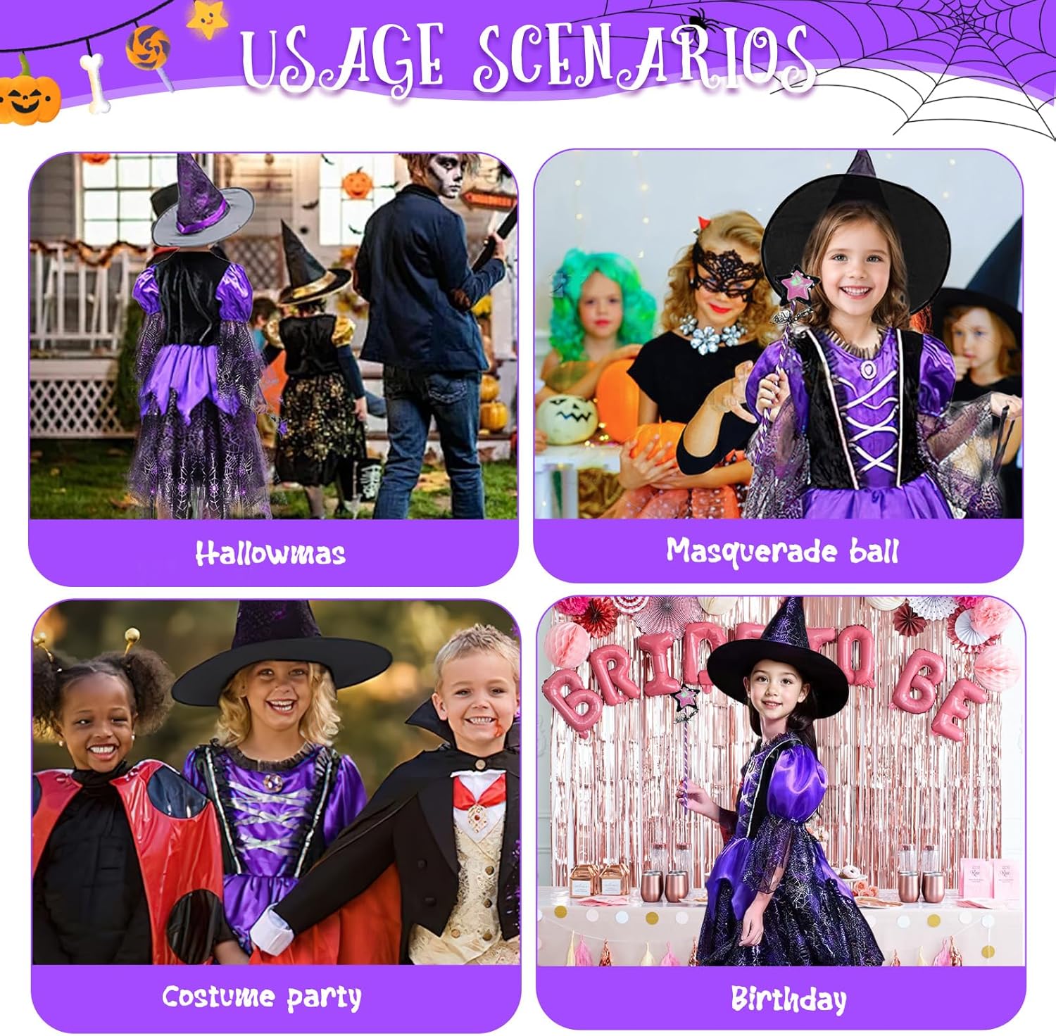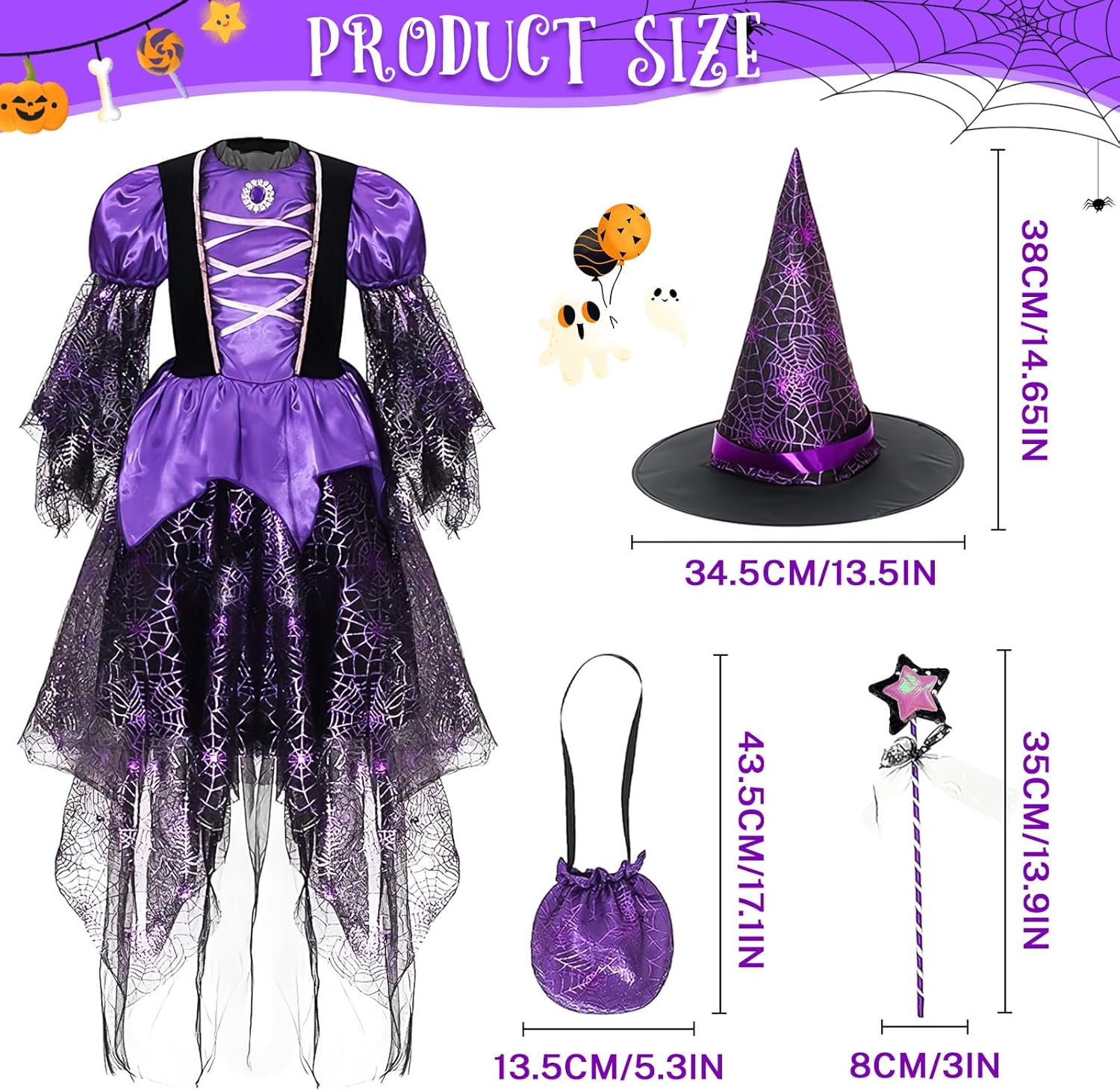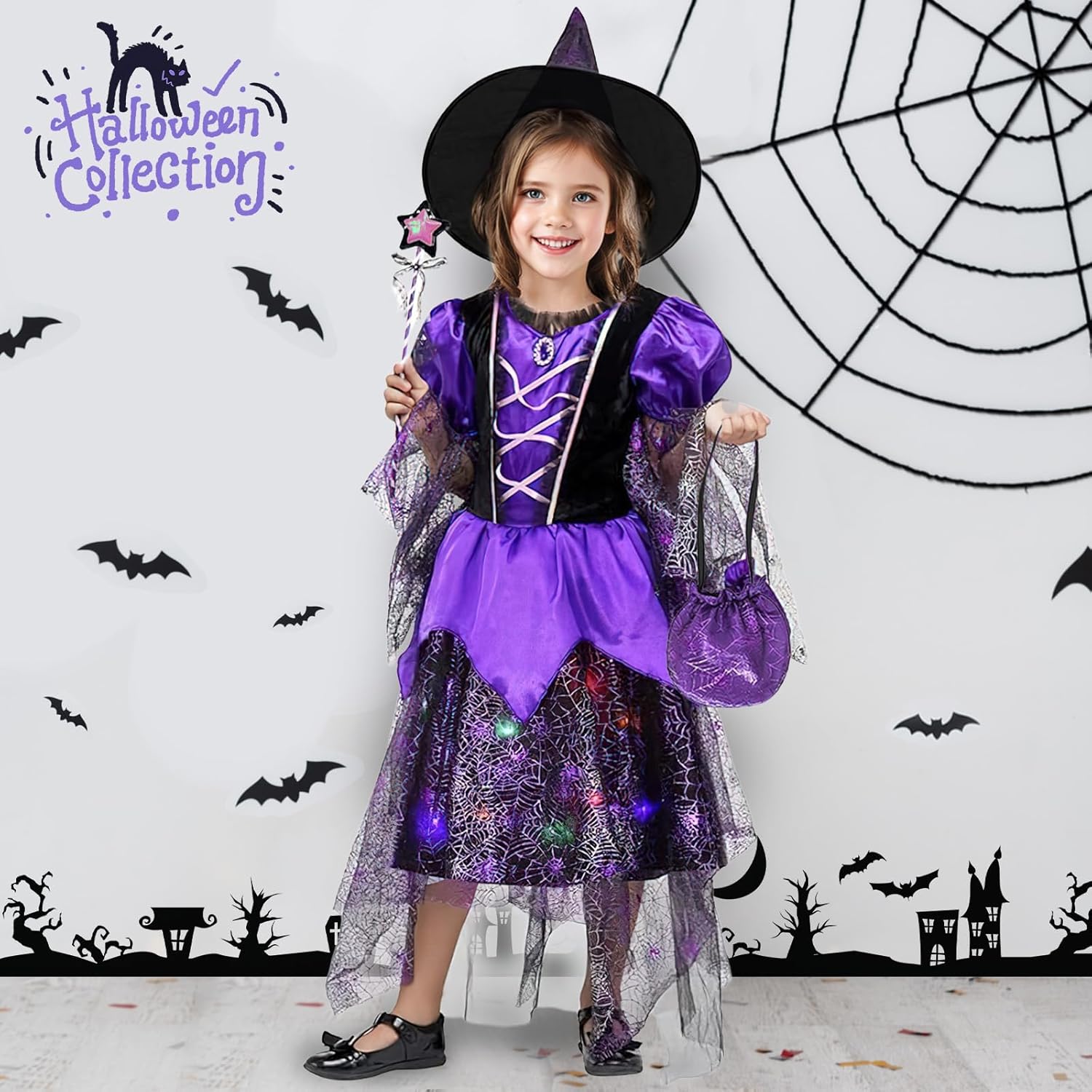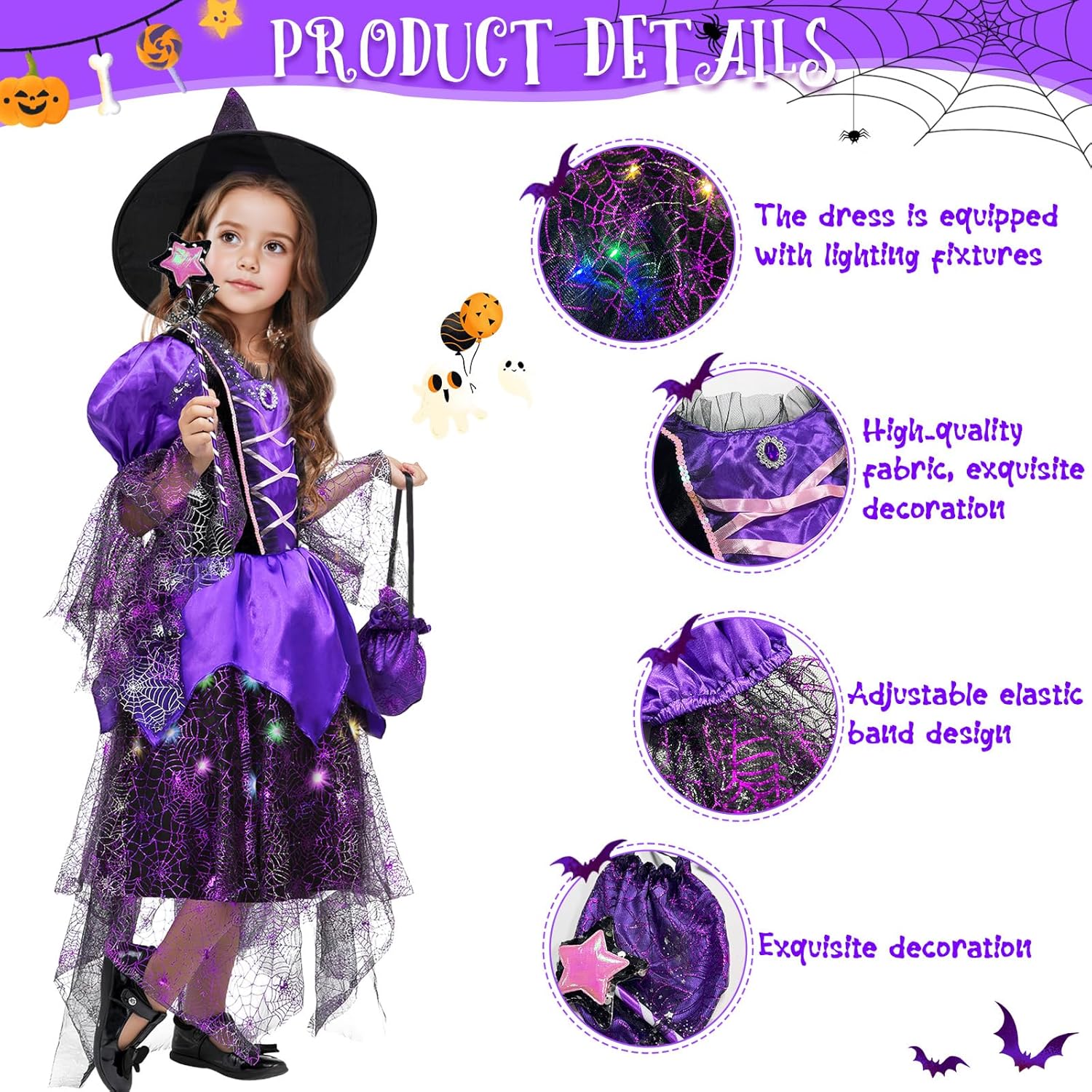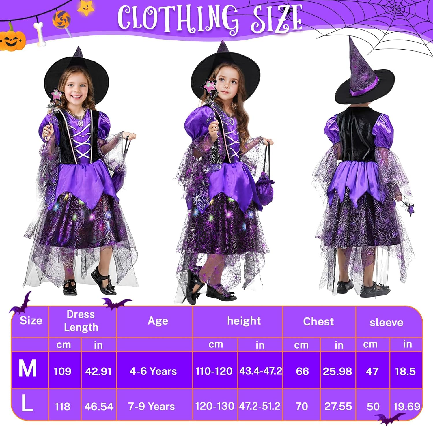 Descrizione prodotto Costume di Halloween per bambini, costume da strega, costume da strega, costume di carnevale per bambini, adatto per Halloween, giochi di ruolo da strega, feste a tema e giochi di tutti i giorni Specifiche del prodotto: - Nome del prodotto: abito luminoso da streg - Materiale: poliestere. - Batterie: 3 LR44. Nota: 1. Il vestito luminoso non è impermeabile. Evitare di bagnarsi o di indossarlo sotto la pioggia per compromettere l'effetto luminoso. 2. Si consiglia di indossare l'abito solo sotto la supervisione di un adulto per garantire comfort e sicurezza ed evitare abusi. nan Per qualsiasi domanda sul nostro vestito da strega luminoso, non esitate a contattarci. Avviso di sicurezza Set di abbigliamento solo per costumi