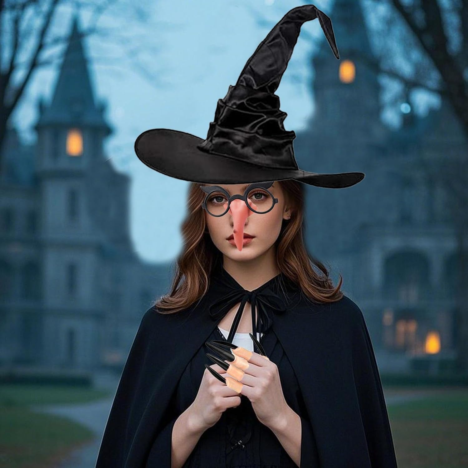 Versatile costume da strega da donna: accessori da strega. Riceverai 1 cappello da strega nero, 1 mantello nero, 1 montatura per occhiali personalizzata e una serie di unghie lunghe, diventerai le persone più abbaglianti della folla e regala un'atmosfera festosa. Include accessori da strega: oltre al mantello unisex, il nostro set include un naso in silicone da strega di alta qualità, guanti da strega e chiodi da strega che completano il tuo aspetto e garantiscono un'impressione indimenticabile. Adatto a tutte le età: questo costume da strega da donna per Halloween è unisex ed è adatto per adulti e ragazzi. La dimensione flessibile del mantello assicura che tutti si sentano a proprio agio e abbiano un aspetto fantastico. Mantello da strega da donna. Materiale di alta qualità: il nostro mantello nero in morbido tessuto di raso, costume da donna per Halloween dona al vostro costume di Halloween un tocco elegante e misterioso. Strega di Halloween Indossa il nostro mantello e cappello da strega,per esplorare il misterioso mondo delle streghe. Ideale per cosplay e mascherata: trasformati nella strega perfetta con il nostro costume da strega completo da donna di Halloween. Che si tratti di un carnevale, una mascherata o un evento cosplay, questo costume attirerà tutti gli sguardi su di te!